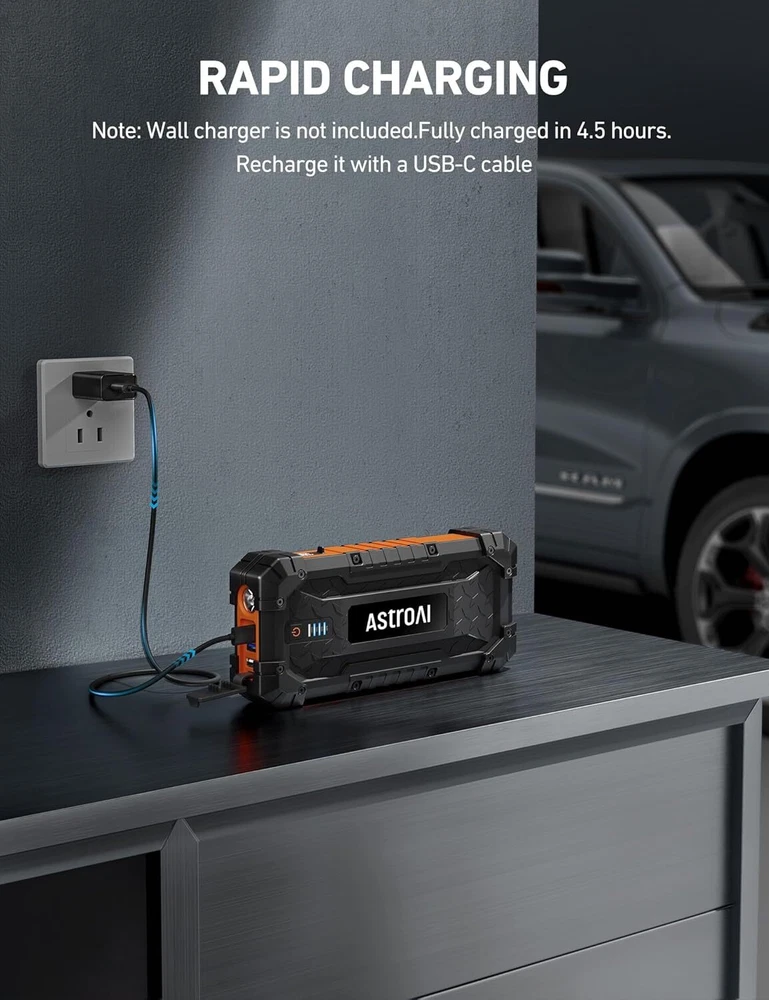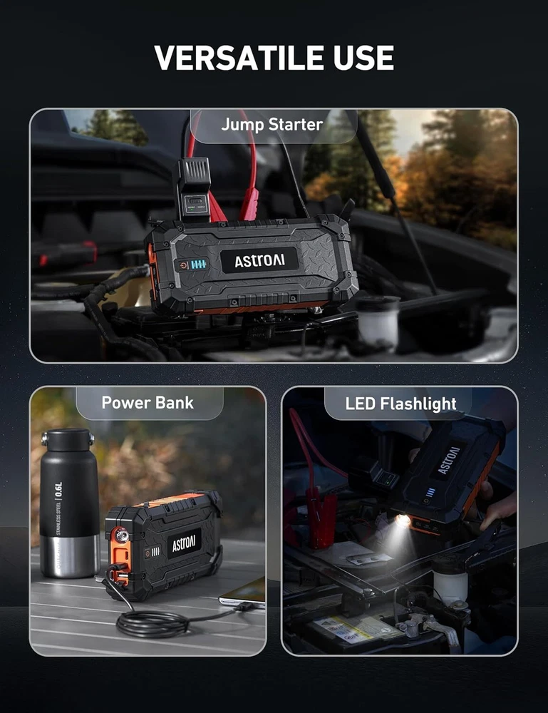 AstroAI S8 Ultra Battery Jumper Starter Portable, 4000A Car Jump Orange Product Details Brand: AstroAI Product Dimensions: 5.24"D x 10.31"W x 4.29"H Item Weight: 2.1 Pounds Amperage: 4000 Amps Peak Output Current: 4000 Amps Specification Met: IP65 Manufacturer: AstroAI Item Weight: 2.13 pounds Batteries: 1 Lithium Polymer batteries required. (included) Manufacturer Part Number: S8 Ultra Brand: AstroAI Product Dimensions: 5.24"D x 10.31"W x 4.29"H Item Weight: 2.1 Pounds Amperage: 4000 Amps Peak Output Current: 4000 Amps Battery Cell CompositionVoltage: Lithium Ion12 Volts Vehicle Service TypeBattery Capacity: All of the above24000 Milliamp Hours ULTRA POWERFUL JUMP STARTING: The S8 Ultra car jumper starter portable features a powerful 4000 A current and a 24000 mAh battery capacity, along with a 45 C discharge rate. It can boost up to 10 L gas and 8 L diesel engines, even when fully drained. EASY TO USE: This car jump starter includes smart jumper cables with intuitive indicators, providing a safe and seamless user experience. The car starter automatically analyzes the battery’s voltage to deliver the appropriate boost. For batteries at 9-12 V, it will automatically jumpstart them after the jumper cable is connected. When the batteries are below 9 V, the S8 Ultra will prompt you to press the Boost Button, quickly jump starting fully-drained batteries. SUPERSAFE 12V JUMP BOX: The S8 Ultra car battery jump starter provides 10 comprehensive safeties, including reverse polarity, overcurrent, reverse connection, overvoltage, overcharge, overdischarge, overload, short circuit, low/high-temperature protection, and spark-resistance. It is also waterproof (IP 65), dust-proof, and drop-proof. WIDE COMPATIBILITY PORTABLE CHARGER: Equipped with multiple ports (5 V/9 V/12 V output USB-A port, 5 V/2.4 A output USB-A port, Type-C in/out port, 15 V DC port), this jump starter is a versatile power bank that charges various electronic devices and powers DC car accessories. Power anything from car vacuum cleaners to cellphones with the S8 Ultra Jump Starter. CAREFULLY-CRAFTED DESIGNS: The jump starter battery pack was carefully designed to make jump starting vehicles an efficient and safe process. The smart battery indicators ensure ease of use while its high-quality internals ensure powerful performance. ROADSIDE CAR EMERGENCY KIT: The AstroAI S8 Ultra portable car jump starter can pack a punch, reviving cars in less than a minute, using as a safe and reliable tool to help you take risks. A built-in integrated flashlight can makes nighttime operation easy with its 3 light modes.
