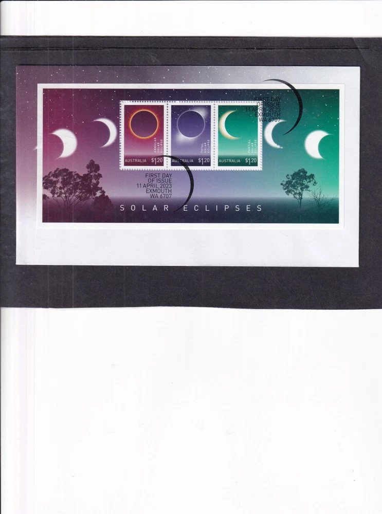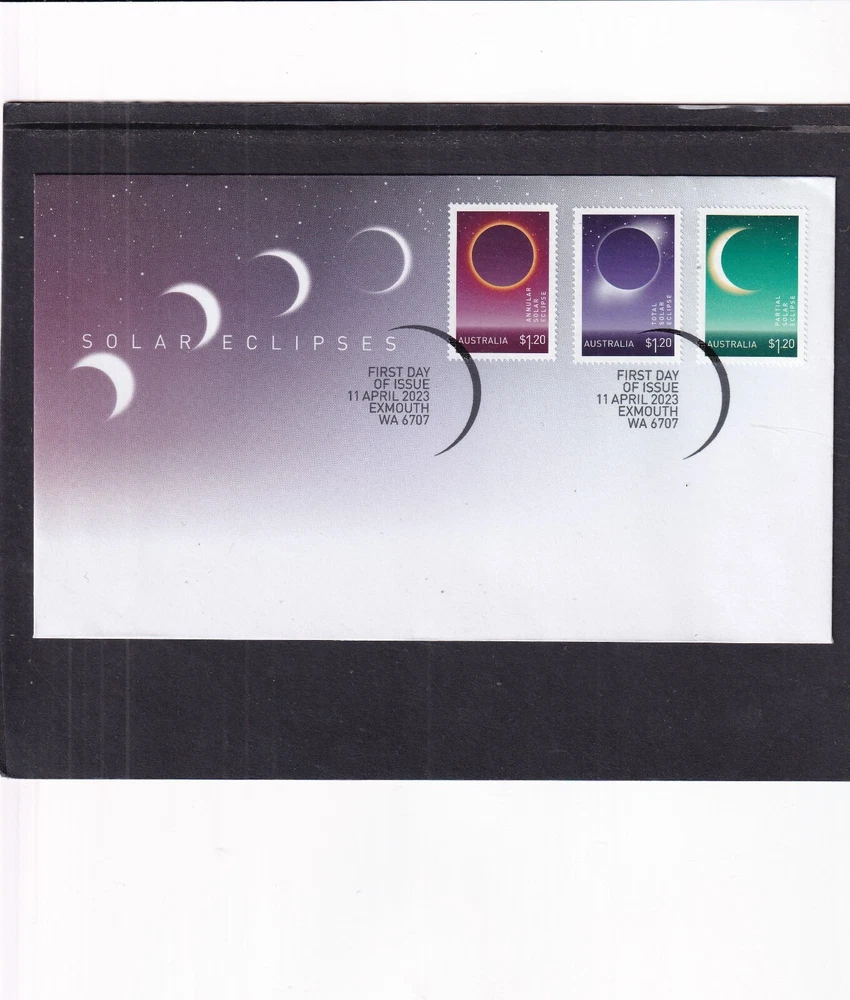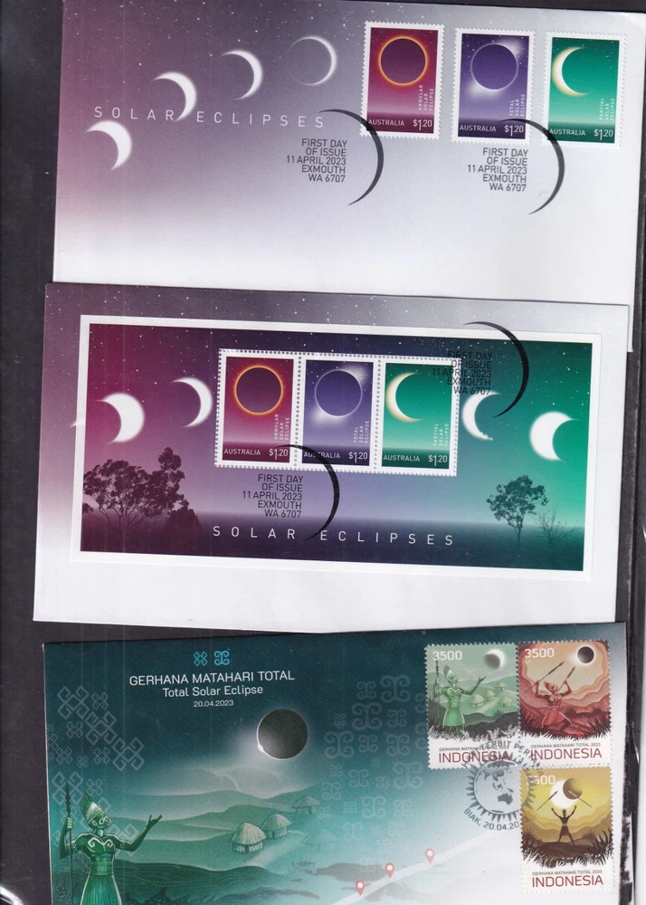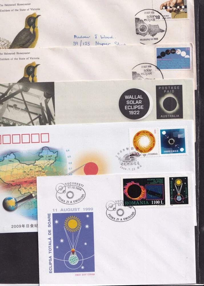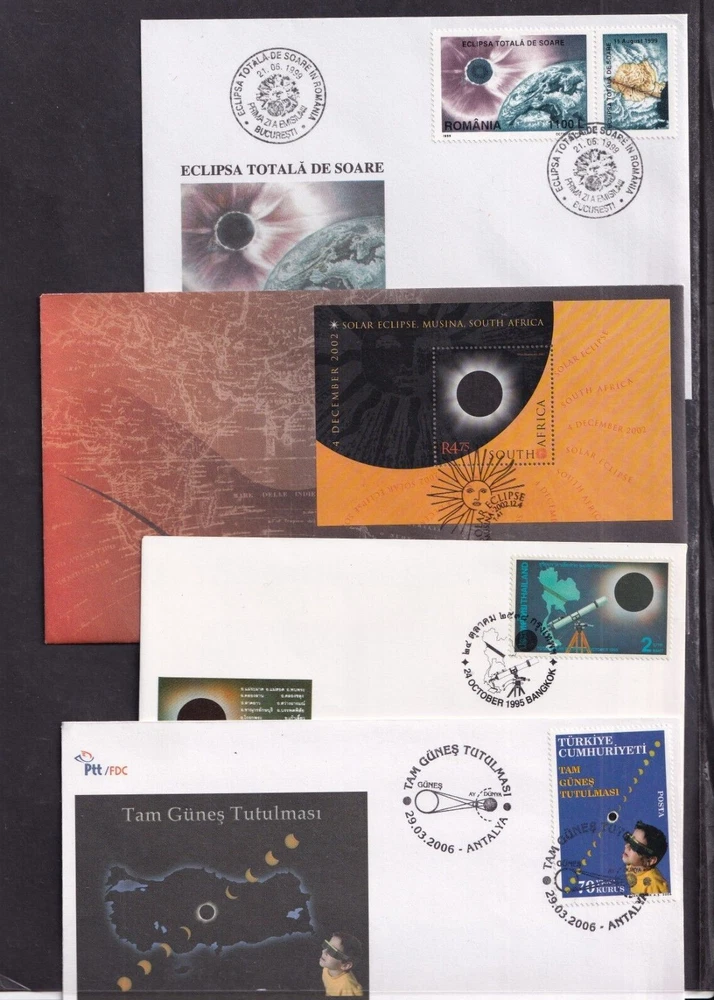 Astronomy Eclipse solar lunar FDC First Day Cover, unaddressed unless otherwise stated 1. Alderney 27.04.1999 Total Eclipse FDC 2. Alderney 27.04.1999 Total Eclipse Presentation Pack 3. Alderney 27.04.1999 Total Eclipse fine used 4, Ascension 28.10.2004 Lunar Eclipse stamps FDC 5, Ascension 28.10.2004 Lunar Eclipse stamp + label FDC 6. Australia 23.10.1976 Solar Eclipse Melbourne special pmk, hand written address (1) 7. Australia 23.10.1976 Solar Eclipse Melbourne special pmk, hand written address (2) 8. Australia 2022 Wallal Solar Eclipse pictorial pre=stamped envelope PSE mint unused 9. China 22.07.2009 Solar Eclipse commemorative envelope, special pmk 10. Romania 17.12.1998 Total Eclipse of Sun FDC 11. Romania 21.06.1999 Total Eclipse of the Sun FDC 12. South Africa 12.04.2002 Solar Eclipse MS FDC 13. Thailand 24.10.1995 Total Solar Eclipse FDC 14. Turkey 29.03.2006 Solar Eclipse FDC 15. Australia 11.04.2023 Solar Eclipse stamps FDC 16. Australia 11.04.2023 Solar Eclipse MS FDC 17. Indonesia 20.04.2023 Solar Eclipse FDC If you make multiple purchases please wait for invoice to ensure you are not over charged on postage