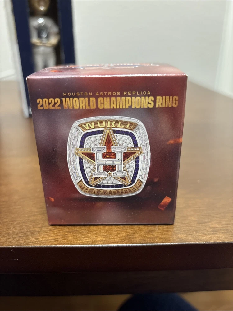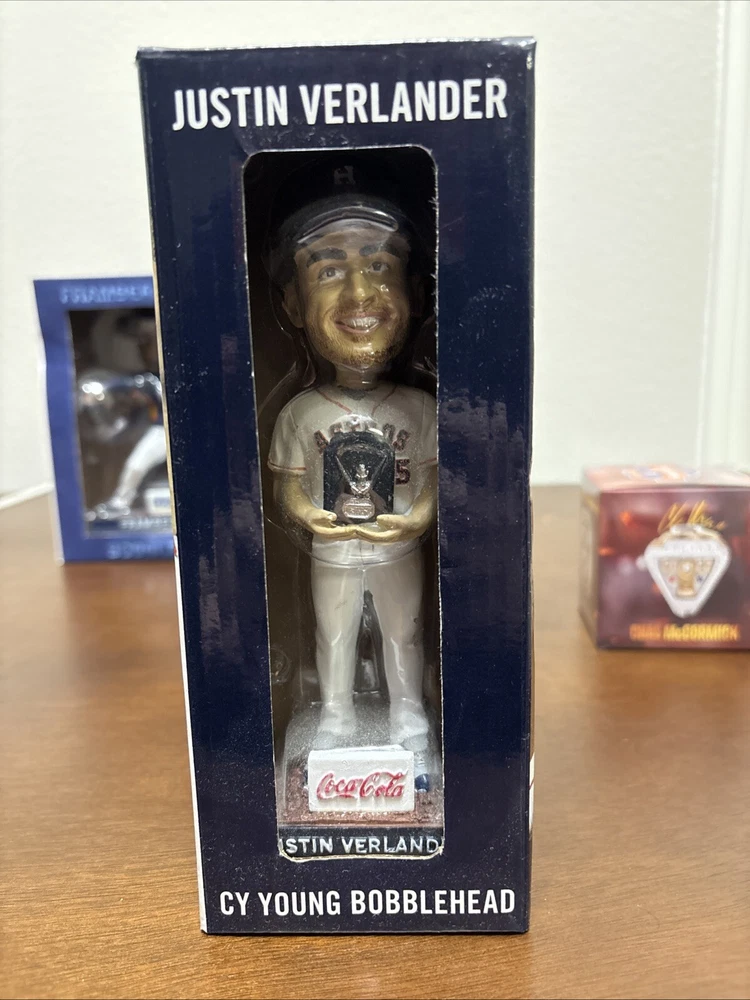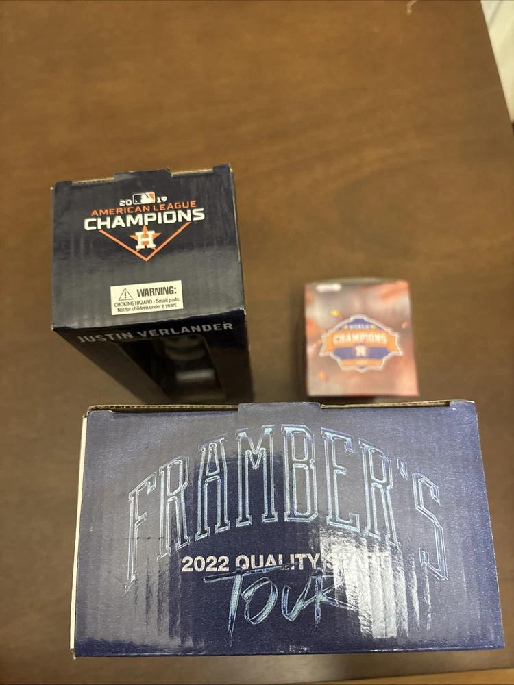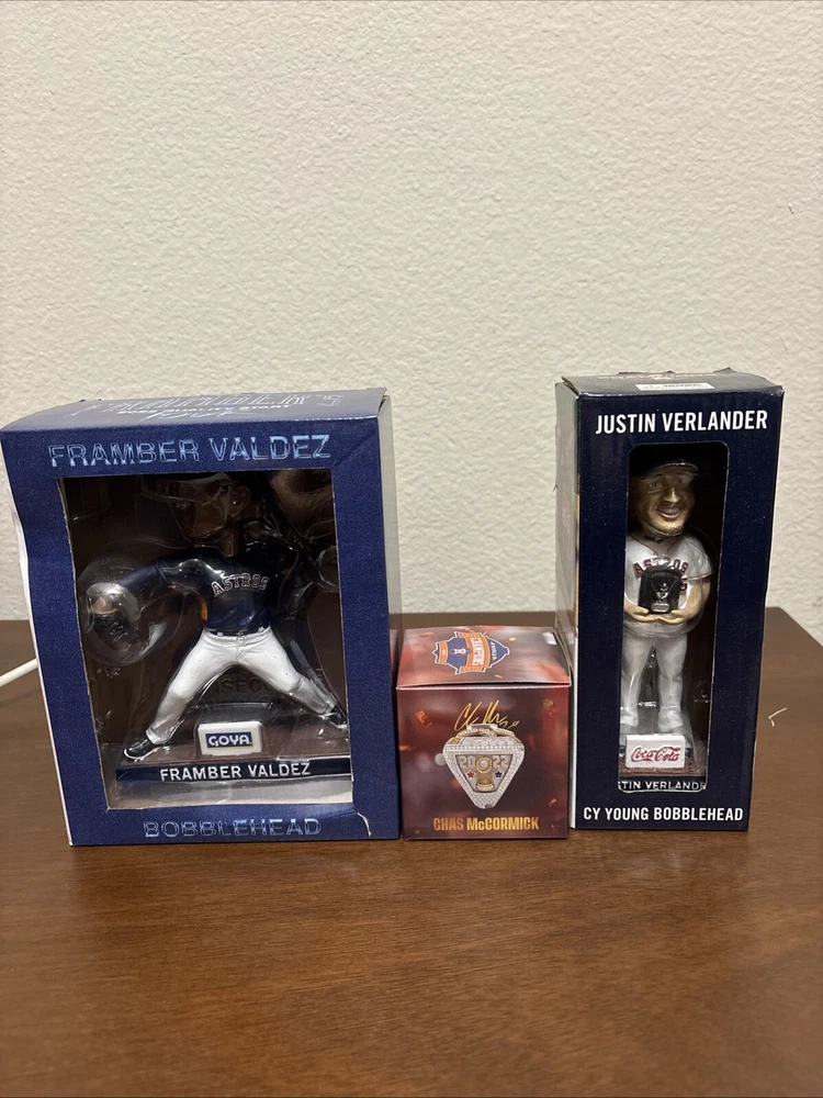 Astros memorabilia lot including 2022 World Series ring replica (Chas McCormick), Justin Verlander 2019 Cy Young bobblehead, and Framber Valdez 2022 Quality Start bobblehead. All packages are unopened and in original packaging.