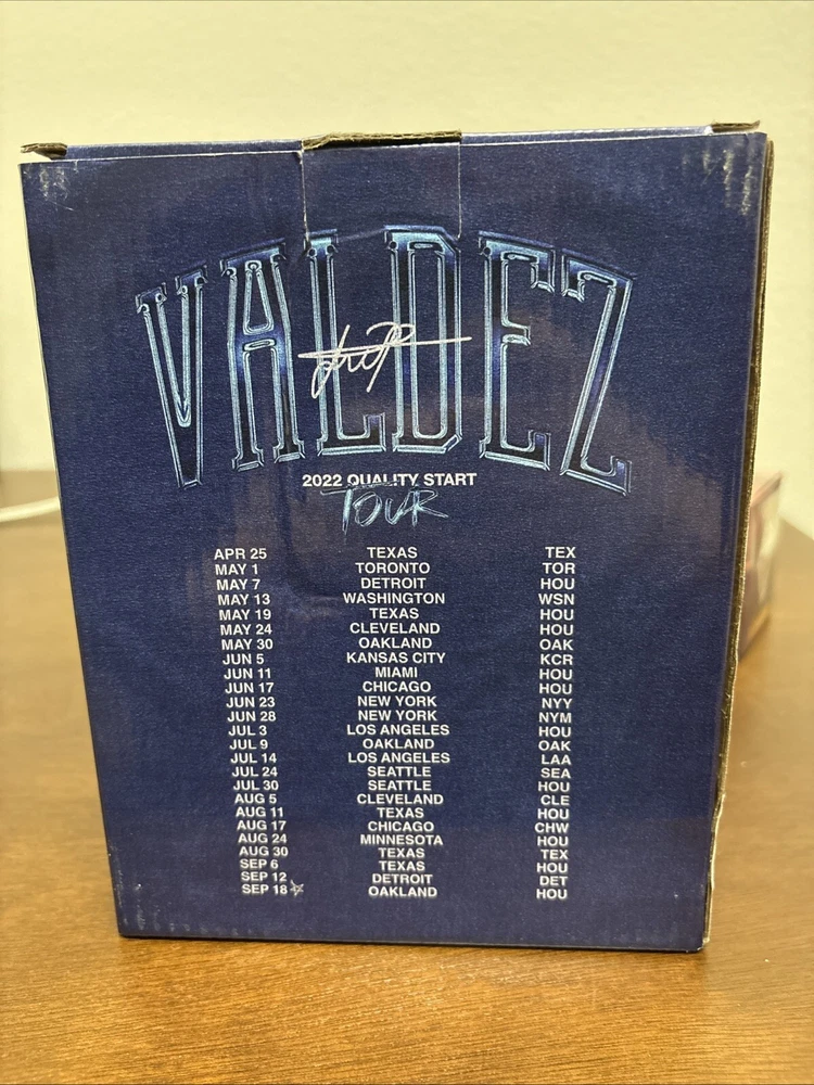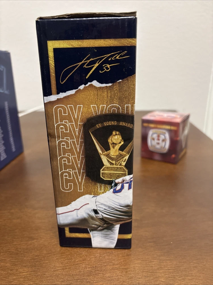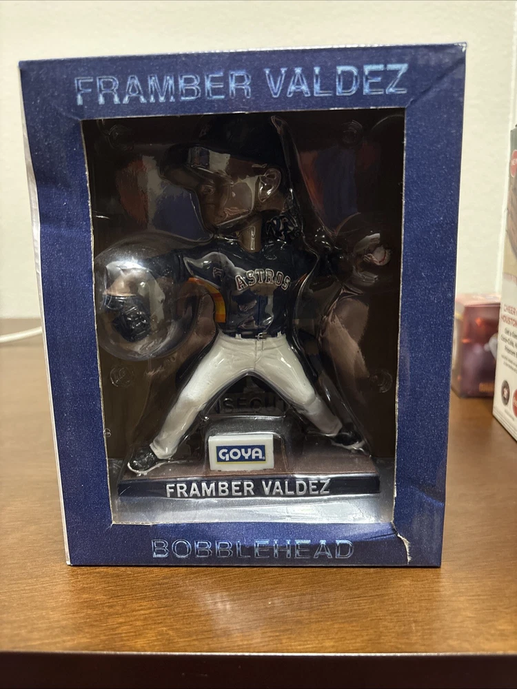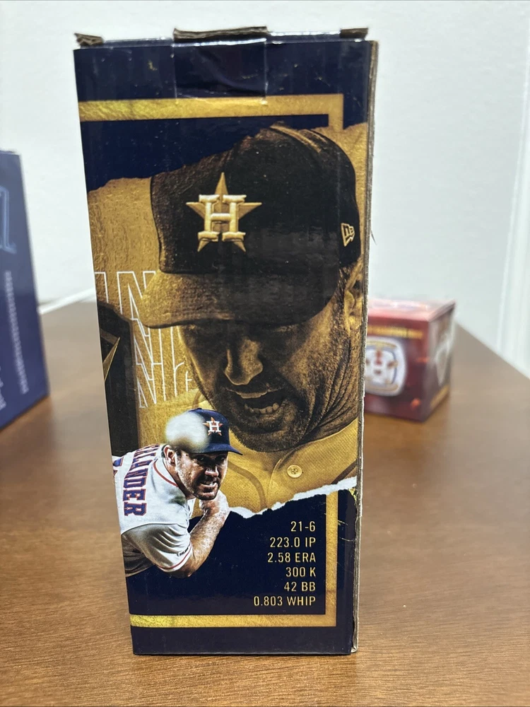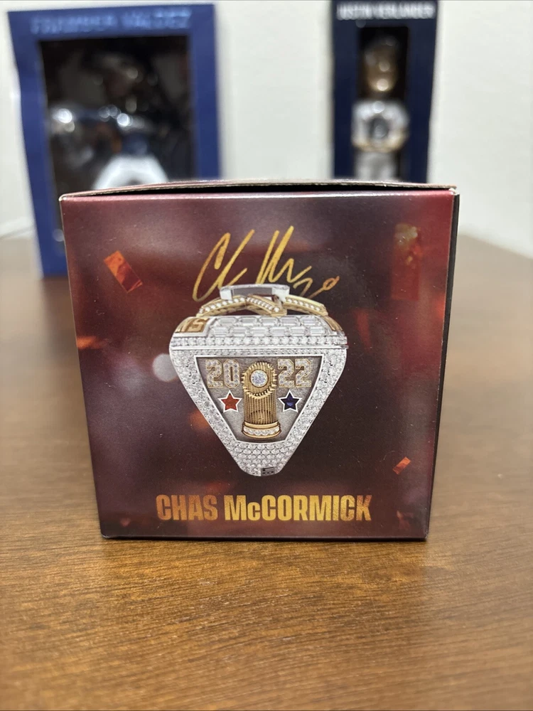 Astros memorabilia lot including 2022 World Series ring replica (Chas McCormick), Justin Verlander 2019 Cy Young bobblehead, and Framber Valdez 2022 Quality Start bobblehead. All packages are unopened and in original packaging.