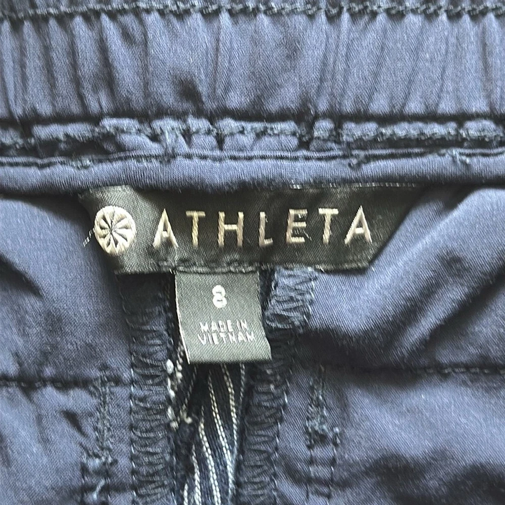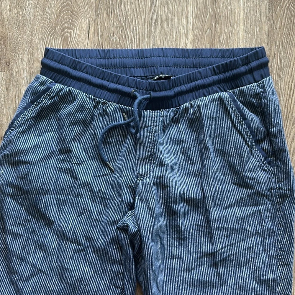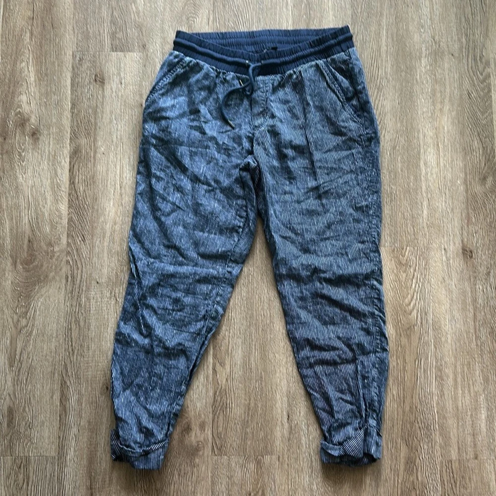 Excellent condition, gently worn Size: 8 Inseam: 25" Color: Blue & White Striped - Pull on - 100% Linen - Two front & back pockets - Cuffed at ankle - Elastic waist - Functional drawstring - Semi fitted - Mid rise