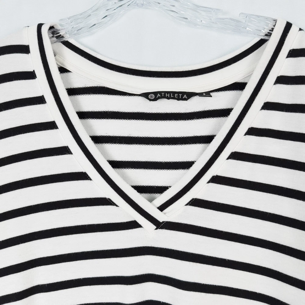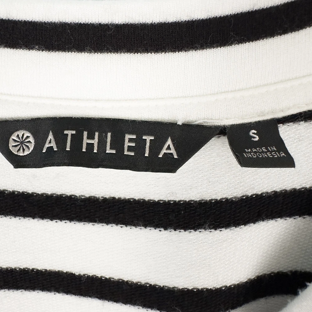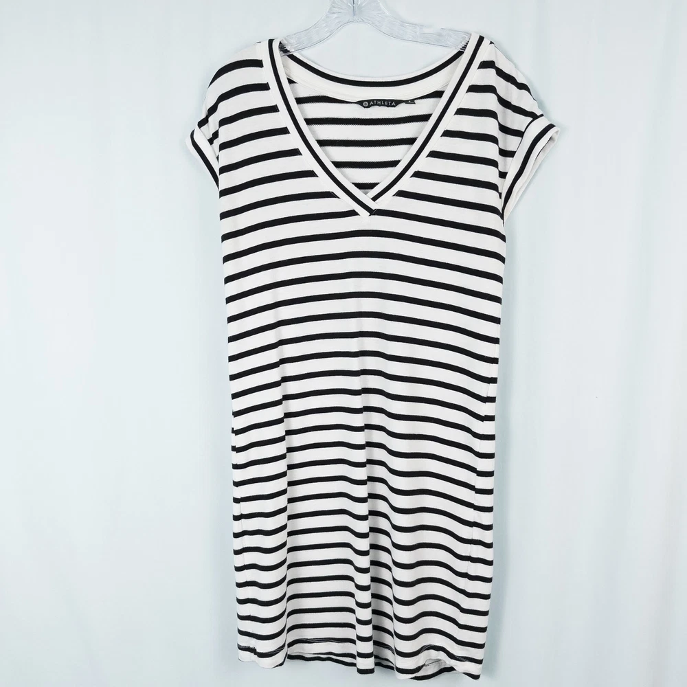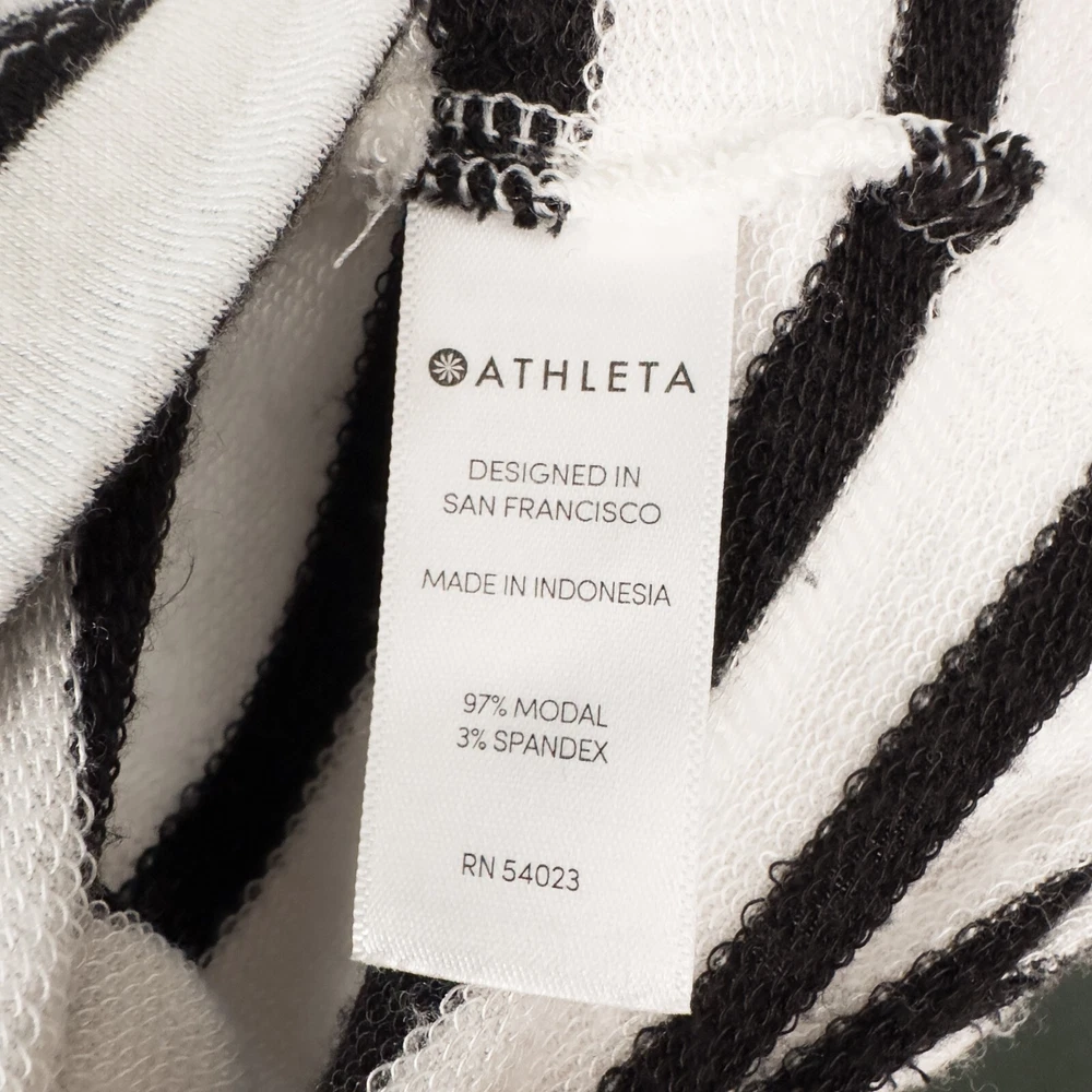 Athleta Newport Sweatshirt Dress * Condition: Good pre-owned condition. There are no pockets on this dress. I'm not sure if it is a sample piece or if it was altered. No stains or holes. Please see photos. * Size: Small * All measurements are approximate and taken lying flat. Please see photos as well. * Chest: 18” pit to pit * Length: 34” from shoulder to hem * Color/Pattern: Black and White Striped * Material: 97% Modal, 3% Spandex * Super soft and cozy material * Stretchy * V-Neck * Mini to knee length * Short rolled cap sleeves * Style: 210926-00 * Machine Washable All of my items are stored in a smoke-free, dog-friendly home.
