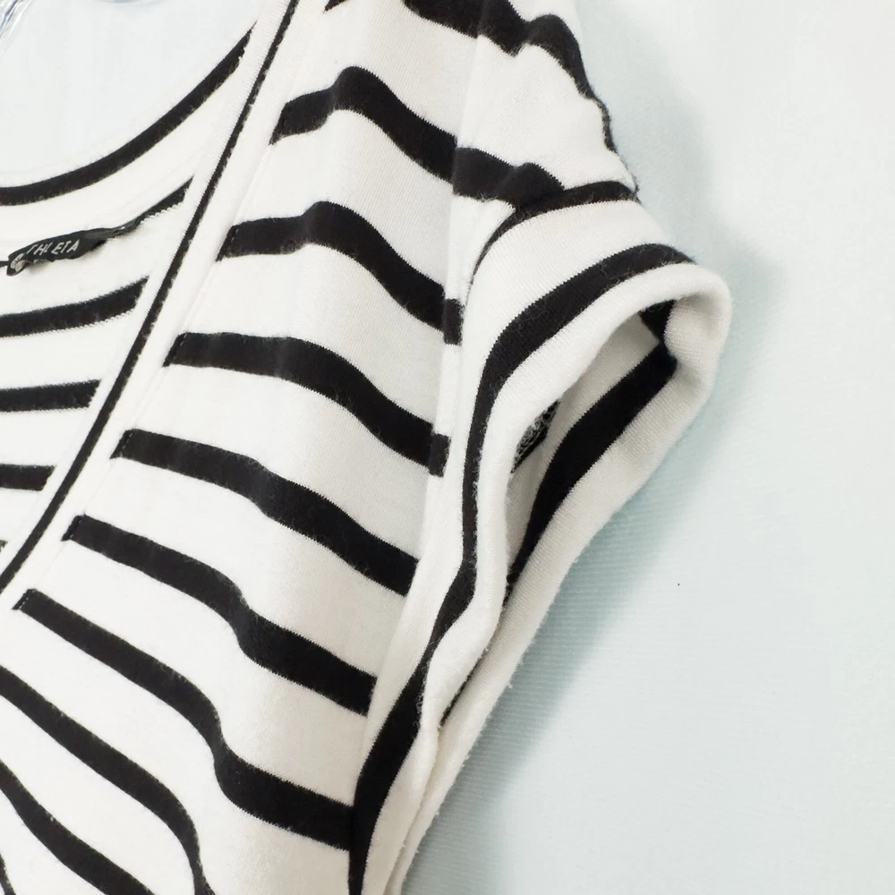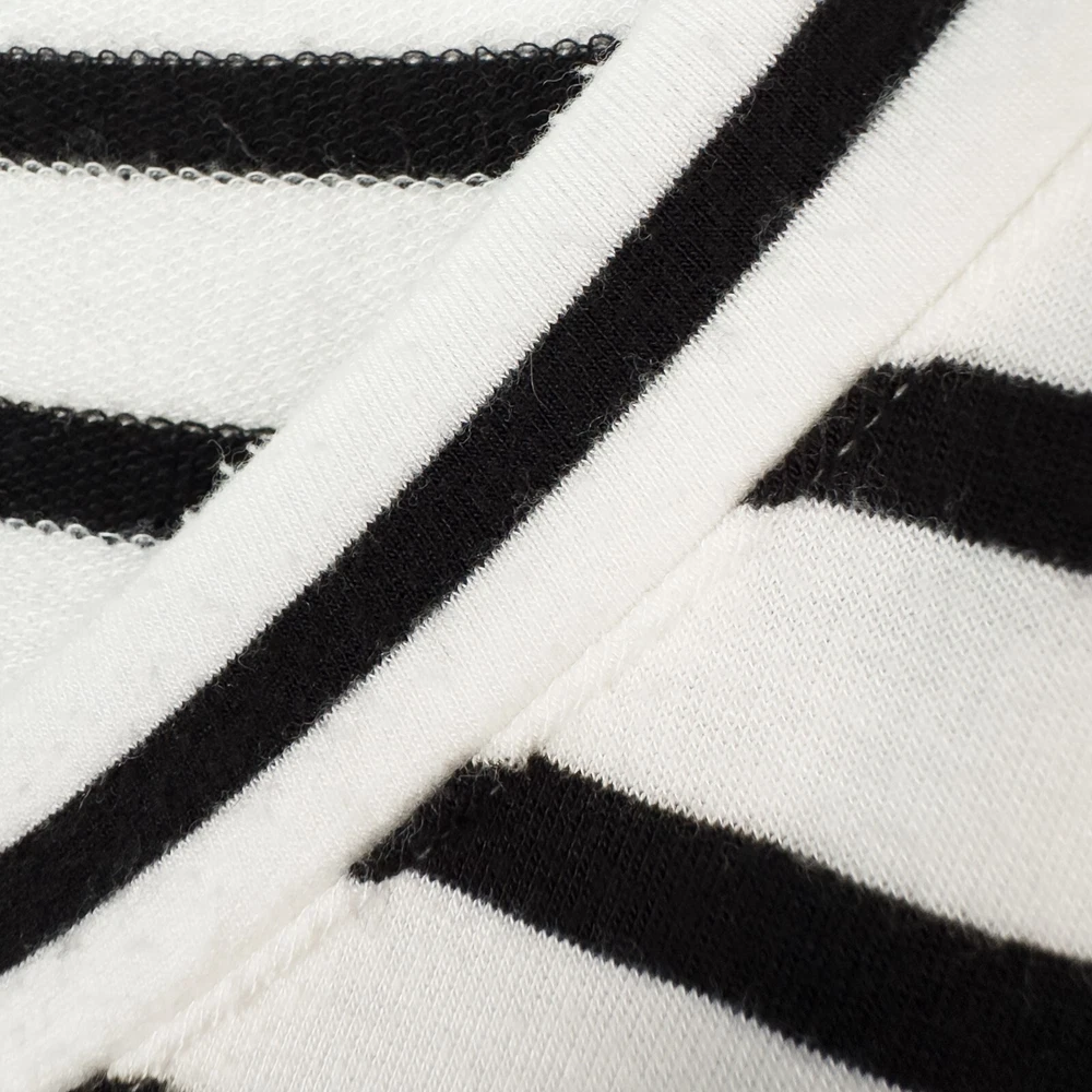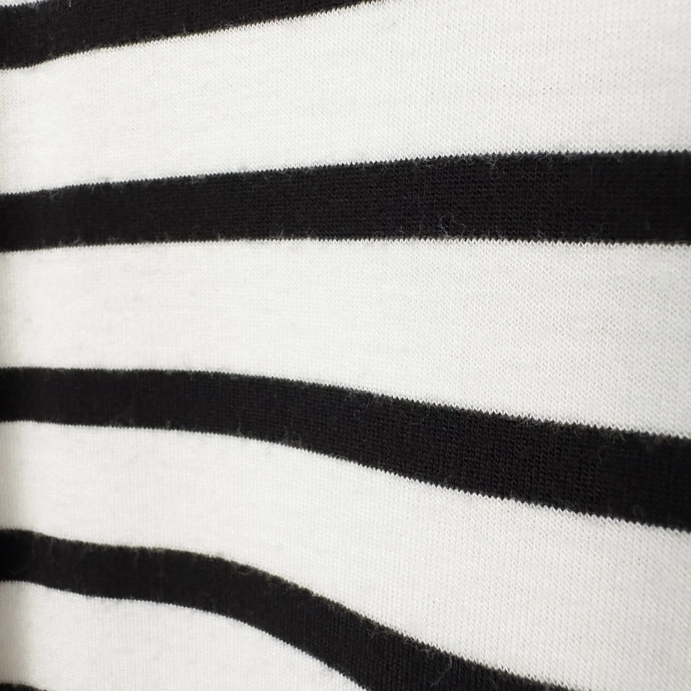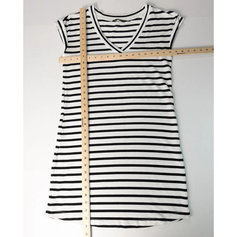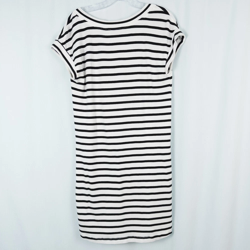 Athleta Newport Sweatshirt Dress * Condition: Good pre-owned condition. There are no pockets on this dress. I'm not sure if it is a sample piece or if it was altered. No stains or holes. Please see photos. * Size: Small * All measurements are approximate and taken lying flat. Please see photos as well. * Chest: 18” pit to pit * Length: 34” from shoulder to hem * Color/Pattern: Black and White Striped * Material: 97% Modal, 3% Spandex * Super soft and cozy material * Stretchy * V-Neck * Mini to knee length * Short rolled cap sleeves * Style: 210926-00 * Machine Washable All of my items are stored in a smoke-free, dog-friendly home.