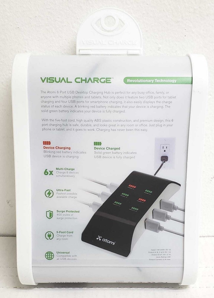Atomi Visual Charge 6 Port USB Desktop Charging Hub With Indicator # AT790 Brand New, Factory Sealed Description Charge all of your devices at once with this Atomi desktop charging hub. Six USB ports let you connect your smartphones, tablets and other devices, and the 5-foot cord offers flexible placement options. Boasting 400 joules of surge protection, this Atomi desktop charging hub can stay plugged in for whenever you need it. Features Multi-Charge Charge 6 devices simultaneously. Ultra-Fast Charging So your devices are always ready-to-go. 5-Foot Cord Conveniently charge from any room. Surge Protected 400 joules of surge protection. Universal Compatible with all USB-powered devices.