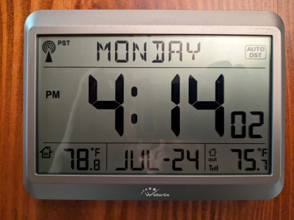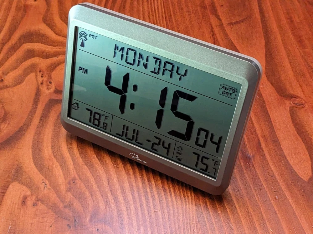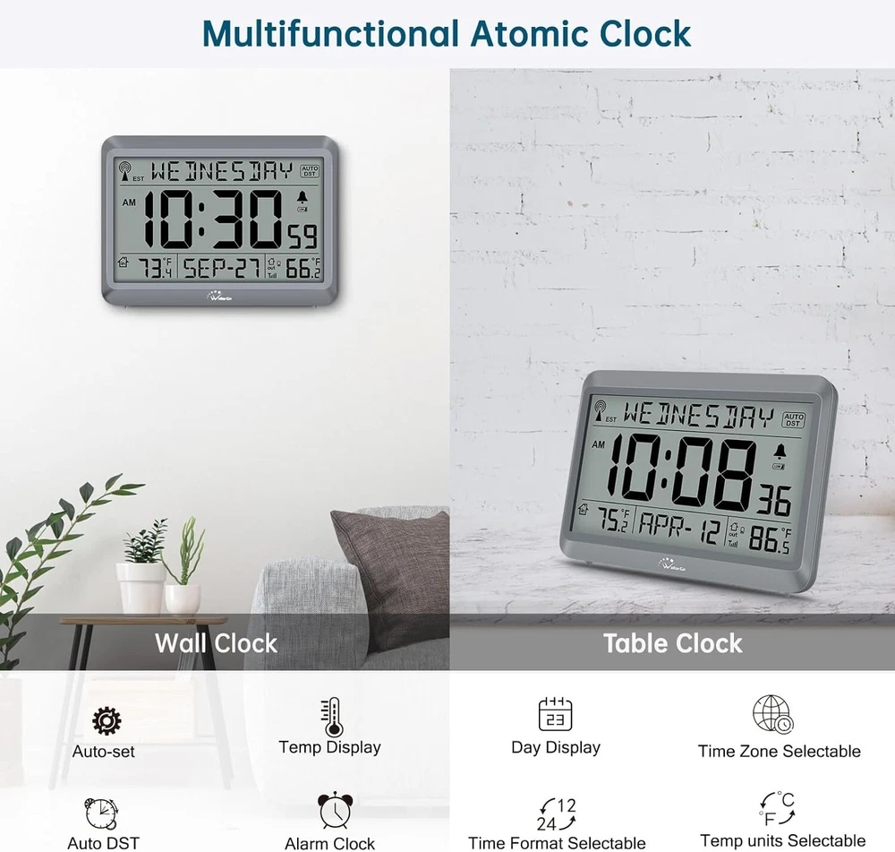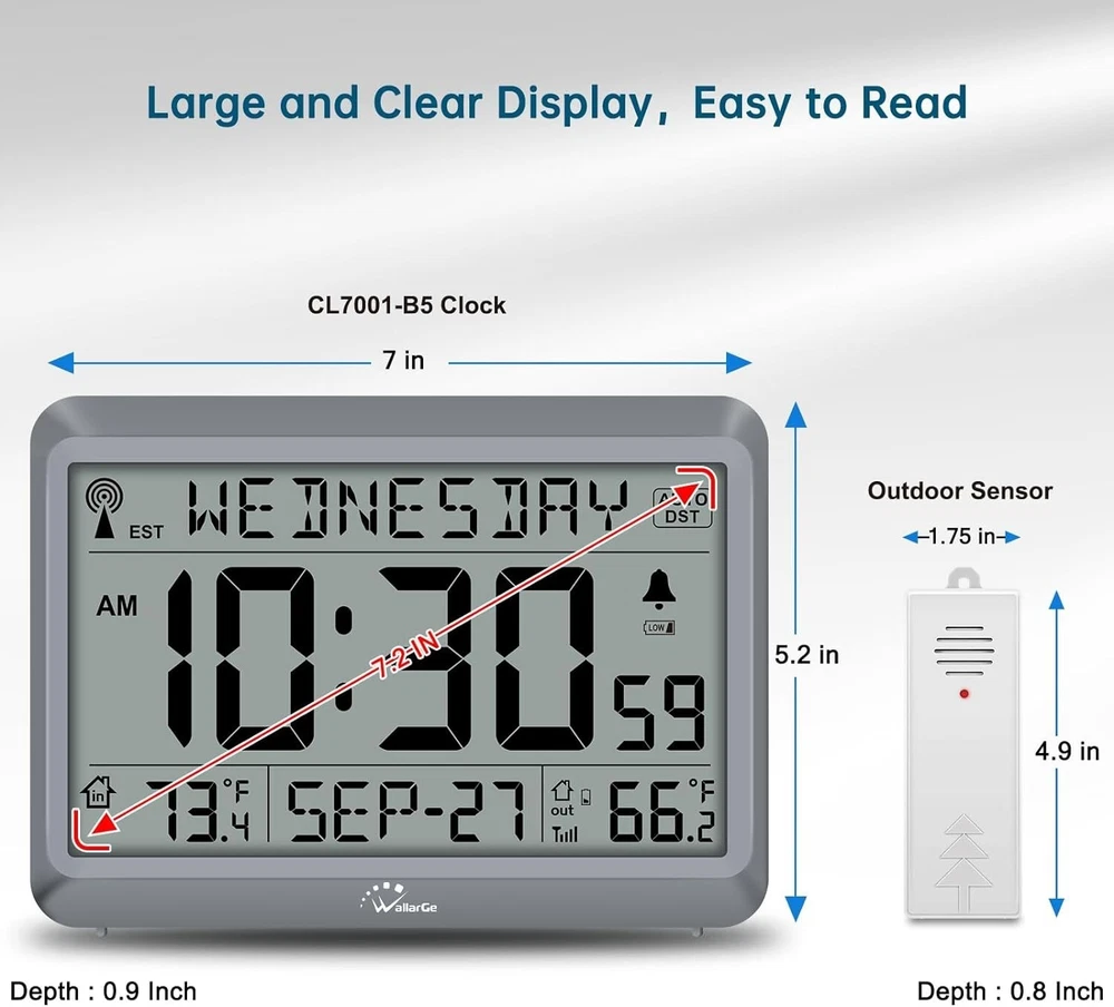 About this item ๐๐ฐ๐ฐ๐๐ฟ๐ฎ๐๐ฒ ๐๐๐ผ๐บ๐ถ๐ฐ ๐๐น๐ผ๐ฐ๐ธ - The atomic clock has a built-in receiver that automatically synchronizes itself with the WWVB radio broadcast, which will update time automatically every midnight to ensure accurate time. It has 4 time zones: EST, CST, MST, PST. ๐๐๐ผ๐บ๐ถ๐ฐ ๐๐น๐ผ๐ฐ๐ธ ๐๐ถ๐๐ต ๐๐ป๐ฑ๐ผ๐ผ๐ฟ ๐ฎ๐ป๐ฑ ๐ข๐๐๐ฑ๐ผ๐ผ๐ฟ ๐ง๐ฒ๐บ๐ฝ๐ฒ๐ฟ๐ฎ๐๐๐ฟ๐ฒ - This atomic clock can display both indoor and outdoor temperature, helps you better manage your daily life. The wireless outdoor sensor monitors and transmits the outdoor temperature to the clock to display. The sensor should be placed within 330 feet and out of direct sunlight or rain. ๐๐ถ๐ด๐ถ๐๐ฎ๐น ๐๐น๐ฎ๐ฟ๐บ ๐๐น๐ผ๐ฐ๐ธ ๐๐ฎ๐๐๐ฒ๐ฟ๐ ๐ข๐ฝ๐ฒ๐ฟ๐ฎ๐๐ฒ๐ฑ - The clock is supported by 3 x AAA battery and outdoor sensor is supported by 2 x AA battery. (Batteries are not included). When batteries of clock or sensor are running low, there would be a low battery symbol appearing on screen and blinking, reminding you to replace new batteries in time. ๐๐ฎ๐ฟ๐ด๐ฒ ๐๐ถ๐๐ฝ๐น๐ฎ๐ ๐๐ถ๐๐ต ๐ง๐ฒ๐บ๐ฝ๐ฒ๐ฟ๐ฎ๐๐๐ฟ๐ฒ, ๐๐ฎ๐ ๐ฎ๐ป๐ฑ ๐๐ฎ๐๐ฒ - Two temperature modes switchable (Celsius and Fahrenheit). When click button, both indoor and outdoor temperature exchange mode at the same time. There are also two display modes of time selectable: Standard Time and Military Time. ๐๐จ๐ง๐ข ๐๐ฆ๐ง ๐ฎ๐ป๐ฑ ๐๐น๐ฎ๐ฟ๐บ โ With DST on, clock will go forward or fall back one hour automatically in daylight saving time. When DST or alarm is on, there would be a corresponding icon staying on screen. Both of them could be turned off manually if for no need. Atomic Clock Indoor Outdoor Temperature Self-Setting Digital 4 Time Zones DST Product Description Get Started Quickly 1. Adjust the outdoor temperature link channel of clock and outdoor sensor to be same๏ผlike A-A, B-B, C-C. 2. Install batteries (3xAAA for clock and 2xAA for outdoor sensor) and choose your time zone. 3. Outdoor temperature starts to connect first, once finished, clock starts to search for WWVB signal. 4. Put clock to a place with good signal for better reception and outdoor sensor to a safe place outside within 330feet/100m. 5. Clock updates time automatically when signal received successfully. Tips: In most areas, a signal can only be received at night. If your clock does not receive WWVB signal in daytime, please wait overnight and it will be set in the morning. Outdoor temperature range: -40โ ~ 158โ (-40ยฐC to 70ยฐC). Indoor temperature range: 32โ ~ 122โ (0ยฐC to 50ยฐC). When clicking to change the temp display unit, indoor and outdoor will change simultaneously. The outdoor sensor should be placed within 300ft/100m and out of direct sun light or rain. This atomic is a wall clock and table clock. There are hangging holes on the clock back, you can hang it on wall easily. There is also a folding stan on the back, so it can also be used as a desk clock. Previous page Return Policy: We offer a 30 day return policy from the receiving date. Please contact us for a Return Label. Please use our return label provided by us because it will go back to our supplier. Feedback: Your satisfaction is very important to us! If you have any problem with your order, please contact us and we will do our very best to make you satisfied. As long as you are happy with your purchase, please leave a positive feedback for us. We will always leave you a positive feedback in return. If you have any problem with your purchase, please do not leave a negative feedback. Please Contact us ... and your issue will be solved quickly and positively We are a small family-owned business trying to make it, not a huge company that doesn't care ... We will ALWAYS do our best for you