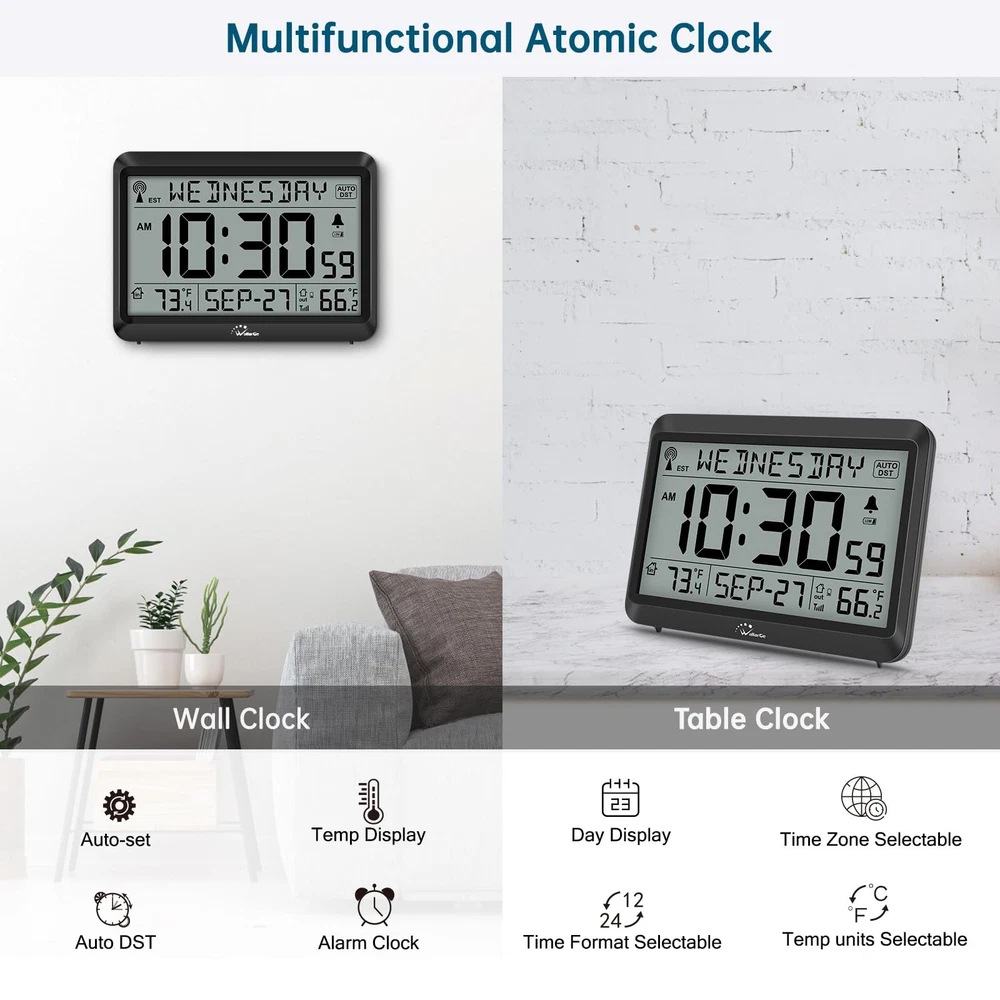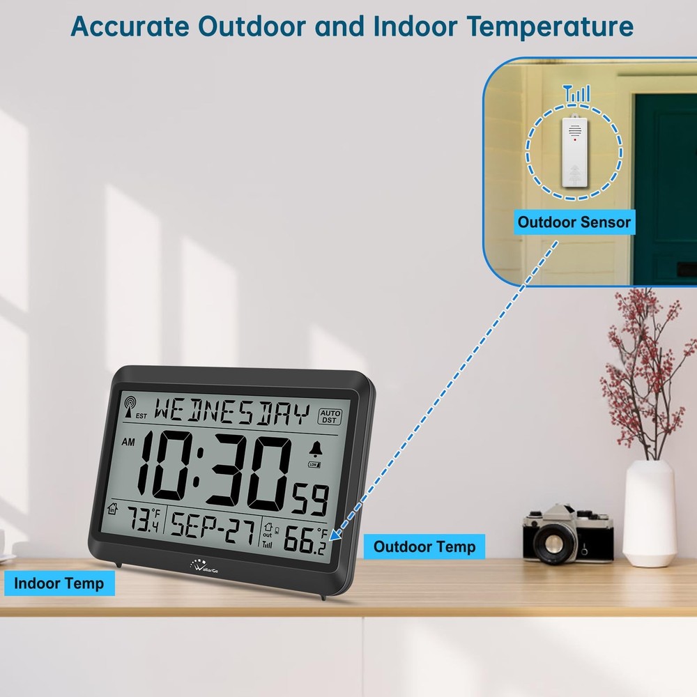 ๐๐ฐ๐ฐ๐๐ฟ๐ฎ๐๐ฒ ๐๐๐ผ๐บ๐ถ๐ฐ ๐๐น๐ผ๐ฐ๐ธ - The atomic clock has a built-in receiver that automatically synchronizes itself with the WWVB radio broadcast, which will update time automatically every midnight to ensure accurate time. It has 4 time zones: EST, CST, MST, PST. ๐๐๐ผ๐บ๐ถ๐ฐ ๐๐น๐ผ๐ฐ๐ธ ๐๐ถ๐๐ต ๐๐ป๐ฑ๐ผ๐ผ๐ฟ ๐ฎ๐ป๐ฑ ๐ข๐๐๐ฑ๐ผ๐ผ๐ฟ ๐ง๐ฒ๐บ๐ฝ๐ฒ๐ฟ๐ฎ๐๐๐ฟ๐ฒ - This atomic clock can display both indoor and outdoor temperature, helps you better manage your daily life. The wireless outdoor monitors and transmits the outdoor temperature to the clock to display. The should be placed within 330 feet and out of direct sunlight or rain. ๐๐ถ๐ด๐ถ๐๐ฎ๐น ๐๐น๐ฎ๐ฟ๐บ ๐๐น๐ผ๐ฐ๐ธ ๐๐ฎ๐๐๐ฒ๐ฟ๐ ๐ข๐ฝ๐ฒ๐ฟ๐ฎ๐๐ฒ๐ฑ - The clock is supported by 3 x AAA battery and outdoor is supported by 2 x AA battery. (Batteries are not ). When batteries of clock or are running low, there would be a low battery symbol appearing on screen and blinking, reminding you to replace new batteries in time. ๐๐ฎ๐ฟ๐ด๐ฒ ๐๐ถ๐๐ฝ๐น๐ฎ๐ ๐๐ถ๐๐ต ๐ง๐ฒ๐บ๐ฝ๐ฒ๐ฟ๐ฎ๐๐๐ฟ๐ฒ, ๐๐ฎ๐ ๐ฎ๐ป๐ฑ ๐๐ฎ๐๐ฒ - temperature modes switchable (Celsius and Fahrenheit). When click button, both indoor and outdoor temperature exchange mode at the same time. There are also display modes of time selectable: Standard Time and Military Time. ๐๐จ๐ง๐ข ๐๐ฆ๐ง ๐ฎ๐ป๐ฑ ๐๐น๐ฎ๐ฟ๐บ โ With DST on, clock will go forward or fall back hour automatically in daylight saving time. When DST or alarm is on, there would be a corresponding icon staying on screen. Both of them could be turned off manually if for no need.