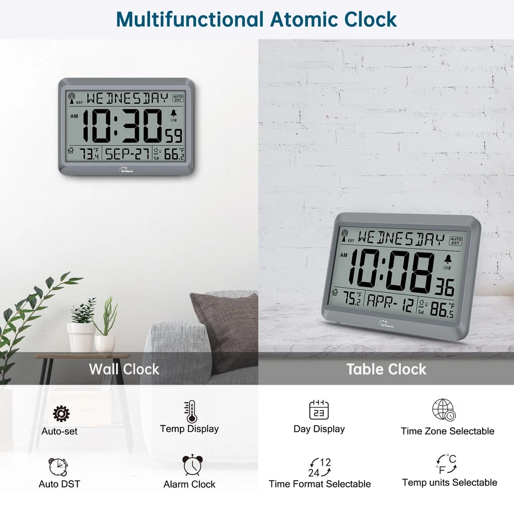 atomic clock with indoor outdoor temperature ๐๐ฐ๐ฐ๐๐ฟ๐ฎ๐๐ฒ ๐๐๐ผ๐บ๐ถ๐ฐ ๐๐น๐ผ๐ฐ๐ธ - The atomic clock has a built-in receiver that automatically synchronizes itself with the WWVB radio broadcast, which will update time automatically every midnight to ensure accurate time. It has 4 time zones: EST, CST, MST, PST. ๐๐๐ผ๐บ๐ถ๐ฐ ๐๐น๐ผ๐ฐ๐ธ ๐๐ถ๐๐ต ๐๐ป๐ฑ๐ผ๐ผ๐ฟ ๐ฎ๐ป๐ฑ ๐ข๐๐๐ฑ๐ผ๐ผ๐ฟ ๐ง๐ฒ๐บ๐ฝ๐ฒ๐ฟ๐ฎ๐๐๐ฟ๐ฒ - This atomic clock can display both indoor and outdoor temperature, helps you better manage your daily life. The wireless outdoor monitors and transmits the outdoor temperature to the clock to display. The should be placed within 330 feet and out of direct sunlight or rain. ๐๐ถ๐ด๐ถ๐๐ฎ๐น ๐๐น๐ฎ๐ฟ๐บ ๐๐น๐ผ๐ฐ๐ธ ๐๐ฎ๐๐๐ฒ๐ฟ๐ ๐ข๐ฝ๐ฒ๐ฟ๐ฎ๐๐ฒ๐ฑ - The clock is supported by 3 x AAA battery and outdoor is supported by 2 x AA battery. (Batteries are not ). When batteries of clock or are running low, there would be a low battery symbol appearing on screen and blinking, reminding you to replace new batteries in time. ๐๐ฎ๐ฟ๐ด๐ฒ ๐๐ถ๐๐ฝ๐น๐ฎ๐ ๐๐ถ๐๐ต ๐ง๐ฒ๐บ๐ฝ๐ฒ๐ฟ๐ฎ๐๐๐ฟ๐ฒ, ๐๐ฎ๐ ๐ฎ๐ป๐ฑ ๐๐ฎ๐๐ฒ - temperature modes switchable (Celsius and Fahrenheit). When click button, both indoor and outdoor temperature exchange mode at the same time. There are also display modes of time selectable: Standard Time and Military Time. ๐๐จ๐ง๐ข ๐๐ฆ๐ง ๐ฎ๐ป๐ฑ ๐๐น๐ฎ๐ฟ๐บ โ With DST on, clock will go forward or fall back hour automatically in daylight saving time. When DST or alarm is on, there would be a corresponding icon staying on screen. Both of them could be turned off manually if for no need.