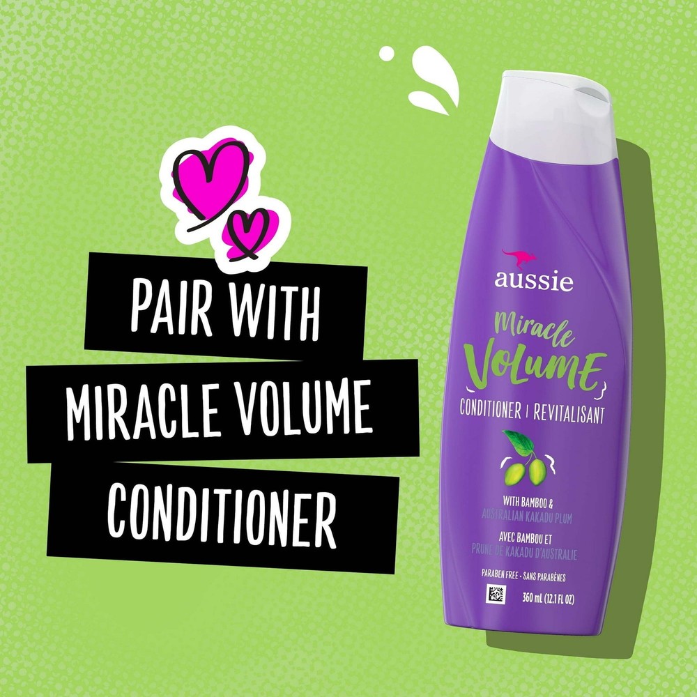 Aussie For Fine Hair, Paraben-free, W/Plum & Bamboo, Miracle Volume Shampoo, 12.1 Ounce (Pack Of 1) Add a little extra oomph to your 'do. Kakadu plum- and bamboo-infused Aussie Miracle Volume Shampoo adds body that gives your hair style lift off. And the scent? Those citrusy bright notes with a hint of florals and ocean are enough to have your head in the clouds. This big body volumizing shampoo, with a touch of Australian Aloe, Jojoba Oil and Sea Kelp, is sure to add some oomph to your do. 24 hour lightweight body. About this item Aussie Miracle moist Shampoo and Conditioner Set Helps moisturize and clean your hair as it soaks your locks in mega-hydration. Infused with avocado and jojoba oil, this amazingly rich shampoo Helps get rid of dull and dry hair leaving you with a delicious scent of luscious citrus. Apply on wet hair and rinse thoroughly. Soft, healthy hair is just a click away. With White Charcoal And Australian Kakadu Plum, Strips Hair Of Build-Up, Paraben Free Perfect for flat hair Infused with Cacadu Plum and bamboo Smells like citrus, floral and aquatic notes Free of parabens & stress The lightweight formula is infused with Cacadu plum and bamboo and easily absorbs into strands for the right amount of softness with over-the-top body. PERFECT FOR flat hair USE IT TO cleanse hair and add height INFUSED WITH Kakadu plum and bamboo SMELLS LIKE citrus, floral and aquatic notes FREE OF parabens & stress Ingredients Water, Sodium Lauryl Sulfate, Sodium Laureth Sulfate, Cocamidopropyl Betaine, Terminalia Ferdinandiana Fruit Extract, Bambusa Vulgaris Shoot Extract, Vitis Vinifera (Grape) Seed Extract, Fragrance/Parfum, Sodium Citrate, Sodium Xylenesulfonate, Sodium Chloride, Citric Acid, Sodium Benzoate, Hydroxypropyl Methylcellulose, Tetrasodium EDTA, Methylchloroisothiazolinone, Methylisothiazolinone, Yellow 5, Red 33.