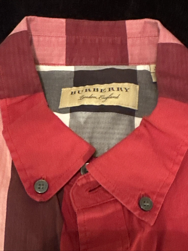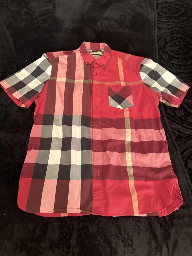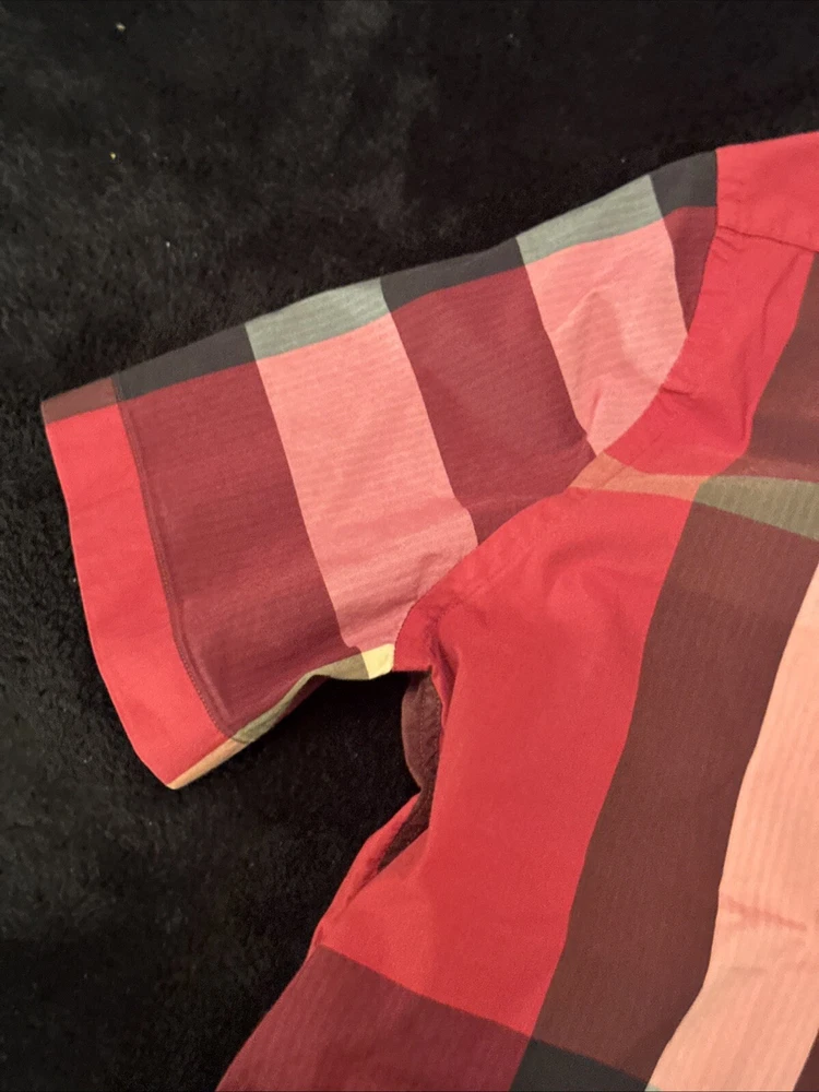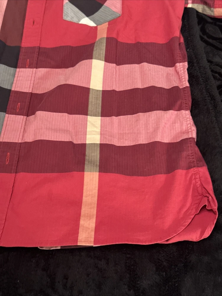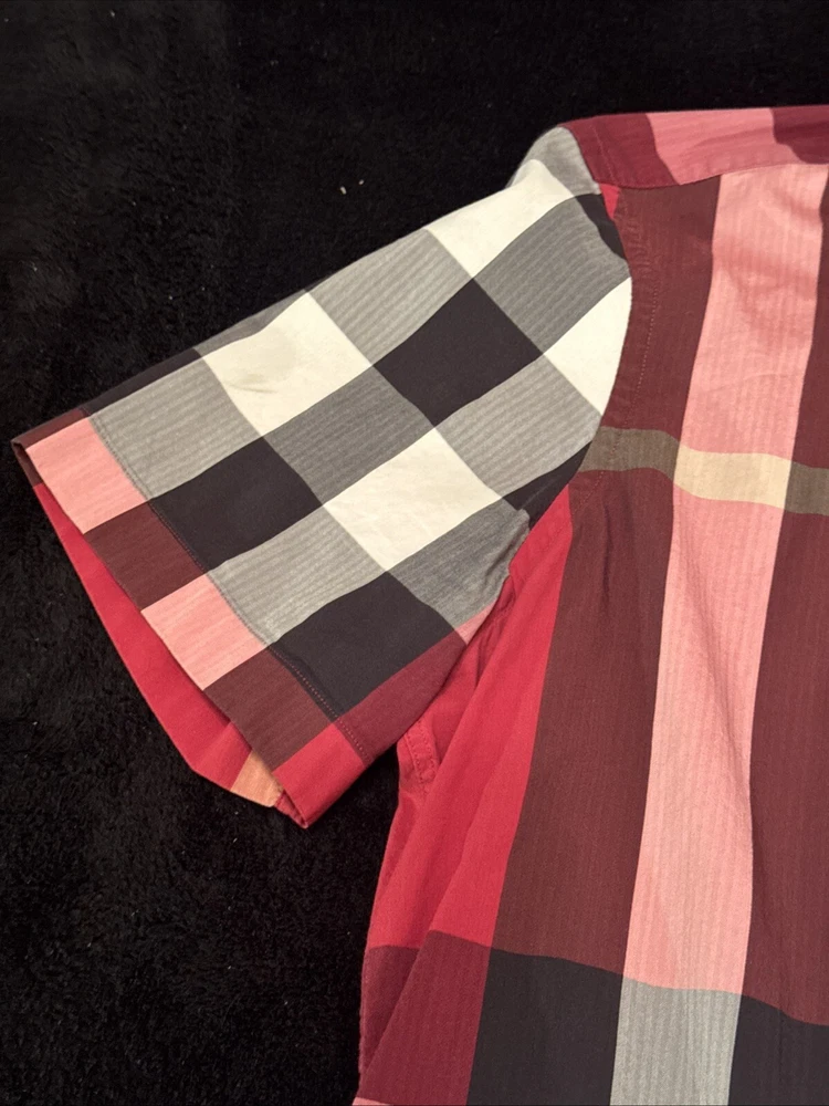 This shirt was bought at Burberry Chicago. Elevate your wardrobe with this authentic Burberry London, England maroon plaid button-down shirt. This shirt features short sleeves, a collared neckline, and a button closure for a classic look. The shirt is made of 100% cotton and has a lightweight, all-season feel. It also includes pockets for added convenience. This designer shirt is perfect for both casual and business occasions. The shirt is a regular fit and is available in size XL. The shirt is part of the Burberry product line and has a classic theme. It is suitable for men and was made in the United States.