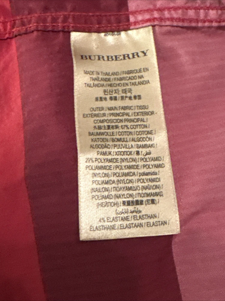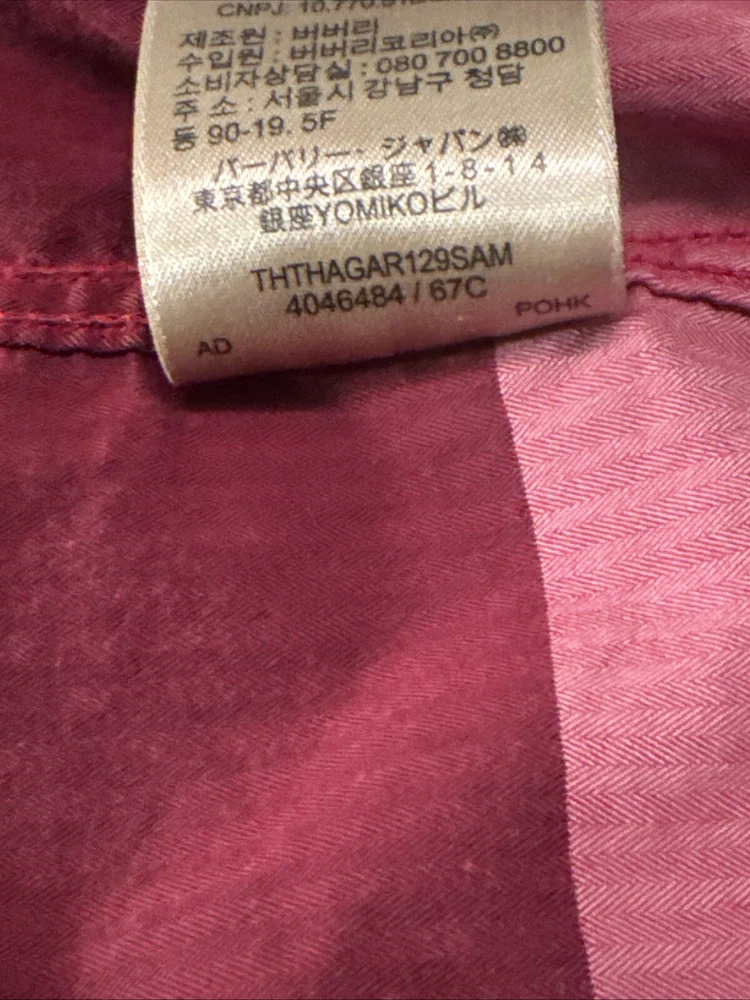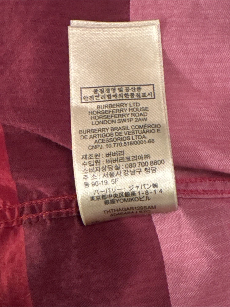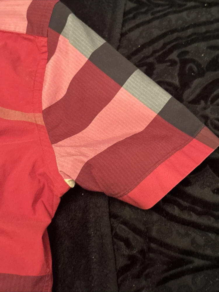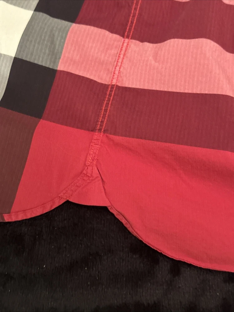 This shirt was bought at Burberry Chicago. Elevate your wardrobe with this authentic Burberry London, England maroon plaid button-down shirt. This shirt features short sleeves, a collared neckline, and a button closure for a classic look. The shirt is made of 100% cotton and has a lightweight, all-season feel. It also includes pockets for added convenience. This designer shirt is perfect for both casual and business occasions. The shirt is a regular fit and is available in size XL. The shirt is part of the Burberry product line and has a classic theme. It is suitable for men and was made in the United States.