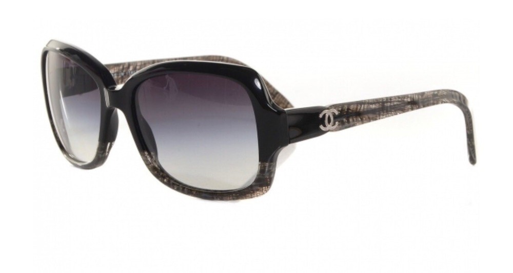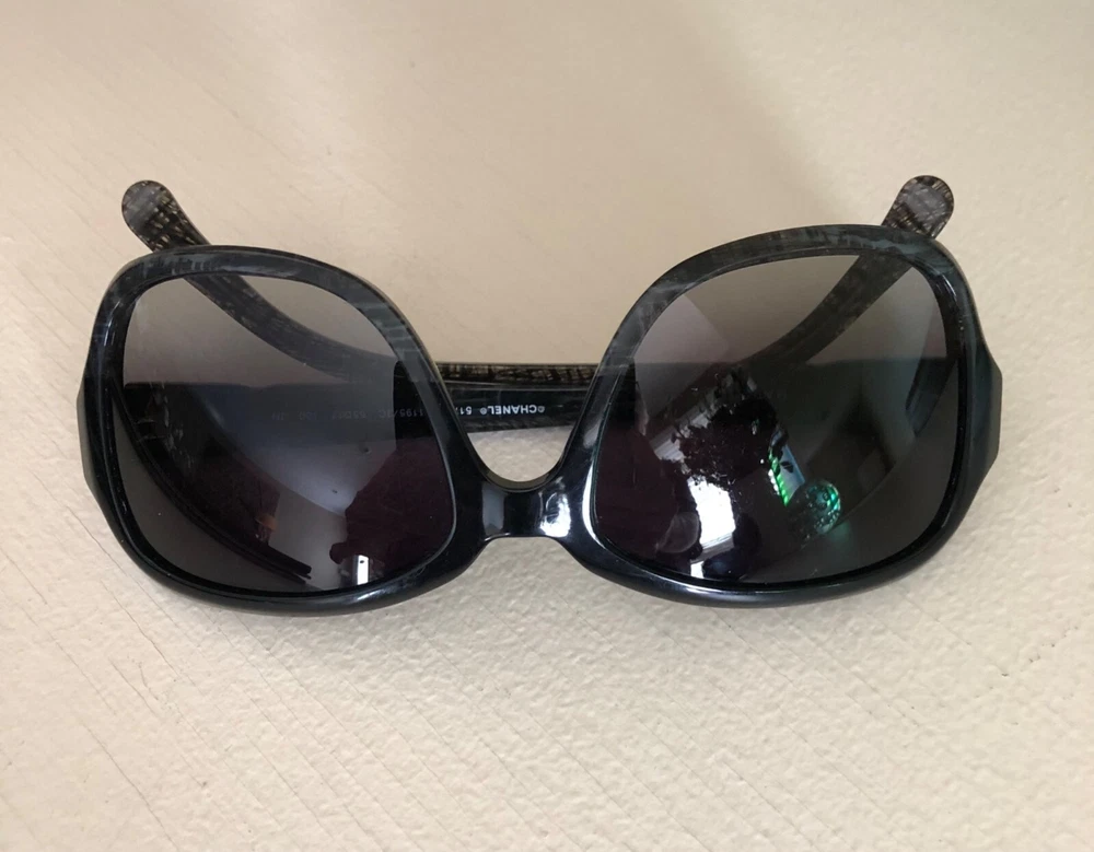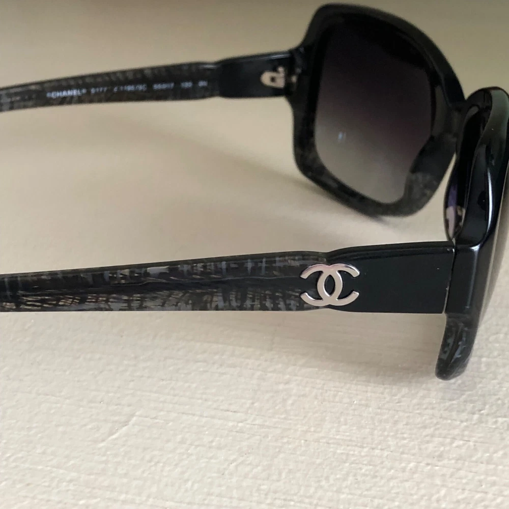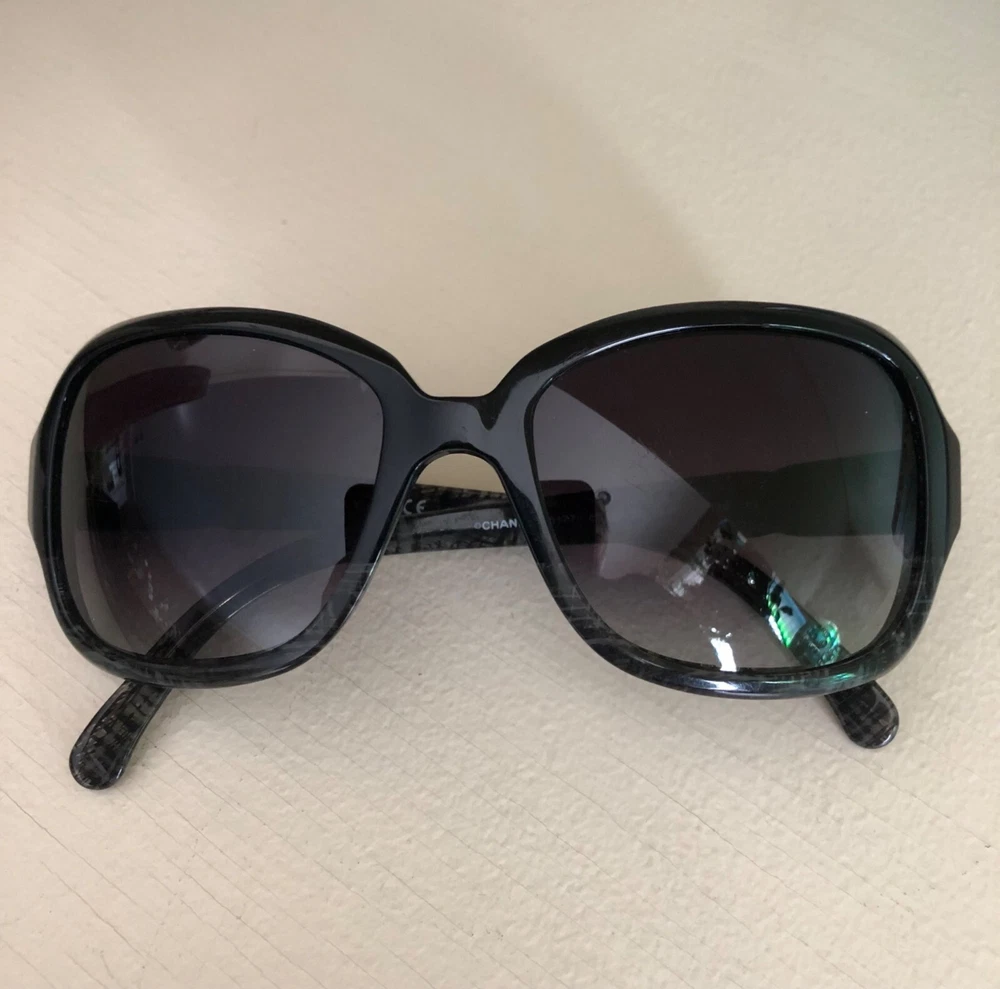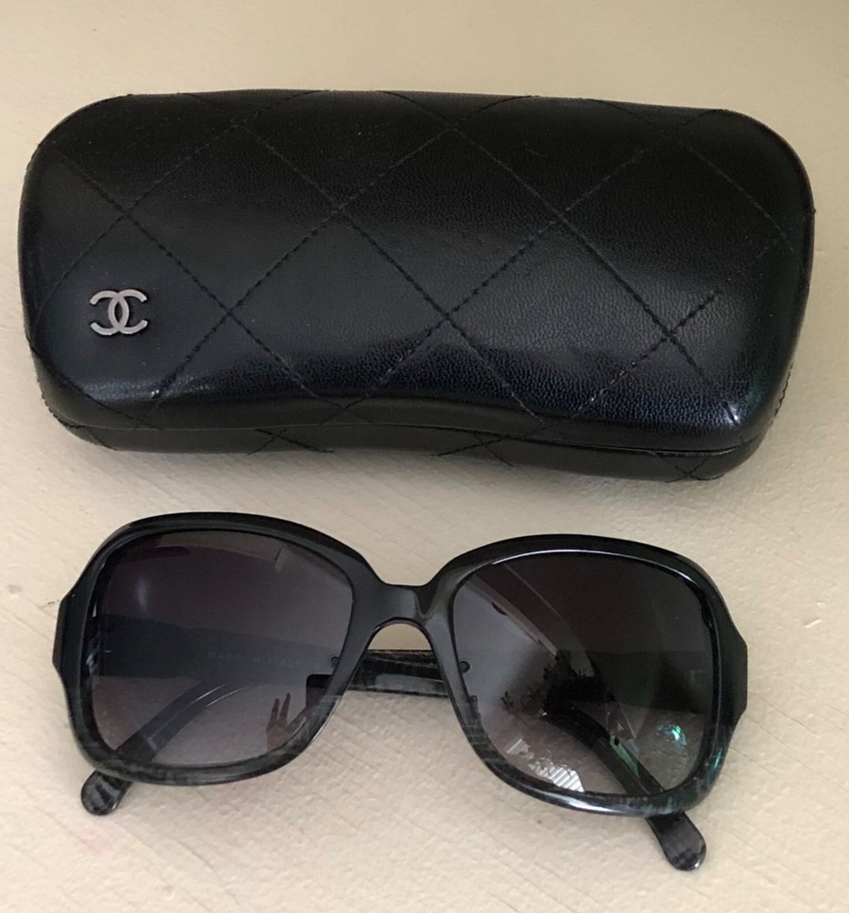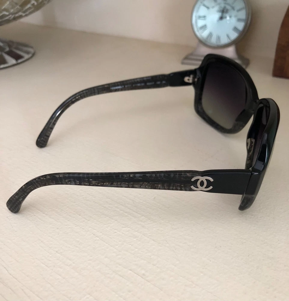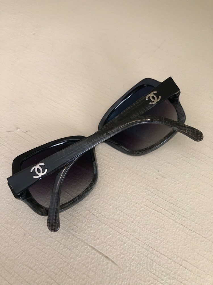 Authentic CHANEL Acetate Tweed Effect Sunglasses 5177 Black with Case 100% Authentic Pre-owned / EXCELLENT CONDITION These ultra-chic sunglasses have a tweed effect engraved in a black frame and polarized lenses with a small silver Chanel CC logo at the hinges. Made in Italy Length: 5.25" Height: 2.00" Width: 5.50"