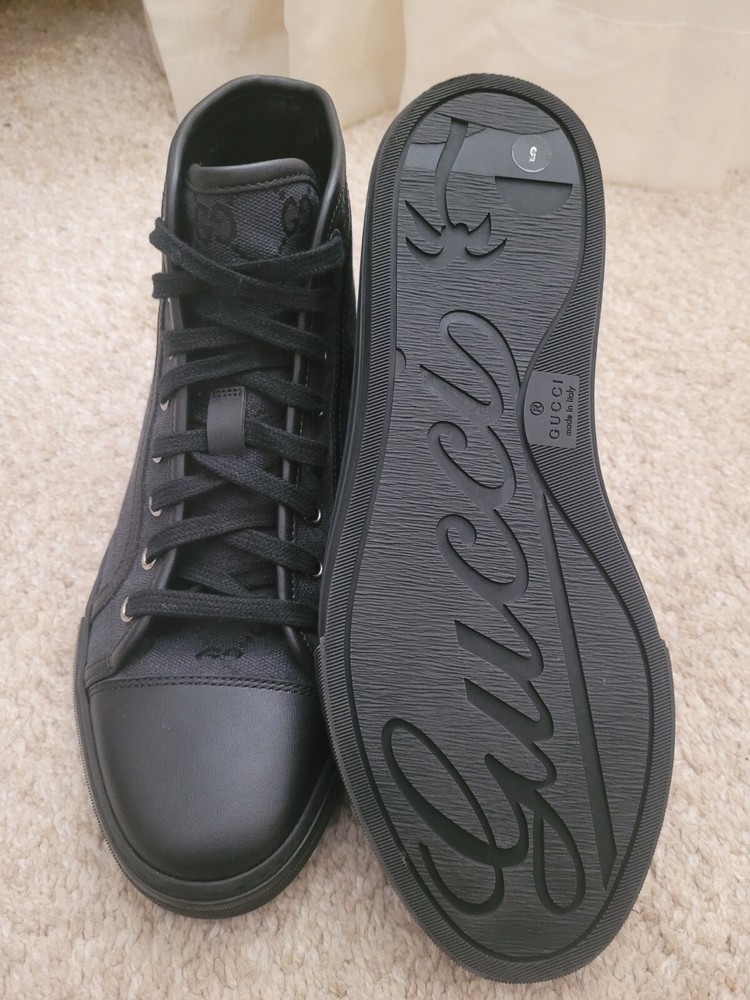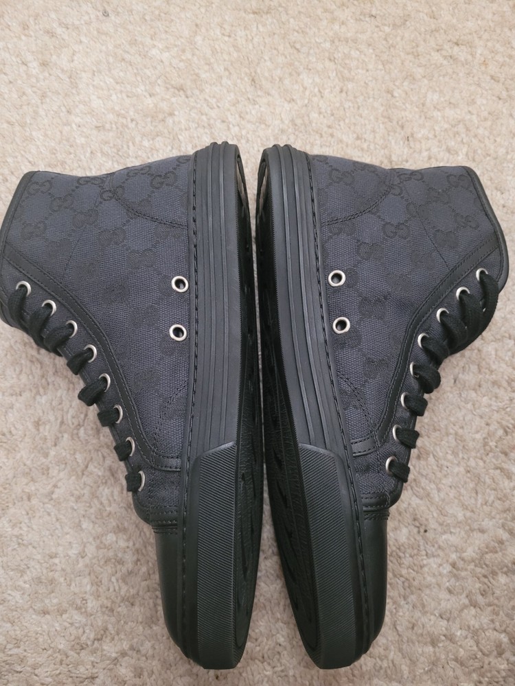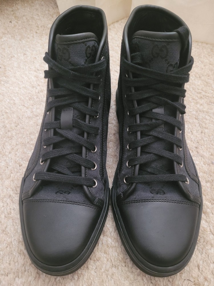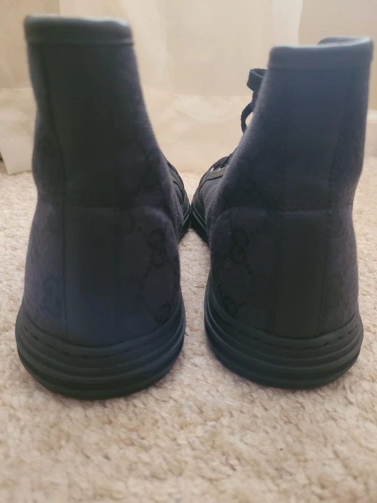 The GUCCI GG Canvas Sneakers for men in black feature the iconic GG logo on the canvas upper, showcasing the brand's signature style. With a style code of 426188 KQWM0 1948, these athletic sneakers are guaranteed to be 100% authentic. The model is designed from high-quality materials, ensuring both durability and fashion-forward appeal. Ideal for casual wear, these GUCCI sneakers are a versatile and stylish addition to any wardrobe. -Gucci Canvas High Top Sneakers -Black -Printed -Leather Trim -Round-Toes -Lace-Up Closure at Uppers