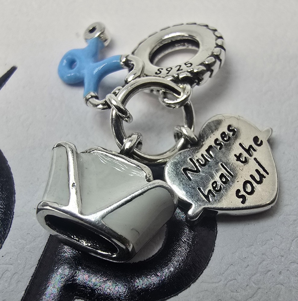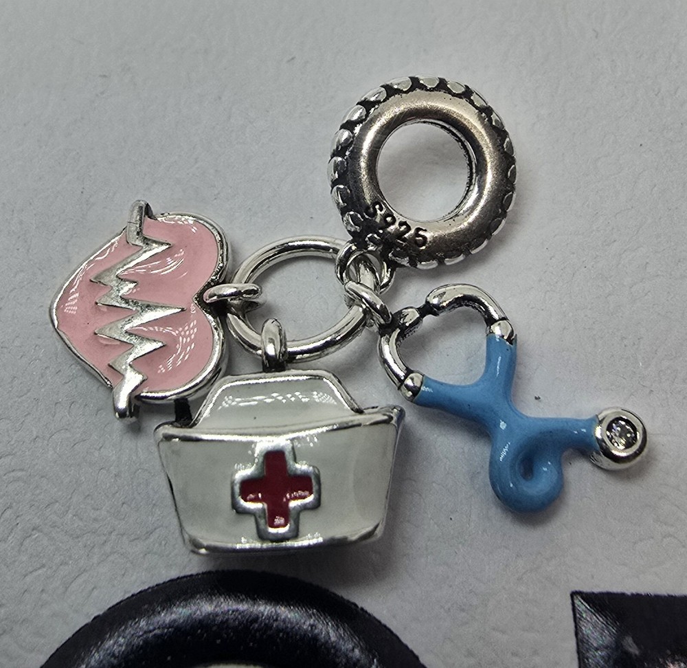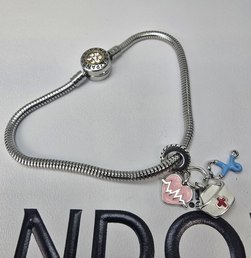 This is an authentic Pandora bracelet featuring a heart, Ferris wheel, love, and handbag charms, along with a nurse charm. The bracelet is silver plated with a snap closure and stackable design. It has a round crystal main stone and is 7.5" in length. The bracelet is from Thailand and is ideal for occasions like engagements, Mother's Day, Christmas, and birthdays.