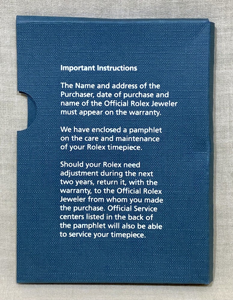 Rolex Genuine Envelope Measure: 9,5 x 13 cm Private Collection ORIGINAL ---------------------------------------------- These products are being sold for Collection purposes ONLY. I am Member of WTA since 1998 I am not affiliated with Rolex . I am not an official Rolex Dealer Questions : Please ask us all the questions you have before bidding. ------------------------------------------------- We sell products that might have been used or otherwise known as "take-offs". Some parts are like new or very gently used, and others show signs of wear and may need to be cleaned or polished. Please see pictures for more details. We try to take pictures of any defects the item may have. If you have any additional questions, feel free to ask us and we will get back to you as soon as possible. Customer Service If for any reason you have an issue with our product, please choose “Contact Seller” via eBay before leaving negative feedback or opening a case. We promise to resolve any issues as soon as possible. Positive feedback and 5-star seller ratings are extremely important to us as we are looking to provide outstanding products and services to our customers. Returns We reserve the right to charge a 10% restocking fee on all returns. Shipping and handling charges are not refundable. The buyer is responsible for the return shipping fee. Shipping We typically ship orders Monday through Friday (except for Holidays) within 3 business days of receipt of cleared payment. Please make sure your shipping address is correct before sending payment. All orders are shipped with a tracking number. You will receive and email with it as soon as your order ships. Please allow a few extra days for delivery if there is a weather problem. IMPORTANT NOTE FOR INTERNATIONAL BUYERS All our goods are shipped from Spain, but we are a UK based eBay shop, sales to the European community might be subject to VAT. Please see the link below: VAT on eBay purchases for EU buyers | eBay.com BUYERS OUTSIDE THE EUROPEAN UNION: The tariffs, duties and import taxes are not included in item price or shipping charges. These charges are the responsibility of the buyer. Refer to the customs authorities of your country to inquire about these costs before bidding on an item or buying it. These fees are usually charged by the carrier or when the buyer takes the item and should not be confused with additional shipping costs.