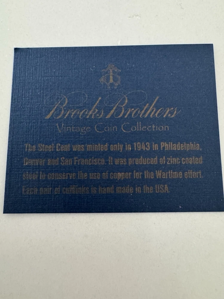 These authentic silver cufflinks feature two 1943 pennies that have been transformed into a unique and stylish accessory. The cufflinks are engraved with intricate details and showcase the vintage coins in a round shape. Made by Brooks Brothers in the United States, these cufflinks are perfect for special occasions such as weddings, graduations, or Father's Day, adding a touch of history and charm to any outfit. Ideal for men who appreciate classic and meaningful accessories, these cufflinks are a timeless piece that combines style with a hint of nostalgia.
