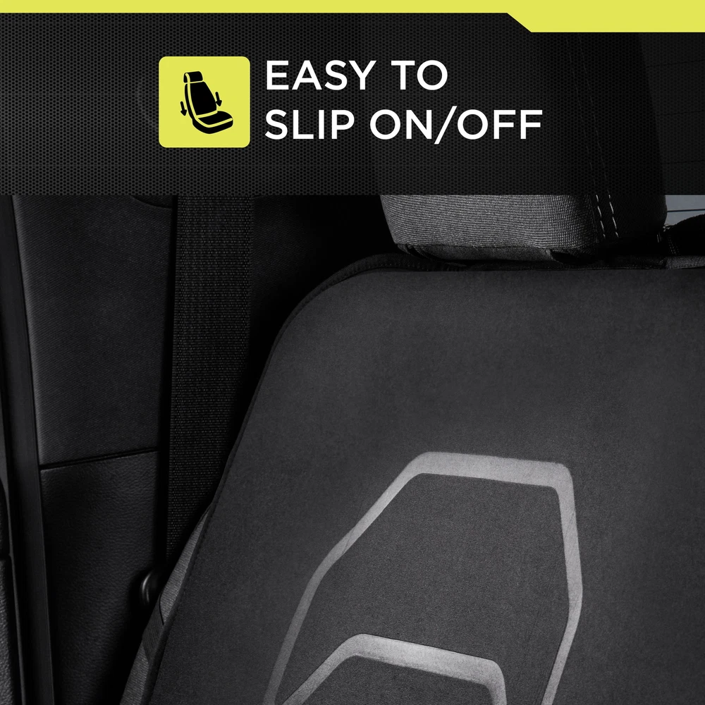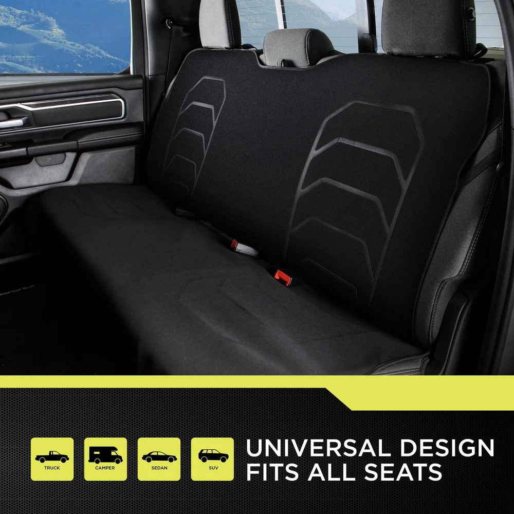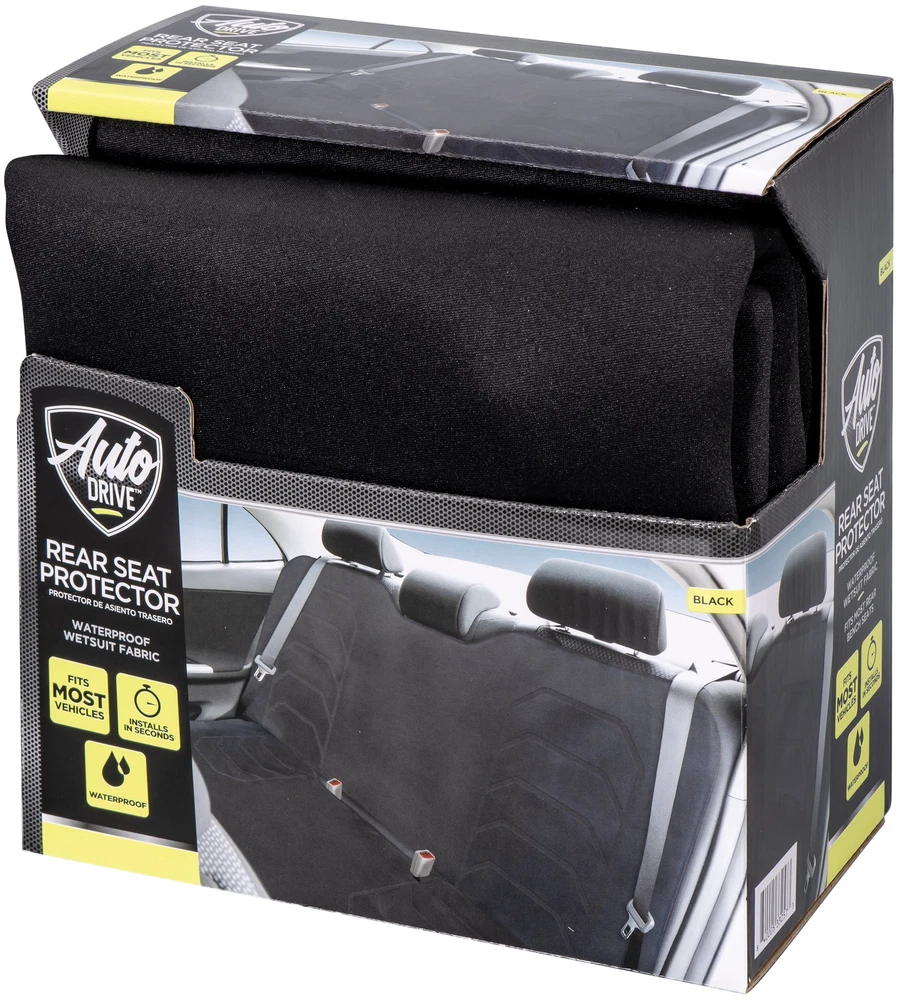 Auto Drive Waterproof Seat Cover Protector with DRI-LOCK Technology protects your seats after sports or workouts. The universal design fits all rear seats and provide the ultimate protection. Whether it’s a drop or a downpour, the DRI-LOCK™ wetsuit fabric delivers a cutting-edge waterproof barrier without sacrificing comfort. Protects car seats from spills, dust, debris, stains, Kids and messy Pets. Fits Cars, Trucks, Vans and SUVs. Easy to install. Spot clean with mild detergent and damp cloth. Air dry only. Protection From Kids/Car Seats Protection After Sports/Workouts Protection From Pets Fits Rear Bench Seats up to 54inch Wide Easy to clean - Hand wash with cold water only. Air dry only Sideless slip-on design - Allows protector to fit on seats with Side Air Bags and Armrests Wetsuit fabric is insulating in winter and summer for all season comfort and protection.