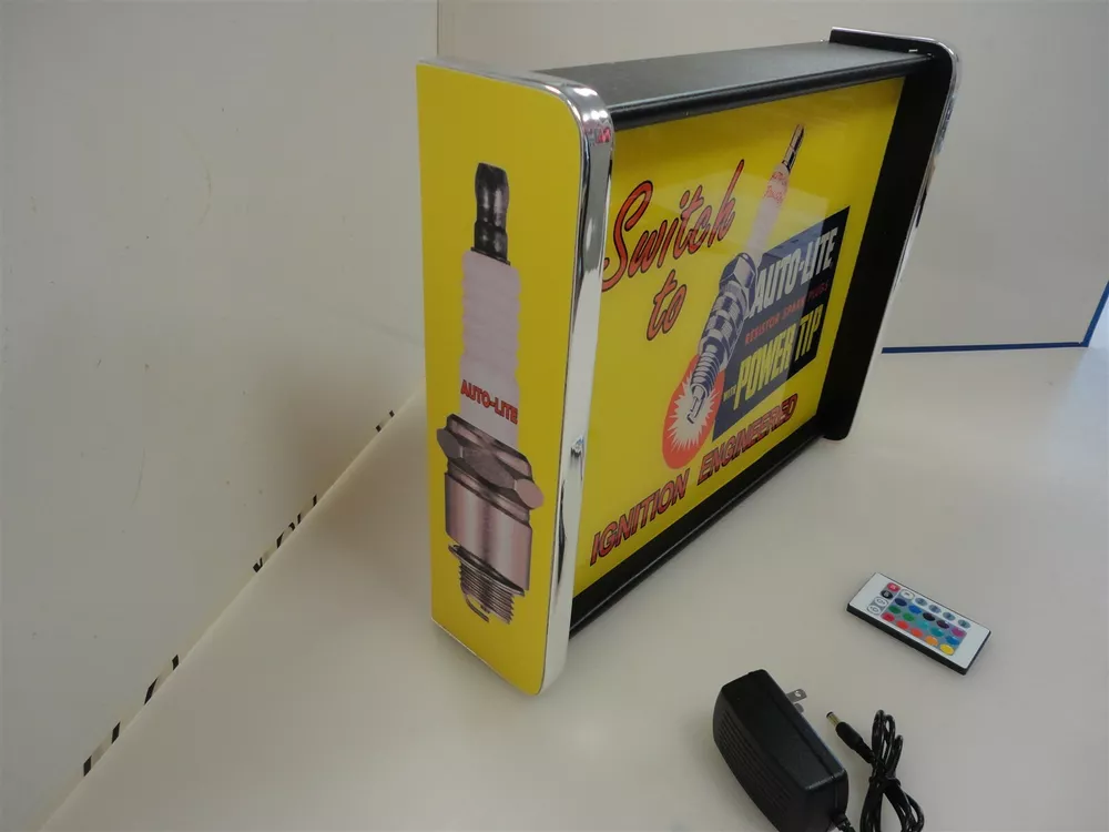 You are Bidding on a Auto Lite Spark Plug LED Display light sign box This sign has Vinyl Graphics applied to a plywood and Black melamine end caps AWESOME QUALITY It has a acrylic front sign panel that lights up with LED strip lights and a remote control to run them , they can change colors and flash and do all kinds of cool stuff It is 18" wide and 14" tall and 4 " deep It has a 110 volt power cord that run 12 volt LEDs I Will combine shipping on Multiple auctions We Do ship Internationally Powered by SixBit's eCommerce Solution