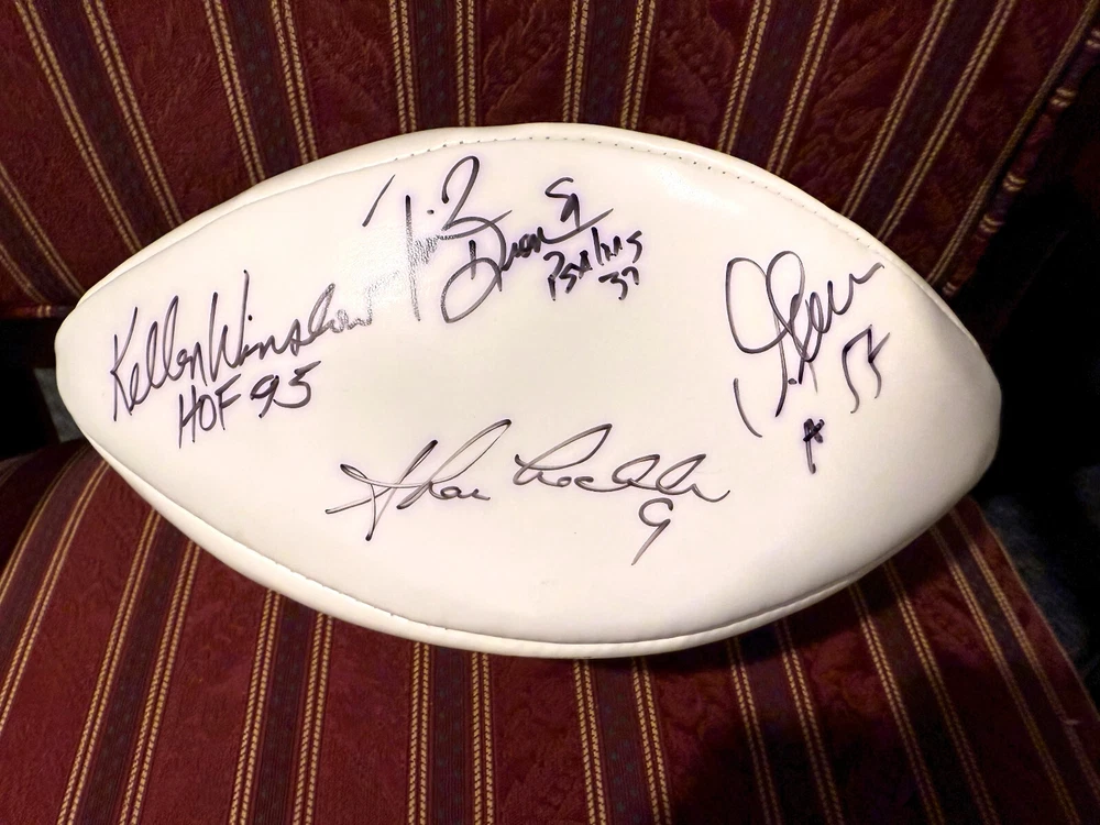 NFL player autographed football by nine Super Bowl, MVP, Pro Bowl and Hall of Fame players during a made-for-TV golf event in Hawaii. Franco Harris , RB - 4-time Super Bowl Champion, Super Bowl 9 MVP, 9-time Pro Bowl, NFL Hall of Fame Tim Brown , REC - Heisman Trophy & 9-time Pro Bowl Willie Lanier , LB - NFL & College Hall of Fame , Super Bowl 4 Champion, 6-time Pro Bowl Junior Seau , LB - NFL Hall of Fame , 12-time Pro Bowl Kellen Winslow , TE - NFL & College Hall of Fame , 5-time Pro Bowl Merlin Olsen , DT - NFL & College Hall of Fame , 14-time Pro Bowl John Lynch , SS - Super Bowl 37 Champion, 9-time Pro Bowl Bill Walsh , Head Coach - 3-time Super Bowl Champion, NFL Coach of the Year, NFL Hall of Fame Shane Lechler , Punter - 7-time Pro Bowl