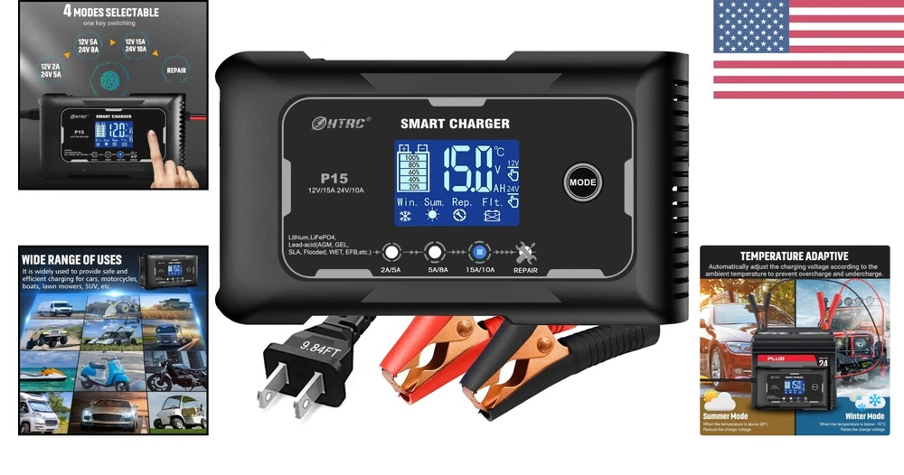Automated 15-Amp Battery Charger with Repair Function for Lead-Acid and Lithium ‹ › ‹ › ‹ › ‹ › ‹ › ‹ › ‹ › ‹ › Automated 15-Amp Battery Charger with Repair Function Introducing the ultimate solution for your charging needs, this 15-Amp Battery Charger seamlessly supports both Lead-Acid and Lithium batteries. Designed for versatility, it's the perfect companion for your vehicles, including cars, trucks, motorcycles, RVs, and more. Key Features: Wide Application: Compatible with a range of batteries including lithium iron lifepo4, Lead-Acid (PB/AGM/GEL/EFB, MF, FLOODED, VRLA, SLA, wet batteries). Automatic Battery Protection: Automatic identification of battery types and charging needs, ensuring optimal protection and efficiency. Intelligent Automatic Charging: Monitors charging process via advanced CPU control, adjusting charging current based on seasonal changes. Safety First: Durable ABS flame-retardant shell, built-in protections against over-charge, over-voltage, and short circuits. Robust Quality Assurance: Backed with a five-year warranty and permanent after-sales service for unparalleled peace of mind. Specifications: Input Voltage: 100-240V 50/60Hz Output: 12V (15A) / 24V (10A) Minimum Starting Voltage: > 2.0V Size: 158 x 90 x 50 mm Net Weight: 400g Benefits: Extends battery life with one-button repair function. Convenient LCD display showing charging status for ease of use. Compatible with various vehicles including agricultural vehicles, buses, yachts, and motorboats. Why Choose Our Battery Charger? Whether you're a seasoned outdoor enthusiast or just need reliable charging at home, our Automated 15-Amp Battery Charger is engineered to deliver. Equipped with state-of-the-art technology ensuring safe and efficient charging, it adapts to your battery’s needs, so you spend more time on the road and less time worrying about your vehicle’s power source. Experience peace of mind every time you charge your battery. Make this charger a staple in your vehicle care toolkit – order yours today! Shipping Free & Fast Shipping - We offer free shipping to most of the USA with a normal delivery time of 3-7 days. However, due to the current situation, additional delivery time (up to 3 weeks) may be required for some items. Alternative Carriers - We may use alternative carriers (e.g. USPS, FedEx, UPS, etc.) to ensure your package arrives safely and on time. Due to the use of multiple carriers, we are unable to provide a tracking number automatically. Handling Time - Orders are processed and shipped within 1-2 business days of receiving cleared payment. Shipping Restrictions - Shipping to Alaska, Hawaii, Puerto Rico, Guam, and other US territories may incur shipping charges or delivery restrictions. Please contact us before ordering, or your order can be refunded/cancelled. State Restrictions - There may be restrictions based on your state of purchase. For example, certain items may not be shipped to California due to state regulations. Contact for Tracking Updates - If you require tracking updates or have any concerns about the delivery of your order, please feel free to contact us, and we will be happy to assist you. Return 30-Day Hassle-Free Returns - We want you to be completely satisfied with your purchase. If you are not, you can return the item within 30 days of receiving it for a full refund or exchange. Easy Return Process - To start a return, simply contact us and we will provide you with a prepaid return shipping label and detailed instructions. Restocking Fee - There are no restocking fees for returns. However, the buyer is responsible for return shipping costs if the return is not due to a seller's error. Refund Processing Time - Refunds will be processed within 5 business days of receiving the returned item in its original condition. Payment We accept all major credit cards, PayPal, and Apple Pay for your convenience. Your payment information is secure and encrypted to ensure a safe and seamless transaction. Please complete your payment within 3 days of purchase to avoid any delays in shipping. Feedback Your feedback is extremely important to us. We strive to provide the best products and customer service possible. If you are satisfied with your purchase, please take a moment to leave us a positive review. If you have any concerns or issues with your order, please contact us before leaving negative feedback. We are committed to resolving any problems and ensuring your satisfaction. Contact Us If you have any questions or concerns, please feel free to reach out to our customer support team. You can contact us through the eBay messaging system. We are available Monday to Friday, 9:00 am to 5:00 pm EST, and we will do our best to respond to your inquiry within 24 hours. Thank you for supporting our small family business! UPC: Not Set Unit Quantity: 1 Compatible Battery Sizes: 12V,24V,AGM,GEL,SLA,LiFePO4 Application: LiFePO4 Battery Charger Connectivity: 3m power cord Brand: Unbranded Type: Mains Charger Chemical Composition: Li-Ion Battery Capacity: 1 Voltage: 12 V Amp Hours: 15 Ah MPN: Not Set Unit Type: lb Country/Region of Manufacture: Not Set Manufacturer Warranty: Not Set