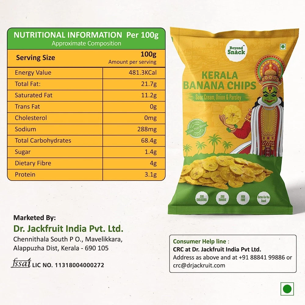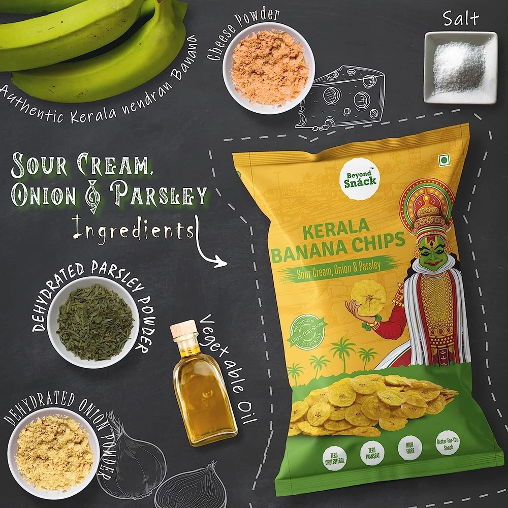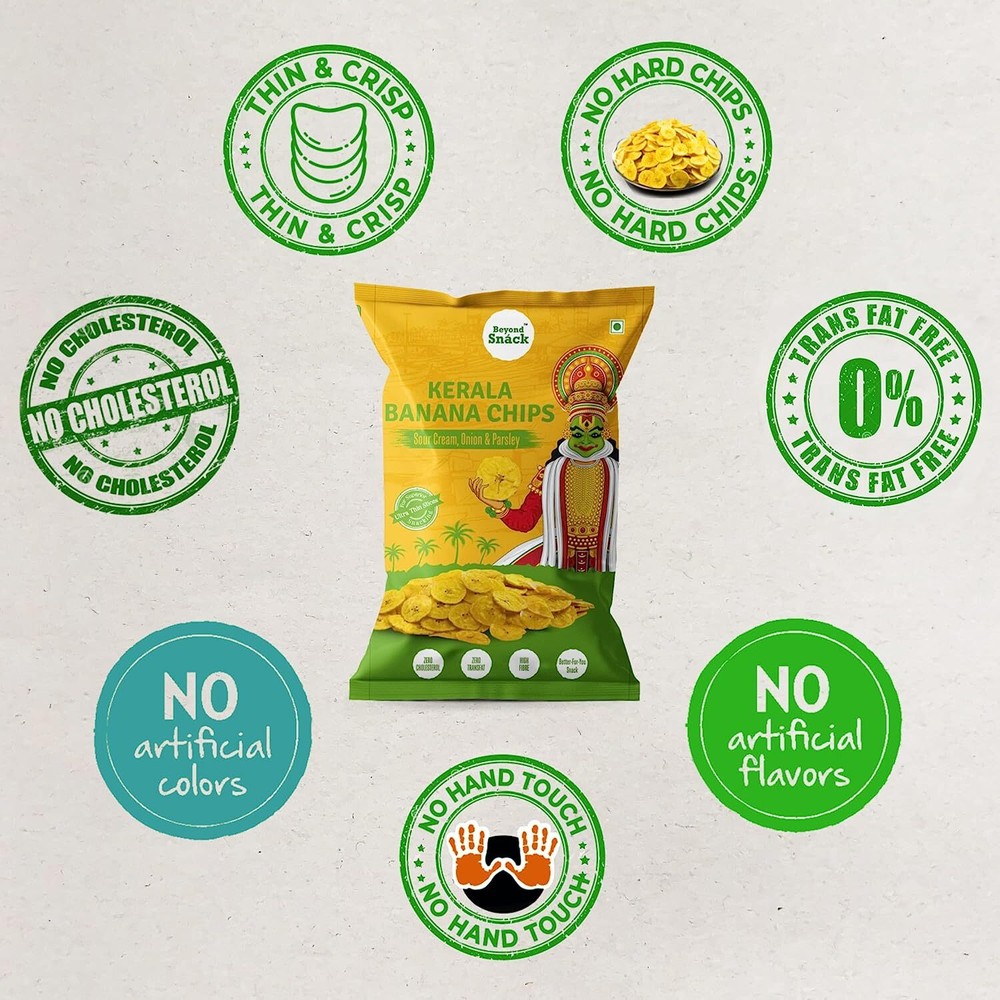 Please Note This: - The buyer shall be responsible for all customs duties, import taxes, or any other charges (If applicable). About this item AUTHENTIC KERALA BANANA - Kerala banana chips are really special because of its taste, texture, and experience it provides. The secret behind all the above attributes is the variety of banana used for making chips. it is an exclusive variety of banana called Nendran that grows in Kerala. Its thick flesh with rich in fiber is perfect for banana chips. Beyond Snack Kerala Banana chips are made of these nendran bananas. FRESH, LITERALLY FARM FRESH - Best snacking experience can be provided only when these nendran bananas should be separated from plantain plants at a specific maturity and convert to chips as early as possible. Since Beyond Snack procures directly from the set of partnered farmers we have better control over this, so at a predefined maturity, that are desirable for best banana chips these bananas are separated together and converted into chips on the same day. FULLY AUTOMATED, NO HAND TOUCH - bananas are washed, sliced as per precision cutting and washed again, cooked, seasoning, and finally packing. All these happens fully automated without any hand interaction. So YOU yes You are that first person to touch Beyond Snack banana chips. MUNCH WITH LESS GUILT - Sliced bananas passed through cooking oil only for a matter of seconds and the delicious hot chips will be received at the other end. The amount of time the beyond snack banana chips are exposed to oil is very short compare to traditional cooking, hence our chips are 20% Less Fat and Zero cholesterol. You will not even feel a tinge of oil on its surface however cooked to perfection for delicious and healthy chips. Moreover, it's Trans fat-free, Gluten-Free and Non-GMO NO MORE BROKEN CHIPS, NO MORE HARD CHIPS - Air puffed pack will act as a cushion so none of the external pressures will reach our chips. Result in all-round coin-shaped banana chips. Our precision slicer ensures the same thickness for each slice, further cooked to perfection at pre-defined standards for the best-snacking experience. So each chip is at the right crispness level and is suitable for any age group. An easy bite but still gives that crispness for the soulful snacking experience. Product Description The authentic Kerala Style Banana chips are made from an exclusive variety of banana called Nendran , that grows in Kerala. Nendran is considered as the King of Bananas because of its thick flesh, long built and great nutritional benefits especially famous for it prebiotic properties. This makes Kerala Banana chips special. Sliced in ultra thin wafers, Beyond Snack Kerala Banana Chips are carefully crafted and comes in an exciting flavors to provide superior snacking experience . NO HAND TOUCH Our Banana chips are hygienically processed (Washed, Sliced, Cooked, Seasoned) without any hand interaction. NO ARTIFICIAL COLORS Free from any added preservatives or colors . NO ARTIFICIAL FLAVORS Free from any added flavors or colors . NO CHOLESTEROL With 20% Less Fat and Zero cholesterol, our Banana chips are exposed to oil only for a few seconds. Making it the healthiest and tastiest chips in the world. FRESH, LITERALLY FARM FRESH - Best snacking experience can be provided only when these Nendran bananas should be separated from plantain plants at a specific maturity and convert to chips as early as possible. Since Beyond Snack procures directly from the set of partnered farmers we have better control over this, so at a predefined maturity, that are desirable for best banana chips these bananas are separated together and converted into chips on the same day. In a Fully automated processing unit the bananas are washed, sliced as per precision cutting and washed again, cooked, seasoning, and finally packing. All these happens without any hand interaction . So YOU, yes You are that first person to touch Beyond Snack banana chips . NO MORE HARD CHIPS Our precision slicer ensures the same thickness for each slice, further cooked to perfection at pre-defined standards for the best-snacking experience. So each chip is at the right crispness level and is suitable for any age group . An easy bite but still gives that crispness for the soulful snacking experience. 100% NATURAL & AUTHENTIC Beyond Snack Kerala Banana chips are made from an exclusive variety of bananas called Nendran bananas, that grows in Kerala . They are really special because of its taste, texture, and experience it provides. Its thick flesh with rich in fiber is perfect for banana chips. HEALTHY AND DELICIOUS SNACK Nendran Bananas are rich in fibre and potassium too ! Non-GMO Naturally Gluten Free Good Fiber AMAZING FLAVORS AND IRRESISTIBLE TASTE Superior ingredients in the perfect blend makes Beyond Snack chips too good to resist.