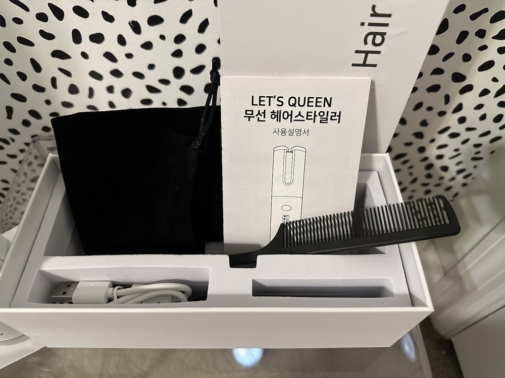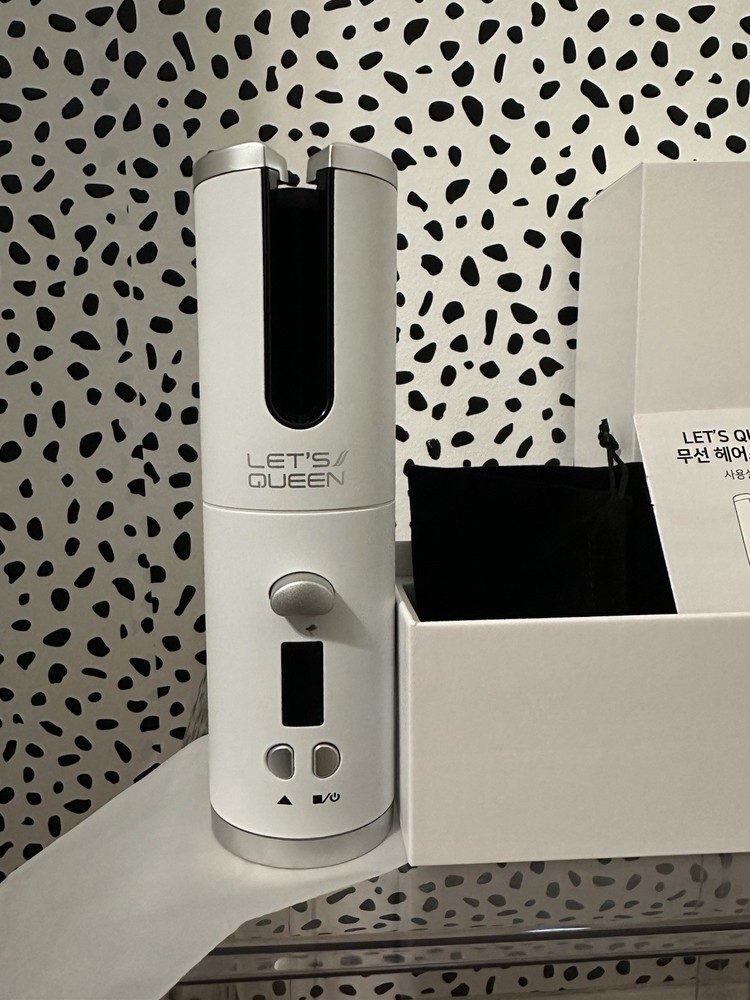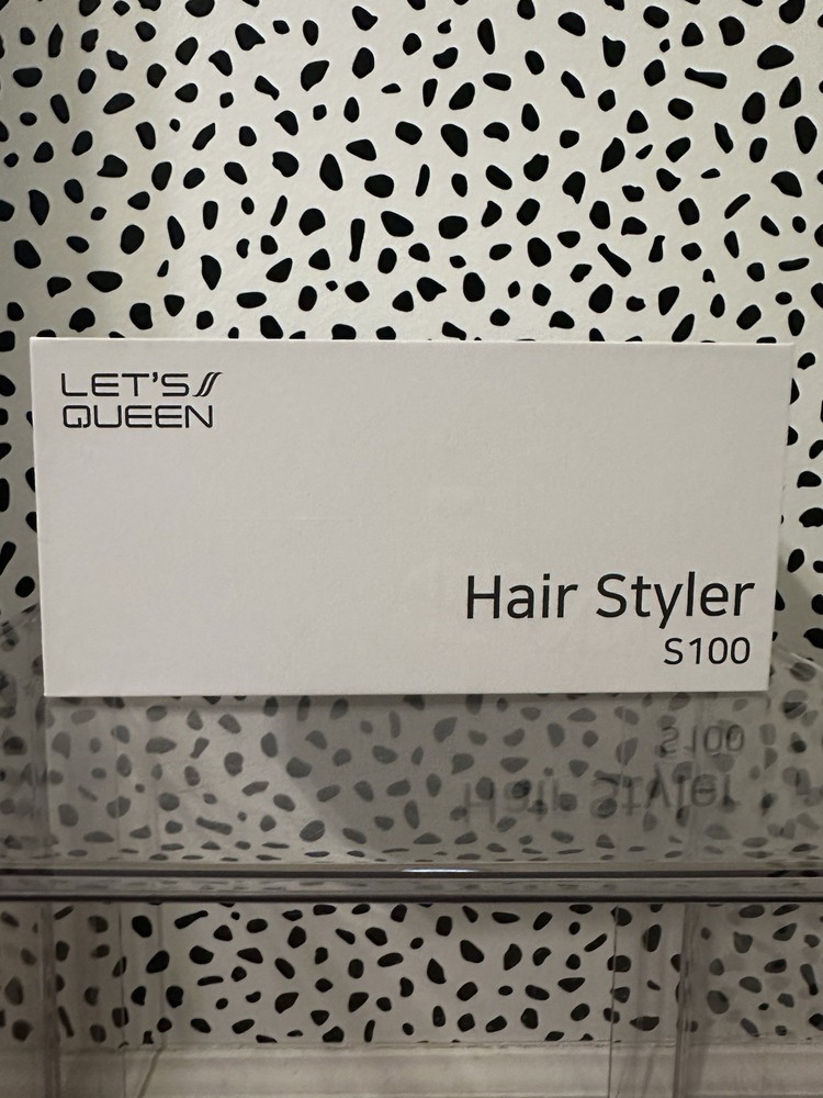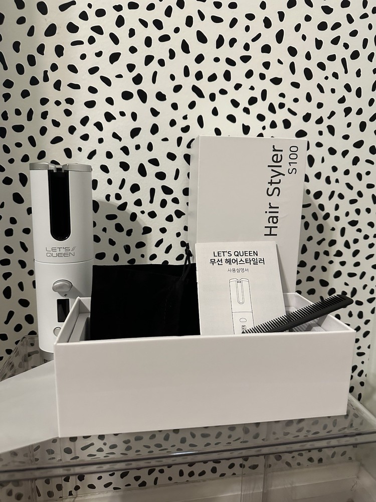 New only opened for pictures! Never used! The image shows the packaging for a "LET'S/QUEEN Hair Styler S100". This is an automatic, cordless hair curler designed for ease of use. It features ceramic rotating technology and is rechargeable, making it portable. The device offers multiple temperature settings and timers for different hair types and desired curl styles. It's designed to create curls automatically by wrapping hair around a spinning barrel.