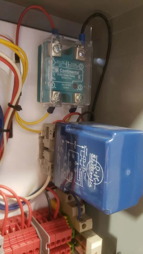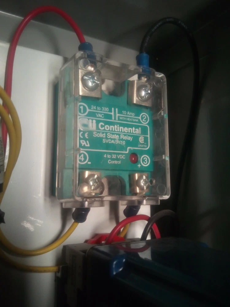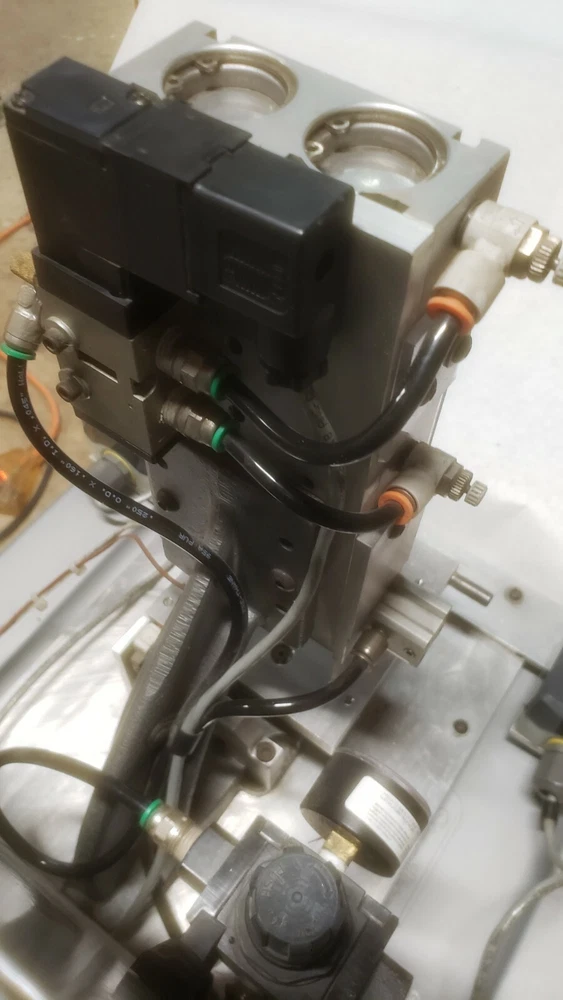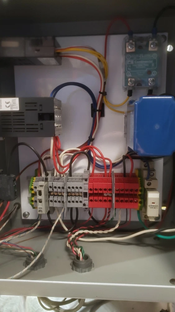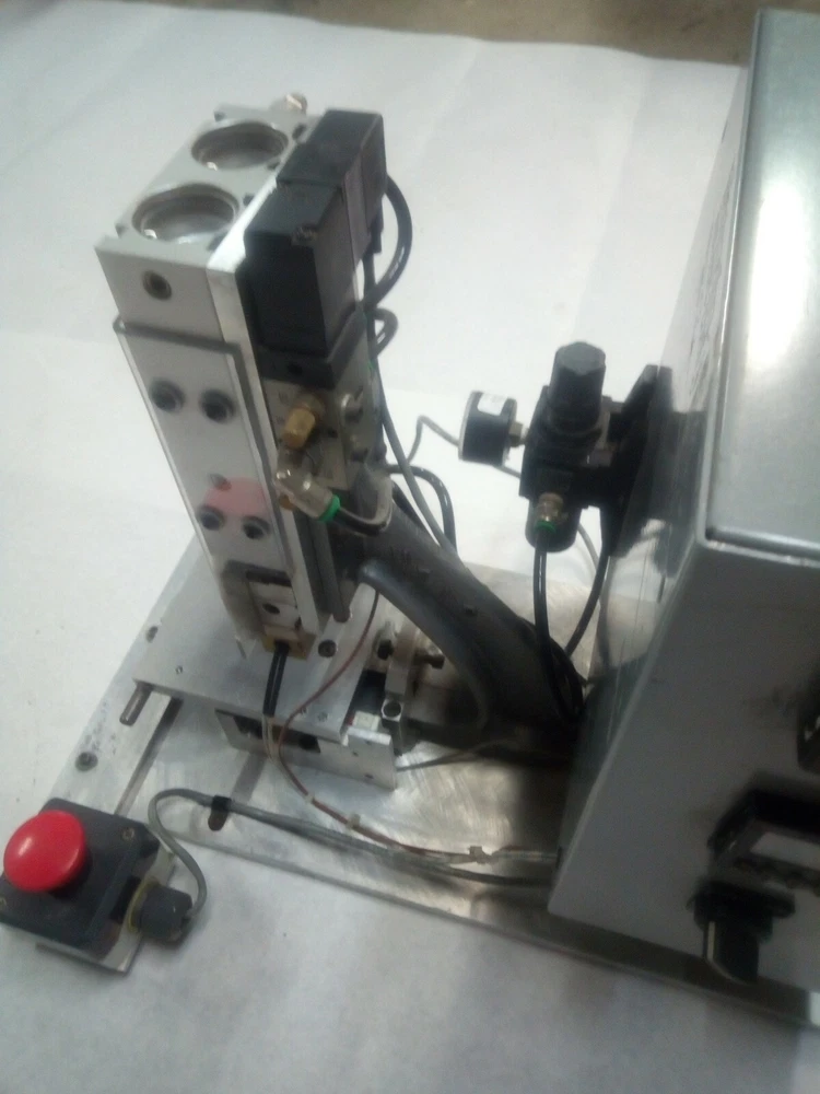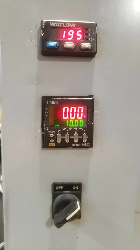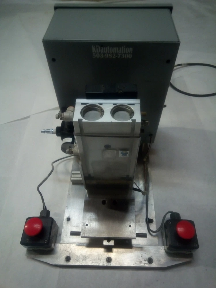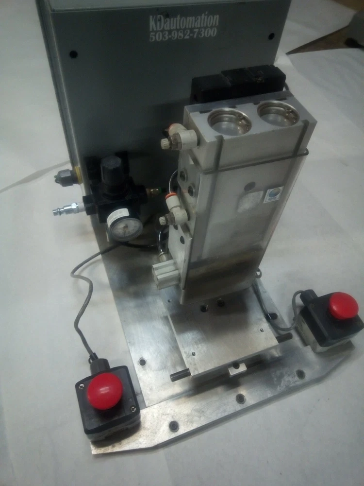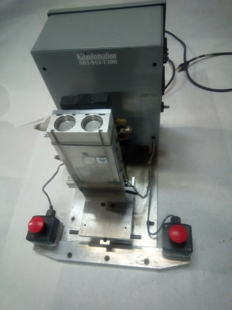Semiautomated Heat Staker with SMC CXSM32-75 airslide, Watlow 932a heater controller, 200W heater element, Omron H5CX-A timer, Continental RVDA/6V25 SSR and its own pressure regulator. This unit has a sliding platen. Two hand no-tie-downs work together to initiate press process. Timer can be set and referenced real-time outside its enclosure. Proper operation verified by me personally on 2/5/2021. Dimensions: Slide dimensions 5" deep by 5 1/4" wide. Slide manual with detent on either end, with travel of 2.75". Overall dimensions: 16" x 16" x 19" Weight is 47.6 lbs. This is a huge bargain for anyone who has small heatstaking or press needs for plastic parts, or who is willing to do the upgrades required for larger capacity. I am happy to answer whatever questions you may have, to the best of my ability. I am happy to package the heatstaker securely for shipment and engage in reasonable legwork to make it happen. However, buyer must actually do the arranging for shipment, lest postage become a major expense. 7-day inspection for refund, return shipping is responsibility of buyer. Please, no international sales or shipments due to past bad experiences. Original cost was something like $14k. As you can see from the control box layout and general workmanship, KD Automation did a pretty good job of it. Please no sales outside of USA, due to prior experiences.