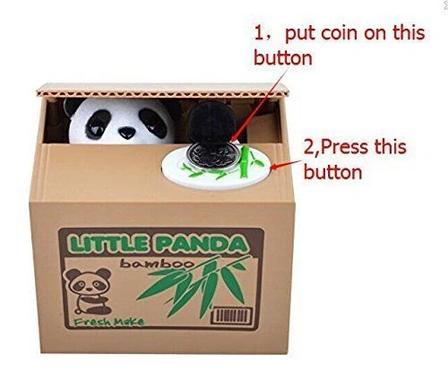 Description The most adorable coin banks in the world. Help you save money in a new and funny way. A perfect gift saving pocket money for the kids. Adorable mechanical panda comes out of cardboard box to steal your coins to help you save money Great gift for any child - they will easily fall in love with this little panda bank Can also be used as an ornament for home, desk, table, or child's room Works on all American coins Requires 2XAA batteries (BATTERIES NOT INCLUDED)(THERE IS NO SCREW NEEDED FOR THE BATTERY COVER) How to use Confirm the coin outlet is closed. Turn the bottom power switch to ON position. Put a coin to correct position and gently press the coin, starting the program. After about one second, start up procedure began to work. The animal head rises to jack up the box cover, and its hand will take the coin into the box. And give you the sound remind. How to take the coins out Before taking the coin out, please turn the power switch to off position, then use a hard object to along with the direction of the arrow to screw the lid that opens the outlet. After removing the coin, use the same way to the opposite direction of the arrow to screw the lid that opens or closes the lid. Package includes One Panda Coin Bank
