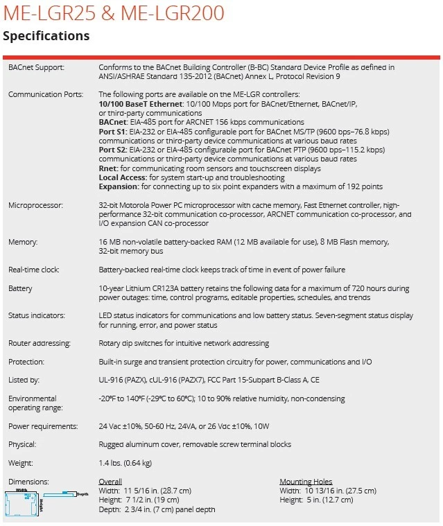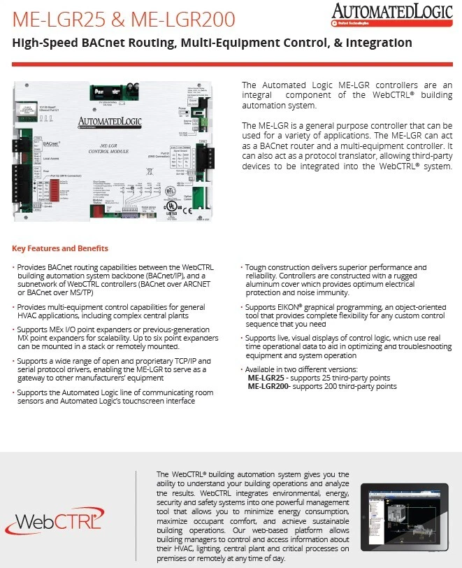 Pre-owned and used. Pulled out of a working BMS system during a building BMS upgrade. The LGR is an extremely powerful, high-speed router/gateway that can connect hundreds of control modules to a BACnet/IP backbone. Support for BACnet/IP, BACnet-over-Ethernet, ARCNET 156 Kbps, MS/TP, and BACnet PTP communications are standard. A wide range of open and proprietary protocol translator drivers allow the LGR to also serve as a gateway to other manufacturers' equipment. Fully programmable, the LGR can also execute complex control strategies for high-level system integration. Key Features and Benefits: 10/100Base-T Fast Ethernet allows modules to serve as a BACnet router between BACnet/IP system backbone and field devices subnetwork. Native BACnet communications to field devices over a high-speed ARCNET 156 Kbps or BACnet MS/TP network. Can route messages from BACnet/IP to BACnet-over-Ethernet, providing compatibility with older BACnet systems. A wide range of open and proprietary protocol translator drivers allow the LGR to also serve as a gateway to other manufacturers' equipment. Designed with a high-speed true 32-bit microprocessor with cache memory, Fast Ethernet controller, high performance 32-bit serial communications co-processor, and ARCNET communications co-processor, LGR routers have the horsepower to serve the most demanding translation and communications functions. Can support hundreds of individual control programs written in ALC's legendary EIKON-LogicBuilder Graphic Programming Language. LGRs can handle the toughest system integration control programs. 16 MByte battery-backed SDRAM (32 bit wide), with 12 MBytes available for use, stores application programs, trends and other data when power is lost. 8 MByte Flash memory (32 bit wide) for easy field upgrades over the network. Battery backed real-time clock provides true standalone capabilities. LGRs recover from power failures providing full continuity of operations, even when communications are disrupted. Rnet port supports Automated Logic's line of RS room sensors and BACview6 local operator interface, and provides local access to the system. Enhanced local access is also available on an EIA-232 port. Tough construction delivers superior performance and reliability. Control modules are constructed with a rugged aluminum cover which provides optimum electrical protection and noise immunity.. Automated Logic. Automated Logic Corporation. LGR25.