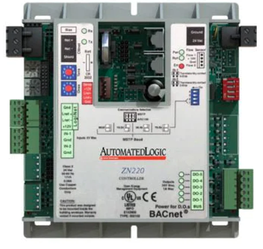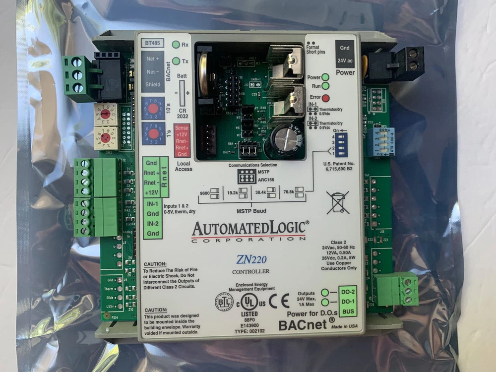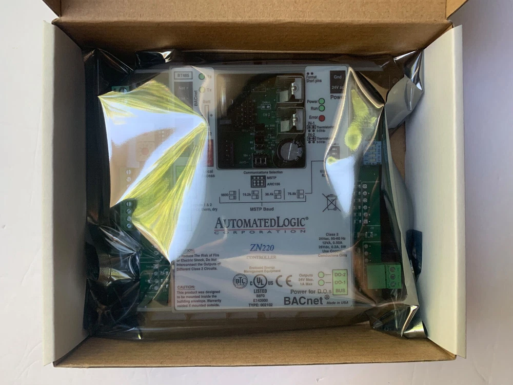 Automated Logic ZN220 BACNET Control Board ZONE Controller. Condition is open box. PRODUCT DESCRIPTION: ---------------------------------------------------------------------------------------------------------------------------------------------- -BACnet Support: Conforms to the BACnet Advanced Application Controller (B-AAC) Standard Device as defined in BACnet 135-2001 Annex L. -Binary Outputs: Two binary outputs, relay contact rated at 1A max @ 24V-ac, configured normally open. Universal -Inputs: Two inputs with 10-bit A/D resolution for dry contact or Type 2 thermistors. -Microprocessor: High-speed 16-bit microprocessor with ARCNET communication co-processor. Listed by: UL916 (Canadian Std C22.2 No. 205-M1983), CE, FCC Part 15 - Subpart B - Class A. The ZN220 is a fully programmable, native BACnet Advanced Application Controller (AAC) designed for controlling a single zone in a building. It communicates on an EIA-485 LAN using BACnet over ARCnet or BACnet MS/TP communications and connects seamlessly to the WebCTRL building automation system. -Versatile controller suitable for a variety of applications, including fan coil units, lighting, and exhaust fan control. Standard library of control programs available for most zoning. -Supports EIKON graphical programming software, an objectoriented tool that provides complete flexibility for any custom control sequence that you need. -Supports Automated Logic® communicating sensors, which are available in a variety of zone sensing combinations and -support setpoint adjustment and occupancy overrides. -Supports Automated Logic touchscreen interfaces for managing and troubleshooting the connected equipment easily. -Supports live, visual displays of control logic, which uses real time operational data and aids in optimizing and troubleshooting system operations. -Quick & easy test and balancing process. Controls up to 4 points (2 binary outputs and 2 universal inputs). High-speed, native BACnet over ARC156 communications delivers high speed response when you need it. -Supports native BACnet over MS/TP communications when required. Fast, powerful, and fully distributed control allows complete independence from any other devices in the system. -Firmware upgrades can be performed remotely. Easy startup and commissioning using WebCTRL user interfaces. Connects seamlessly to the WebCTRL building automation system. -Supports demand limiting and optimal start for maximum energy savings.. Automated Logic Corporation. Automated Logic Corporation. ZN220.