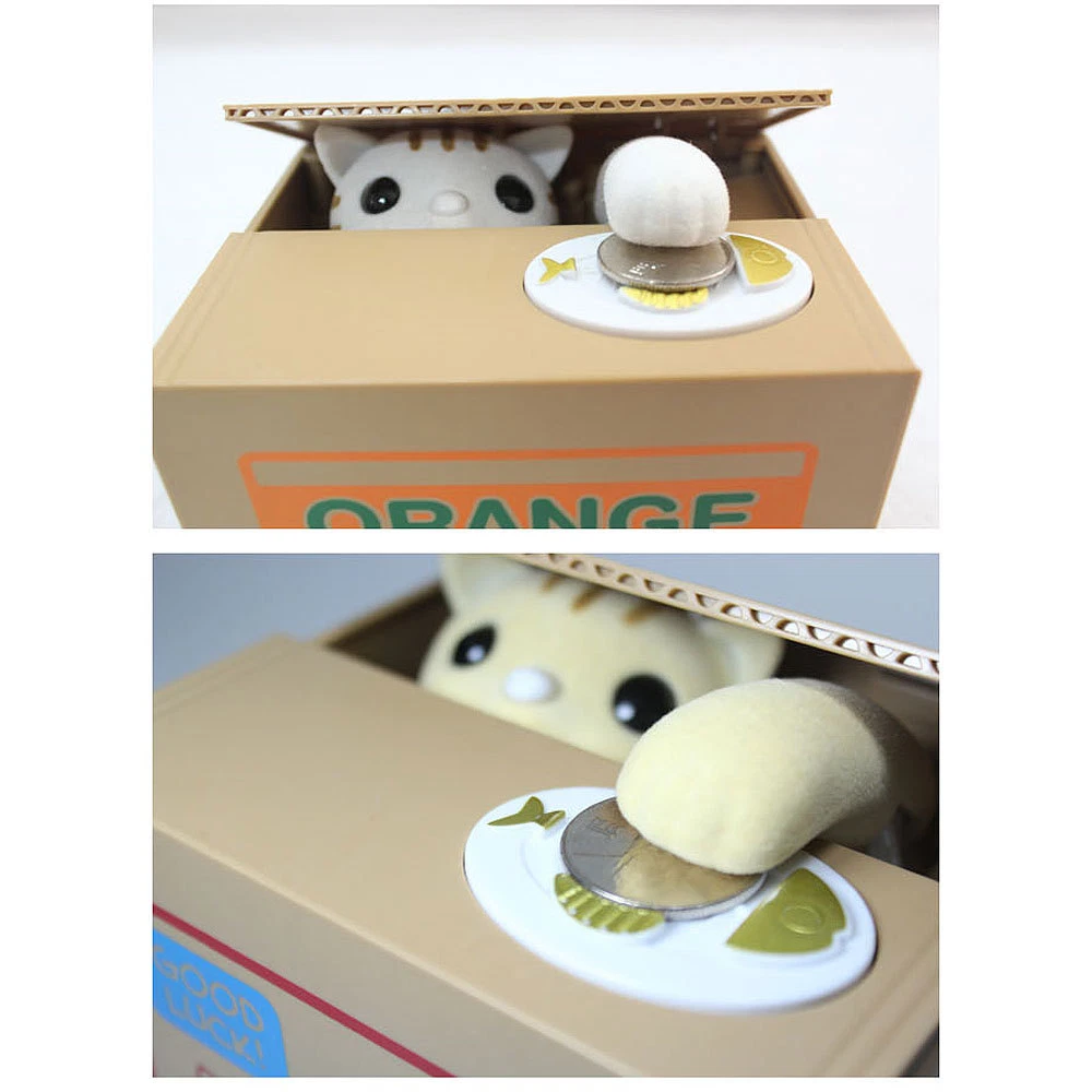 Automated Money Stealing Cat Coins Piggy Bank Money Saving Box [Feature] 1.100% Brand New and High Quality. 2.Perfect novelty piggy bank for home and office desks. 3.Help you save money 4.Put your coins in the plate, and it will go eat it 5.The Coin is not included [Specifications] 1.Material: ABS plastic+ eletronic component 2.Color: it will be random. 3.Dimension:Approx.12cm*10cm*9cm 4.The largest capacity:Approx.40 coins. 5.Powered only by: 2*AA battery(not included) [How to use] 1.Confirm the coin outlet is closed. 2.Turn the bottom power switch to ON position. 3.Put a coin to correct position and gently press the coin, starting the program. 4.After about one second, start up procedure began to work. 5.The animal head rises to jack up the box cover, and its hand will take the coin into the box. How to take the coin out: 1.Before taking the coin out, please turn the power switch to off position, then use the hard object to along with the direction of the arrow to screw the lid that can open the outlet. 2.After removing the coin, use the same way to opposite direction of the arrow to screw the lid that can open or close the lid. Note: 1.When long time not in use,please remove all the batteries. 2.This product can't suffer from impact ,please handle with care. 3.The product can't close to the fire. 4. Please turn off the power when not in use. 5.Products in kind prevail. Package include: 1 X Creative Piggy Bank , 1 X Manual