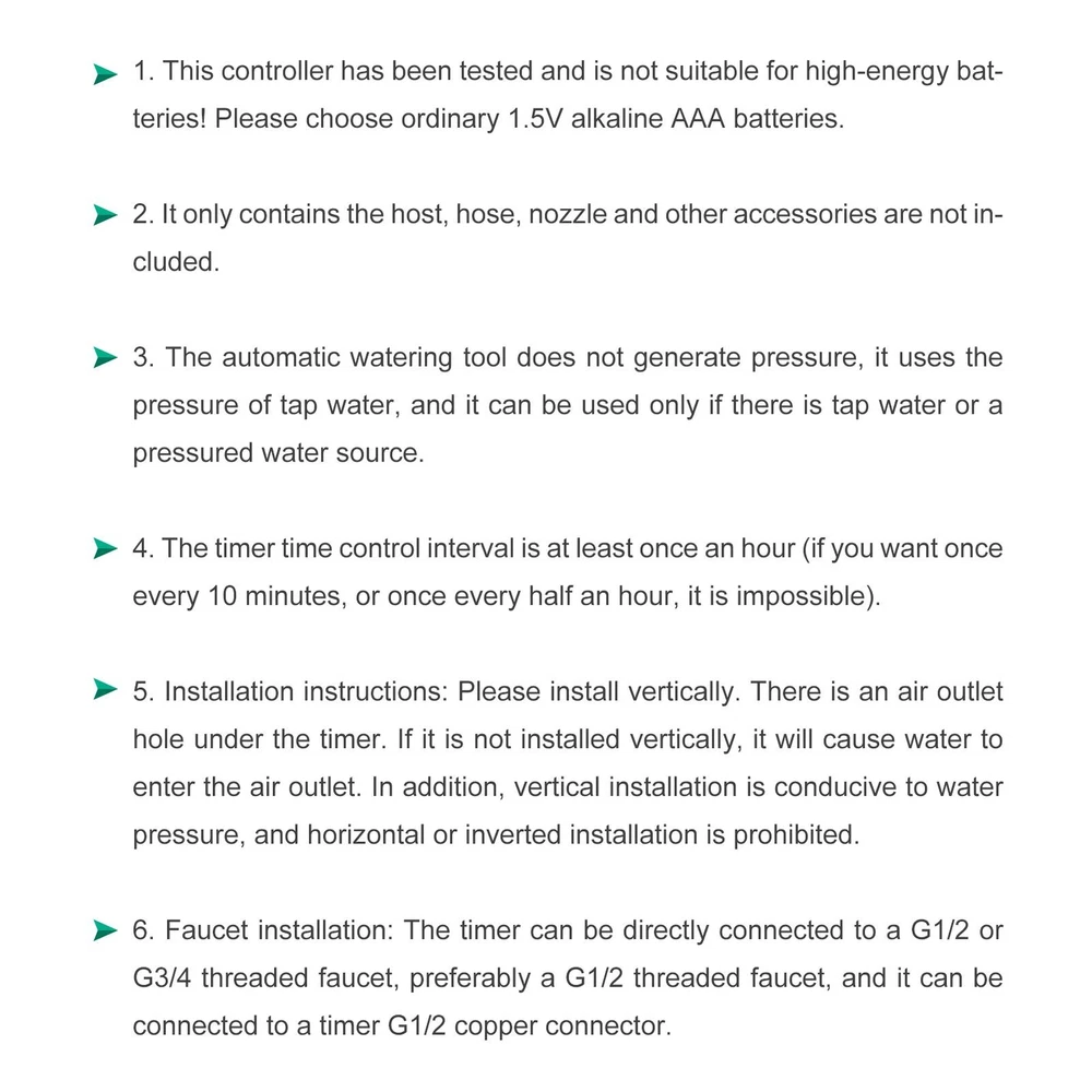 Description: Watering a large area of plant everyday is really tiring. This automatic electronic irrigation timer is of great use for watering home garden planting especially suitable for the people are not at home or too busy to take care of their family garden. Mainly adopts quality plastic, high quality and durable. Intelligent flowers watering timer, the standard clock, you can set the watering for your garden when you are not at home. Very practical and can be applied in your home garden, roof garden, lawn, balcony, courtyard etc. With this irrigation, you can now maximize the efficiency of your irrigation system. Practical product at good price, worth buying. Features: Automatic & intelligent: with a timer, you only need to press the buttons to set the irrigation and it will water the plants on. Multi-functional LCD screen: displays day of the week, hour, minute and programming for easy reference; buttons for easy setting and re-setting. User-friendly: 16 groups of watering can be set per day at most; different programs for your special demands: single and multi program, regular and cycle, program of one day or several days. Versatile use: suitable for the control of irrigation systems in the domestic sector, such as lawn sprinkler, sprinklers, greenhouse and more. Battery powered: only 2 AAA batteries required; not tethered to socket, you can use it any corner in your garden. Specification: Condition: Brand New Material: ABS Color: Green as Picture Batteries: 2 x AAA batteries ( Not included ) Suitable Water Pressure: 0-400KPA Irrigation: shortest 1 min, longest 9 hours 59 min Irrigation Frequency: at least once a day, up to 16 times, and the longest for two days Product Size: Approx. 162 x 86mm / 6.38 x 3.39inch Package Weight: Approx. 280g Package Included: 1 x Irrigation Timer 1 x User Manual Note: 1. Please allow 0-1inch error due to manual measurement. Thanks for your understanding. 2. Monitors are not calibrated same, item color displayed in photos may be showing slightly different from the real object. Please take the real one as standard.