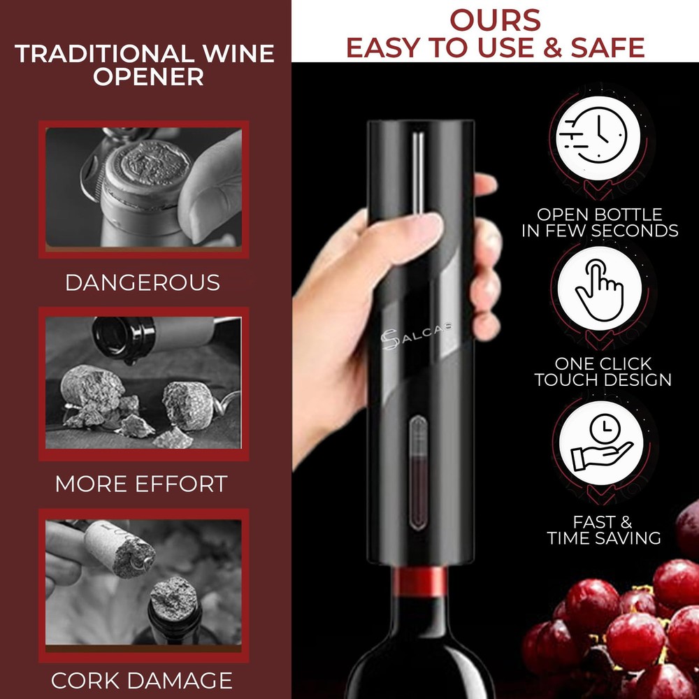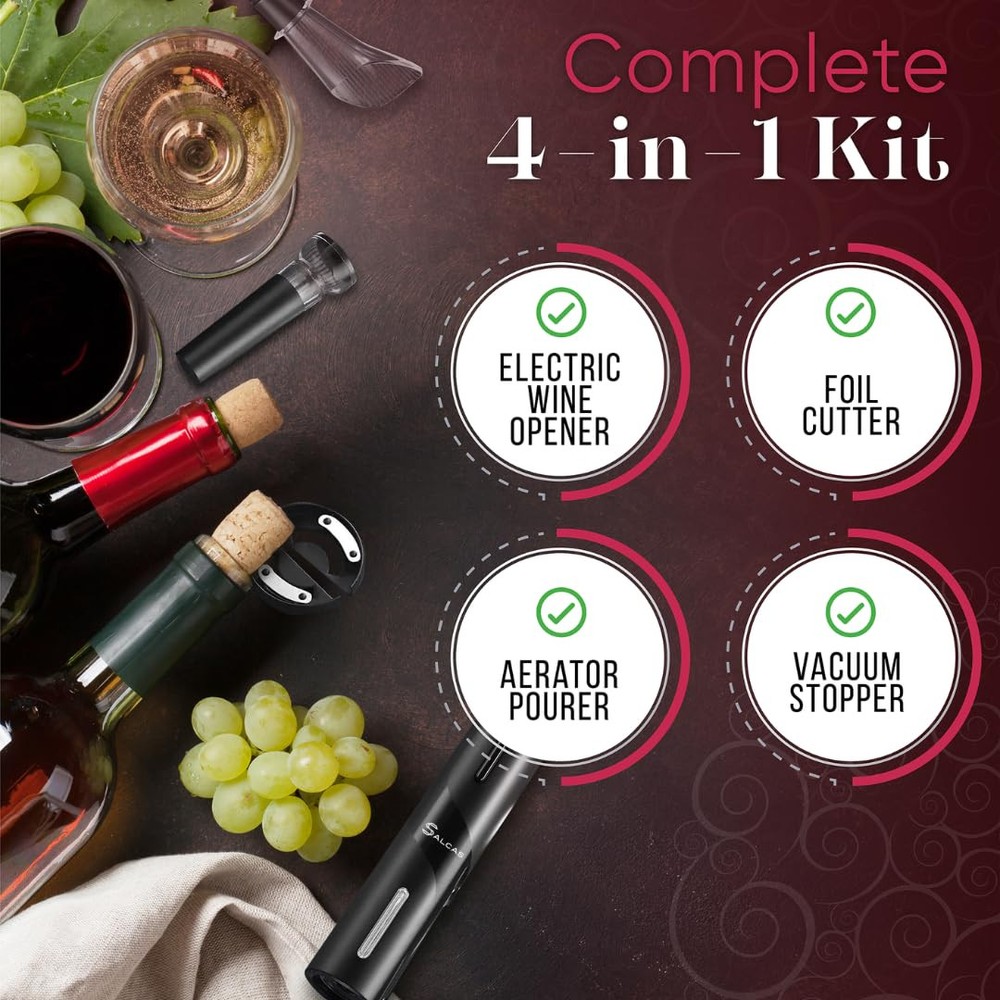 Complete 4-in-1 Kit: Our complete electric wine bottle opener set offers everything you need to enjoy, including electric wine opener, foil cutter, aerator pourer, and vacuum stopper. Effortless Cork Removal: Our wine opener electric features powerful and fast cork removal. Powerful motor and precision screw ensure quick, smooth cork release. It is silent, fast, simple and easy for anyone to use. Elegant Design: Our automatic wine opener design adds a touch of elegance to your wine experience and the ergonomic grip ensures easy handling. The superior quality materials make it durable and easy to clean. Enhanced Wine Tasting: Our wine opener set allows you to enjoy the delicious taste of quality wine with every sip, included 2-in-1 aerator and pourer helps to keep the wine in contact with the air, vacuum stopper preserves freshness. Ideal for Any Wine Lover: This 4-in-1 electric bottle opener combination fulfils all your wine opening, pouring and storage needs, making it the perfect gift for wine lovers; ideal for home, kitchen bar, party, wedding and more.