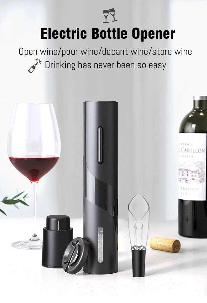 FREE SHIPPING 30 DAYS RETURN EASY PAYMENT Automatic Electric Wine Openers for Beer USB Rechargeable Beer Bottle Openers Co Features: Shining color and fashion appearance, for party, wedding, and home use Fits most standard wine bottle sizes Open the wine in 6 - 8 seconds Compatible with rechargeable battery and4*AA alkaline battery ( not included ) Transparent corkscrew cover to watch the stopper out Food-grade screw, safe and durable Easy operating buttons to push and pull the cork Aluminum alloy housing and ABS transparent screw cover Less than 75dB low working noise Specifications: Material: ABS Size: 215*48mm Color: Black Battery Package Include: 1 x Electric Wine Opener(Not Included Battery) 1 x Foil Cutter 1 x Chinese and English User Manual Rechargeable Package Include: 1 x Electric Wine Opener 1 x Foil Cutter 1 x USB Cable 1 x Chinese and English User Manual Battery Set Package Include: 1 x Electric Wine Opener(Not Included Battery) 1 x Foil Cutter 1 x Wine Stopper 1 x Wine Pourer 1 x Chinese and English User Manual Rechargeable Set Package Include: 1 x Electric Wine Opener 1 x Foil Cutter 1 x Wine Stopper 1 x Wine Pourer 1 x USB Cable 1 x Chinese and English User Manual Note: 1.Please allow slight deviation for the measurement. 2.Due to the light and screen difference, the item's color may be slightly different from the pictures,thanks for understanding. We accept the //customization. 1. enough stock, factory Outlet. 2. Priority delivery, order processing within 48 hours. 3. fast Logistics 15-25days . 4. USA/CA /RU / ES / CZ /FR /PL have local . Faster delivery! 5. NOT include a receipt or an invoice. 6. If you need customization any LOGO or Other,please leave a message to us.(above 50PCS) Any questions, please feel free to contact us. Reply within 24 hours REVIEWS The product came very well packaged. I'm very happy. thank you for everything. Seller strongly recommended. This is great! I definitely recommend! Product looks amazing Delivery was fast. Excellent seller, great communication. I advise everyone