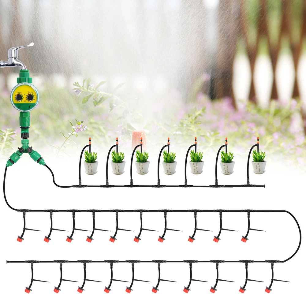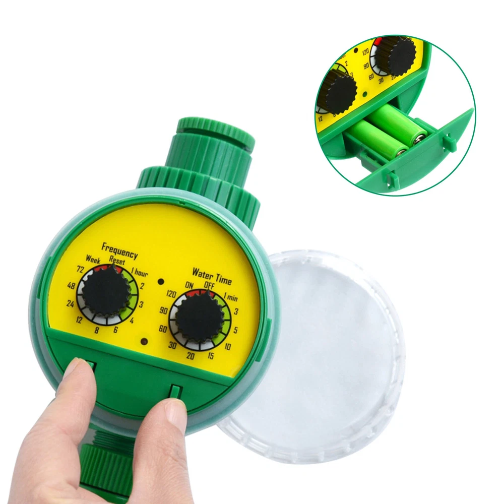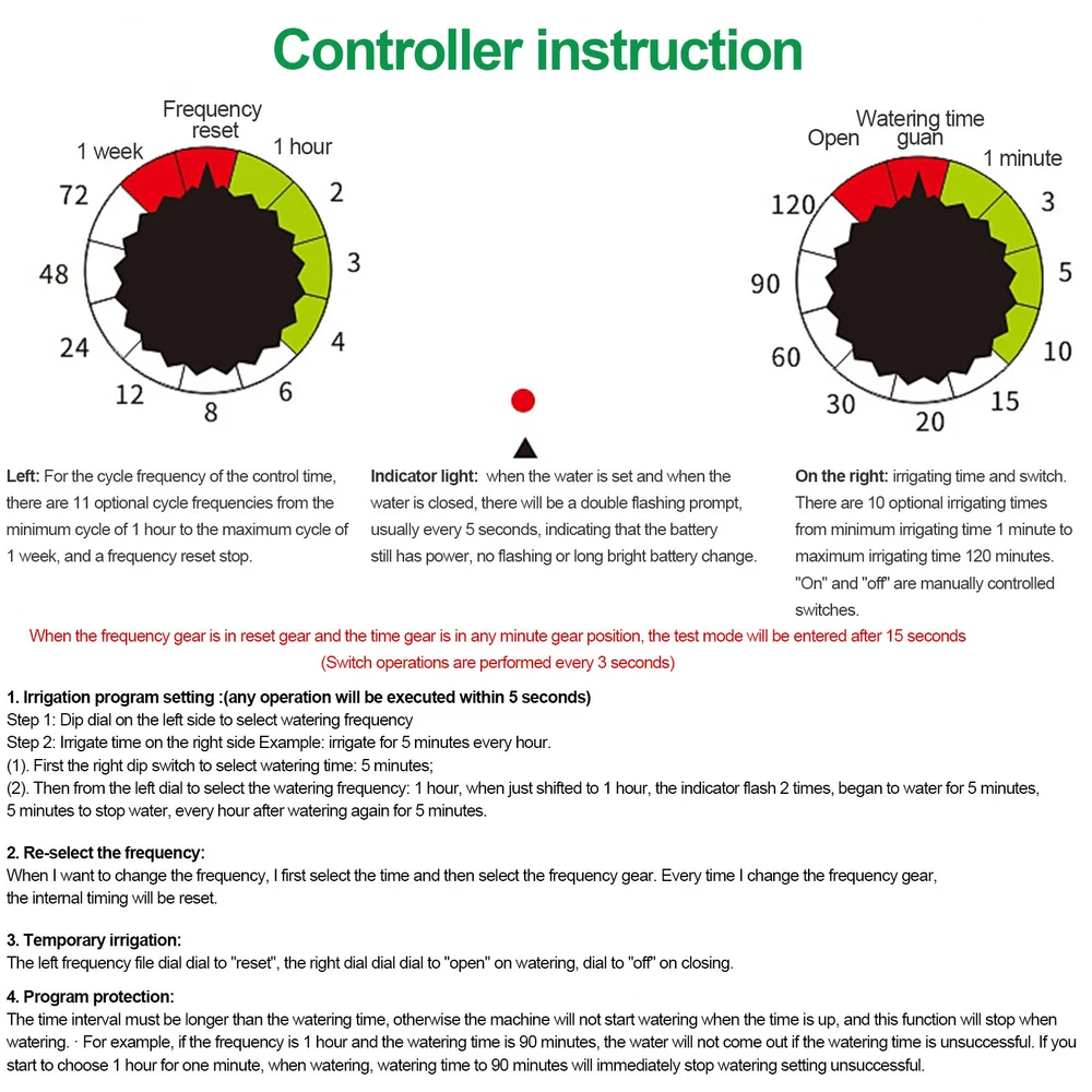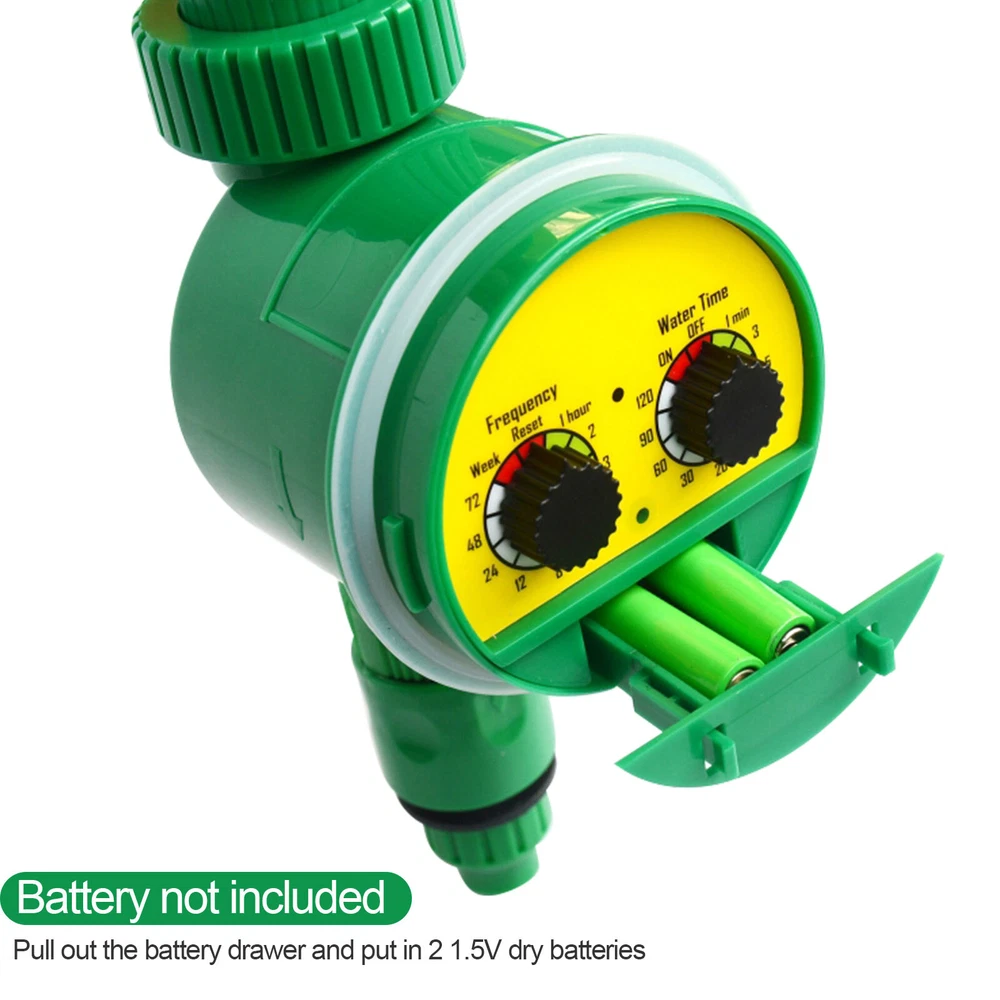 Automatic Garden Micro Drip Irrigation Watering Timer Hose Faucet Control F5G2 Description If you are a person who loves to keep flowers but is busy with work, then you may need a water timer to take care of your beloved plants. This water timer is an ideal choice for you. It intelligently controls the watering time and period, so your plants can drink water regularly. Moreover, it is made of waterproof and durable ABS, which can last for a long time. So hurry up and bring home such an efficient and smart water timer! Key Features Timed Irrigation: The knob on the left side of the water timer can set the watering time and can water the plants at the set time. You do not have to worry about being too busy to take care of your plants. Settable Time Length: The knob on the right allows you to set the length of each watering from 1-120 minutes. You can set the right length according to your plant habit. Highly Waterproof: This water timer has a waterproof rating of IPX4, so you can install it outdoors with confidence. Moreover, it comes with a removable waterproof case that can further protect against water to extend its life. Easy to Operate: The 2 knobs control is friendly to most age groups, very simple and convenient to operate. Easy to Install: This water timer is easy to install with its threaded interfaces. You just need to connect the inlet to the applicable faucet and connect the watering hose to the outlet, then it can be used. Great Durability: This water timer is made of high-quality ABS, which is very sturdy enough to be used for a long time. Time and Energy Saving: With this automatic irrigator, you won't have to water your plants regularly and laboriously or forget to water them. It can save you a lot of time and effort. Good Sealing: The threaded knobs have good sealing and can be tightly attached to the faucet without water leaking. Guaranteed Customer Service: Your satisfaction is our top priority, we will make things right for you. If you are unsatisfied with our products, you can contact us and we will ensure you have a pleasant shopping experience in our store. Details Battery Cover Snap: The two snaps below the knobs secure the battery cover. If you want to pull out the battery cover, you need to press the two snaps inward. 3/4" Threaded Connector: The connectors of this water timer are all 3/4" threaded connectors, which can be directly connected to the corresponding model of faucet. Application This water timer is suitable for gardens, botanical gardens, plant walls, farms, fields, florists, flower houses, plant rooks, etc. Specification Material: ABS Color: Green Waterproof Level: IPX4 Applicable Model:3/4" Faucet Batteries: 2 x AAA Batteries (Not Included) Maximum Temperature: 0-40℃ Working Pressure: 3-8Bar Irrigation Medium: Clear Water Frequency: 1H-7 Days Settable Irrigation Time Length: 1-120 minutes settable Package Size: 9*9*13cm/3.5*3.5*5.1inch Gross Weight: 0.23kg/0.5lbs Net Weight: 0.2kg/0.44lbs How to Use Put the batteries in. The valve will self-test once when you put the battery in for the first time, and the valve ball will automatically turn to the closed state. Turn the left knob to the time point of the desired frequency. Turn the right knob to the desired length of time for watering. The water valve will work automatically within 10 seconds. Package Included 1 x Water Timer 3 x Connecting Pieces Note The setting cycle time cannot be less than the duration of the open valve output. When the left rotary switch is set to the "0" state, the water valve opens for watering only once. When the right rotary switch is set to OFF state, the water valve will turn off the valve. This product does not include batteries, please purchase two AAA batteries by yourself. Please allow the slight color difference caused by the shooting light and 1-3 cm error due to manual measurement, and make sure you do not mind before ordering.