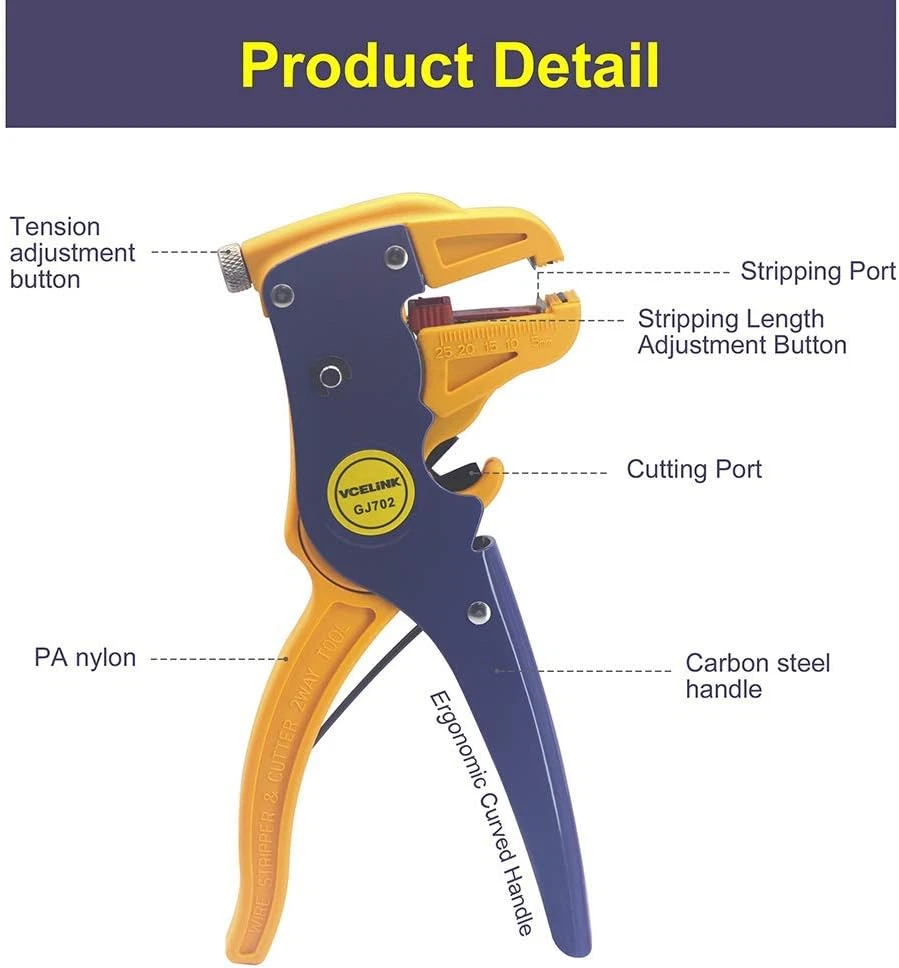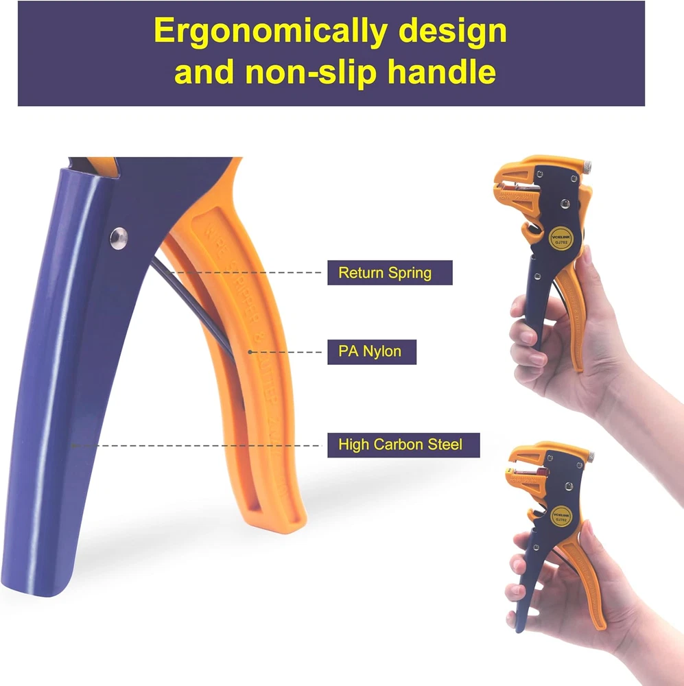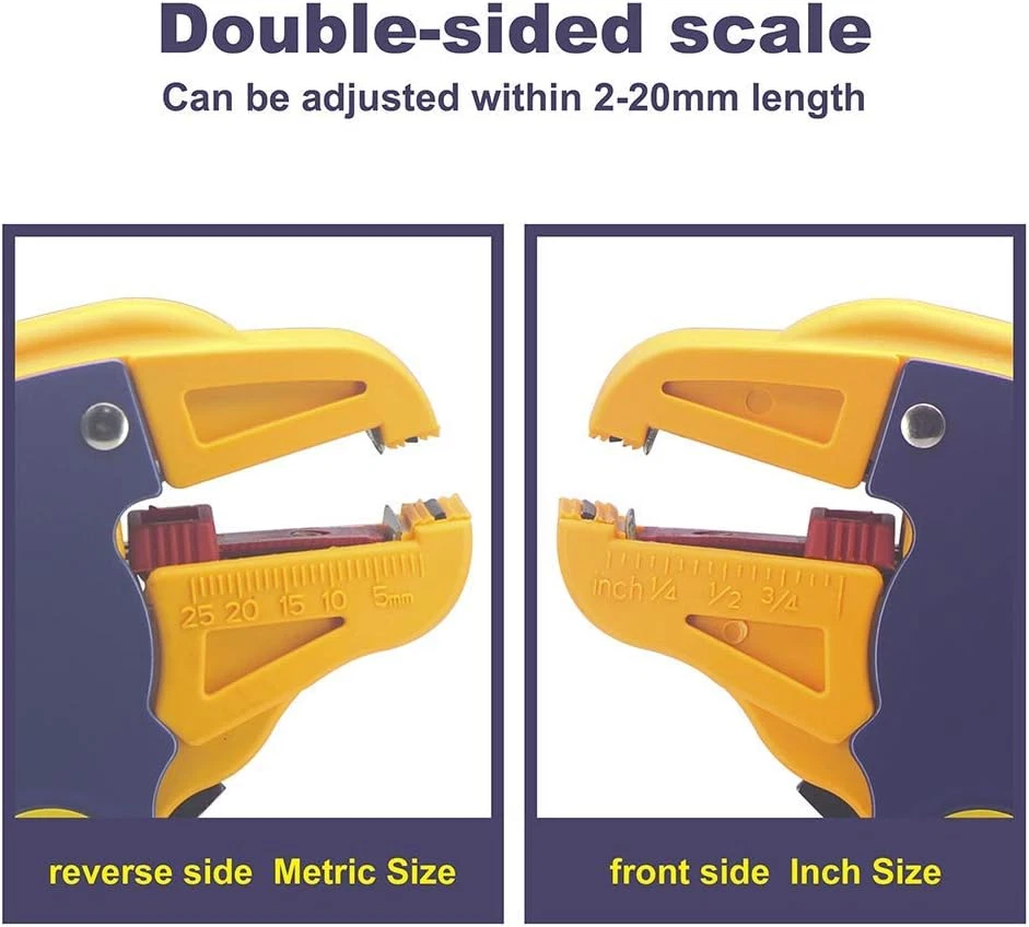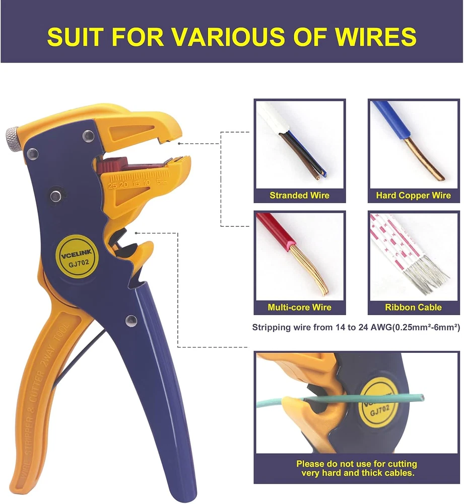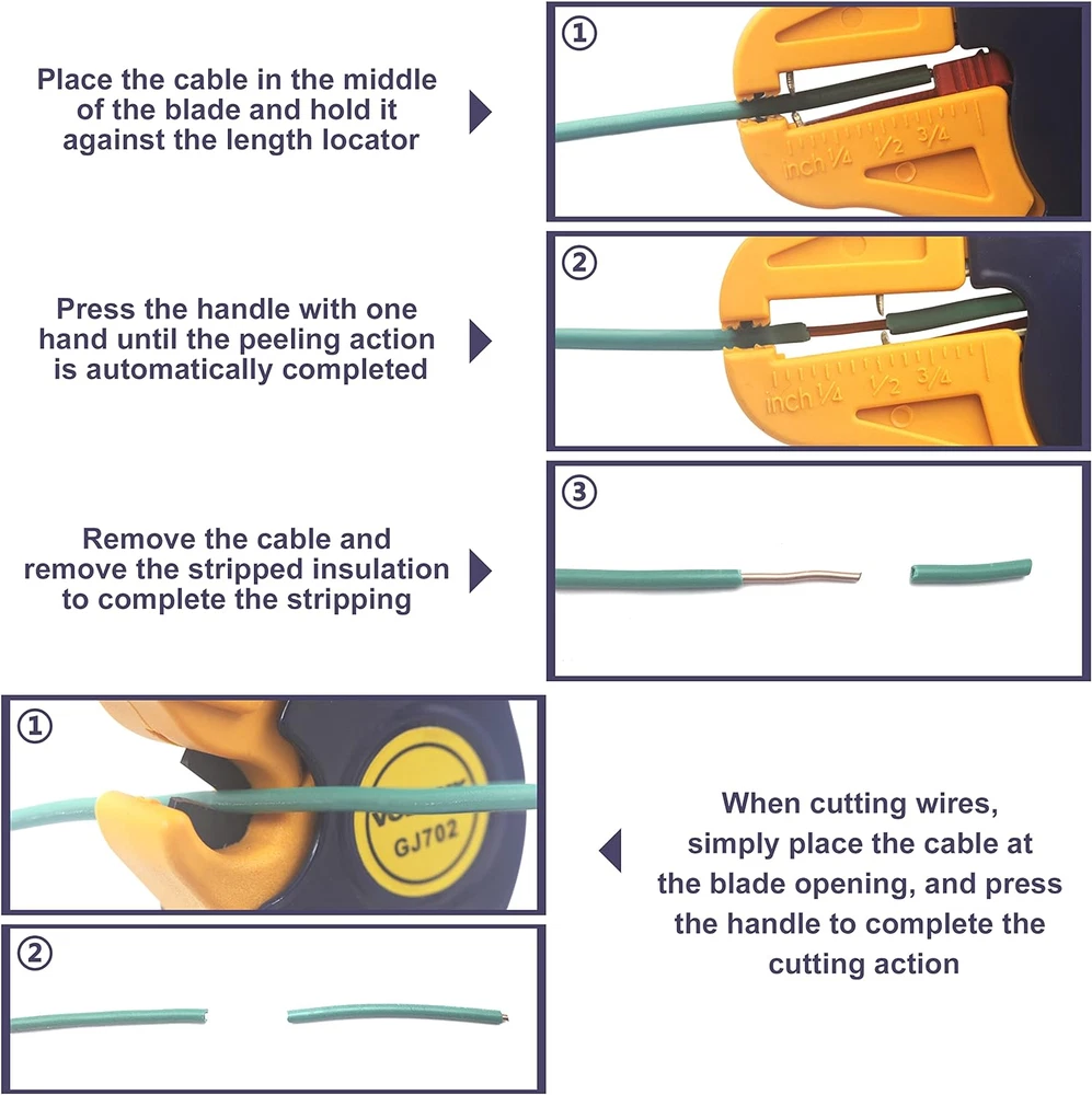 MULTIFUNCTIONAL DESIGN: The 2-in-1 quick strip wire stripper tool allows for precise and clean stripping of 14-24AWG solid core or stranded wires wires. Especially suitable for stripping speaker wires or flat ribbon cables. EASY TO USE: The handle of this tool is equipped with a spring, making it effortless to strip wires with just a gentle press. The insulation will automatically come off. Compared to traditional wire stripper pliers, it is simpler and saves time and effort. The ergonomic, non-slip handle also enhances the comfort of stripping, making it perfect for jobs that require frequent wire stripping. COMPACT SIZE & PORTABLE: Made of lightweight yet durable materials, this auto wire stripper does not fatigue your hands due to its weight. It is also compact in size, making it convenient to carry in a tool bag or drawer for immediate use. Ideal for DIY enthusiasts, electricians, or repair technicians. NO DAMAGE TO WIRE CORE: The tool is equipped with a pressure adjustment knob, allowing you to adjust the stripping pressure according to the wire thickness, ensuring a better stripping without damaging the wire core. Eagle nose design allows you to quickly stripping wires even in narrow spaces. It also has a length adjuster, allowing you to precisely control the stripping length as needed. CUSTOMER FIRST: You will get 1 × Small Wire Stripper. We always put our customer experience as our priority, and we also provide an 18-month warranty for all of our products. If you have any problem or advice about our products, please don't hesitate to contact us, we will try our best to solve your problem within 24 hours. Product Description Multi-Purpose Automatic Wire Stripper by VCELINK Feature: This Wire Stripper comes with self-adjusting jaws that firmly grab wire and cable from 14-24 AWG. Precise blade design will not damage the conductor cores. Adjustable peeling tension, suitable for insulating outer layers of different thicknesses, without damaging the copper core. The handle is ergonomically designed, it save a tremendous amount of time when you have multiple wires that need stripping. Adjustable Wire Length The longest stripped length up to 20mm(stripping length range:1/4-3/4 inch). Metric size is marked on the front of the pliers while inch size is marked on the back. Eagle mouth design Eagle mouth design can be used in tight spaces like under a dashboard. A slight indentation on the front part of the line is normal. Wire Cutter A wire cutter is built in, cutting Range from 0.8 mm-8 mm. Ergonomic Curved Handle The handle is ergonomically designed, it save a tremendous amount of time when you have multiple wires that need stripping. Reset springs make peeling and cutting wires easy and energy-efficient. One-Handed Completion Unlike conventional wire stripper, high carbon alloy steel lift-time with such accurate stripping. As an 2 in 1 multi-purpose tool, it can also cut wire with fast speed. Note: Do not use shears to cut steel wire or iron wire. The stripping objects is only suitable for wire insulation. Specifications A Wire: stripping range from 12-24 AWG(0.2mm²-3.3mm²), Cutting range from 14-28AWG(0.08mm²-2.0mm²) Twist Wire:stripping range from 10-24 AWG(0.2mm²-5.5mm²),Cutting range from 12-28AWG(0.09mm²-3.5mm²) Ribbon Cable: stripping range from 20-24 AWG(0.2mm²-0.5mm²), Cutting range from 8mm(MAX)