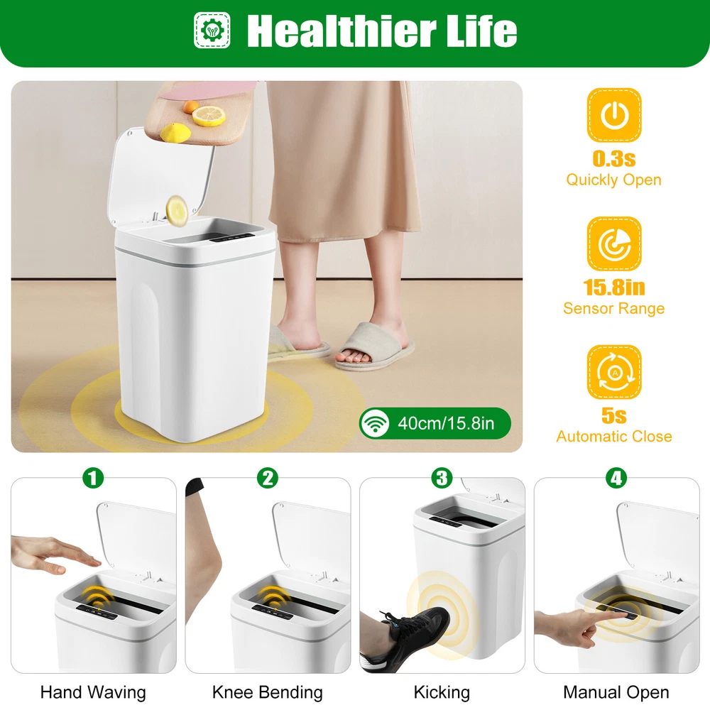 Description: Product Size: 215x205x340mm Weight:0.9kg Product Capacity: 16L Product Battery(Not Included): 4Pcs AA batteries (not included) Product Material: ABS Plastic + PP Material Product Sensing: Infrared Sensing Colour:White Package Included: 1 * Trash Can Note: 1.If you have any problems or concerns, please contact us. 2.Please allow 1-3cm measuring deviation due to manual measurement.Thanks for your understanding. 3.Monitors are not calibrated same, item colour displayed in photos may be showing slightly different from the real object. Please take the real one as standard. Automatic Smart Sensor Trash Bin 16L Kitchen Sealed Trash Bin Office Trash Bin Bathroom Trash Can Touchless 4.22 Gallon Automatic Motion Sensor Smart Trash Can Features: -Sealed design, lock odor. -Automatic opening and closing. Smart chip. Mute ramp down. -Detect every movement accurately. Zero point three Second infrared sensing. -intelligence and control. The sealing design has no peculiar smell. Wave sensing. -0.3S Automatic cover opening. 16L increase capacity. Normally open + inductive dual mode. -The intelligent induction trash can be opened and closed without touching by hand, making it convenient and simple to throw garbage. -Press the normally open button once and the cover will always open. -16 large capacity, which can be used by many people at the same time. It is suitable for kitchen, bedroom, bathroom, living room and balcony. -When the battery is exhausted and there is no replacement battery, it can be opened manually under no power condition. Description: Product Size: 215x205x340mm Weight:0.9kg Product Capacity: 16L Product Battery(Not Included): 4Pcs AA batteries (not included) Product Material: ABS Plastic + PP Material Product Sensing: Infrared Sensing Colour:White Package Included: 1 * Trash Can Note: 1.If you have any problems or concerns, please contact us. 2.Please allow 1-3cm measuring deviation due to manual measurement.Thanks for your understanding. 3.Monitors are not calibrated same, item colour displayed in photos may be showing slightly different from the real object. Please take the real one as standard. Payment Delivery details Terms of sales About us Contact us Payment We accept ebay payment 。 Fees such as import duties, taxes are not included in the item price or shipping costs. These charges are the buyer's responsibility. Delivery details Shipping: 2-9 working days to: USA Terms of sales We maintain high standards of excellence and strive for hundred percent customer satisfaction. Feedback is very important to us. We hope that you contact us immediately before you give neutral or negative feedback, so that we can address your concerns. It is impossible to address issues if we do not know about them! About us Your satis faction is our ultimate goal. We work hard to earn your trust and future business. Our certified technicians have tested each item before shipping. The unit comes with 1 year limited warranty on all manufacturing defects. a) If you receive a defective item, you may return it or ask for a discount. Please contact us within 14 days after you receive the package. b) What you returned must be intact and in its original packaging as re? u. Customer is responsible for shipping costs of the returned item. c) We will cover the cost of shipping back t with the shipping rate indicated in the registration page. We will send you a new unit or refund the full payment you paid. Thank you. Contact us Business Hour Business Hour: Monday To Friday: 8:30 AM to 5:00 PM (Beijing China time) Due to time zones, our reply to your questions may not be immediately. But within above working time, we will reply your email within 24 hours. If it's non-workdays, please kindly be patient and wait till Monday. Please contact us with ebay message. Please feel free to contact us if you have any questions. Monday To Friday: 8:30 AM to 5:00 PM (Beijing China time) Due to time zones, our reply to your questions may not be immediately. But within above working time, we will reply your email within 24 hours. If it's non-workdays, please kindly be patient and wait till Monday. Please contact us with ebay message. Please feel free to contact us if you have any questions. Item Height 13.38" Item Length 8.46" Item Width 8.07" Material Plastic Capacity 16 L Brand Unbranded Type Trash Can Room Any Room Features Automatic Style Modern Colour White MPN does not apply