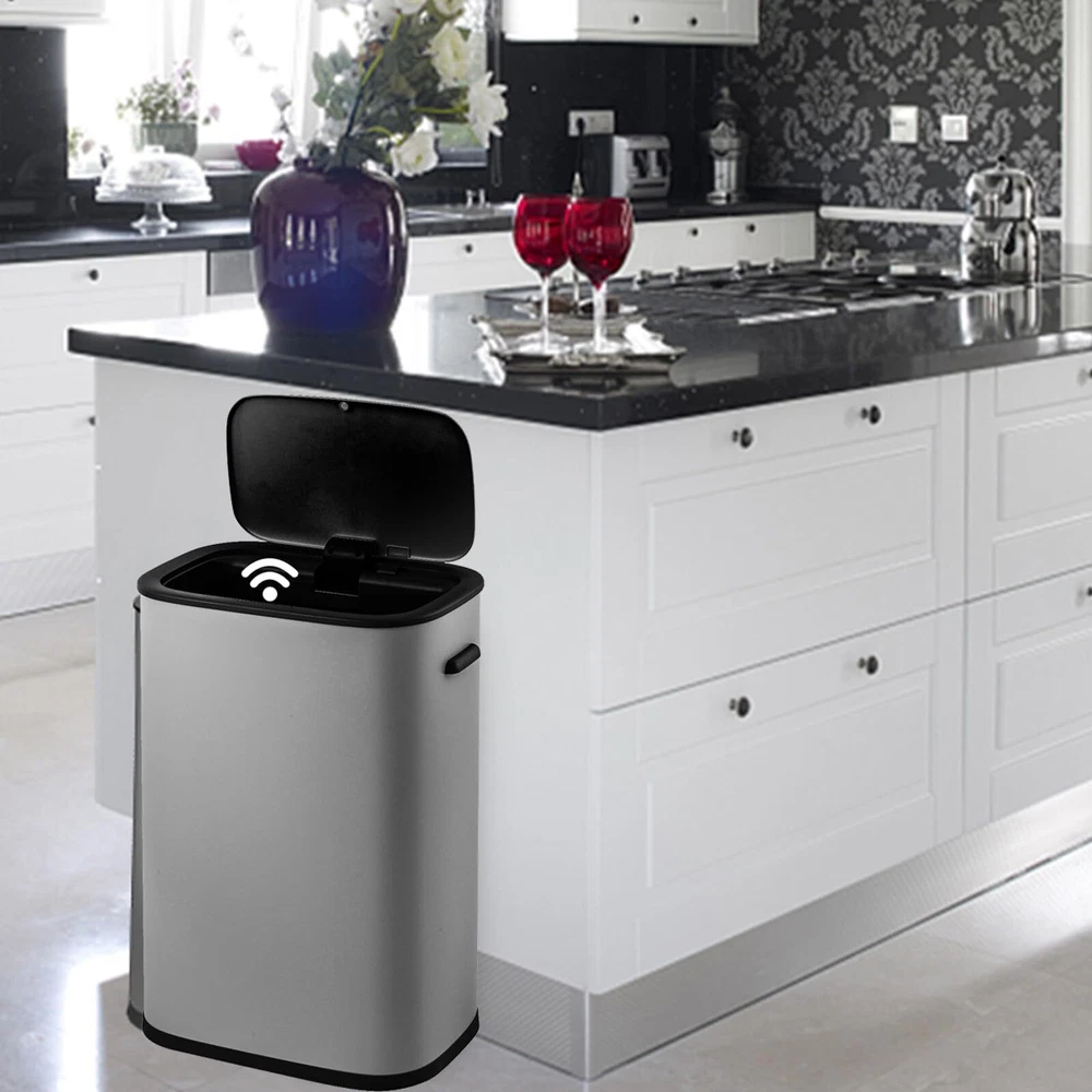 The automatic trash can is made of excellent plastic materials such as ABS+PP, durable and easy to clean. The touchless trash can used high technology induction device, it can respond quickly to open the lid of the trash can, and automatically close the lid within 6 seconds. The 14.5 Gallon (equal to 55 Liter) capability garbage bin can absolutely meet your daily need. Suitable for kitchen, living room, bedroom, and office or other various occasion. Touchless Trash Can: Our motion sensor trash can features an advanced automatic motion sensor that opens the lid automatically and closes it after 5 seconds of inactivity. Zero contact, free your hands. Manual Operation: This stainless steel trash can can also be manually operated to open the lid. If you need to keep the trash can open for a long time, you can manually press the button on the lid, and then close it manually after use. Durable and Long-lasting: Made from high-quality stainless steel, this kitchen garbage can will hold up against scratches, dents, and other wear and tear, resist damage from moisture, making it ideal for use in kitchen and bathroom. Easy to Use: The lid of the induction trash can is removable for putting in and taking out the garbage bags. The detachable bucket ring can fix the trash bag and prevent it from slipping easily due to the load. Battery Operated Trash Can: Please install the battery before using this sensor automatic trash can. The electric lid is powered by 4 AA batteries (not included). No need to worry about cords or outlets, it can be flexibly placed in kitchen, bedroom, bathroom and office.