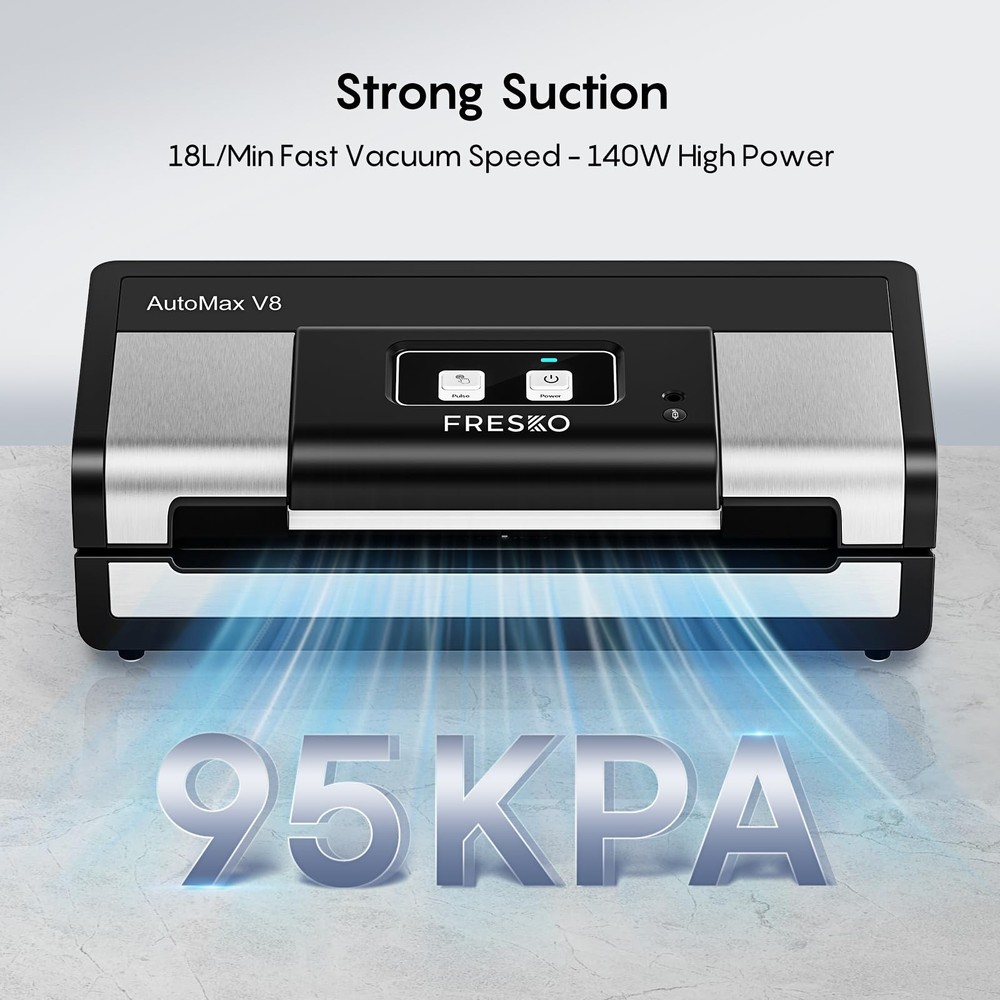 Automatic Food Vacuum Sealer Machine - designed to maximize freshness and minimize waste with ease! Experience effortless food preservation with our Food Sealer Vacuum Sealer, designed for both convenience and superior performance. This fully automated home or commercial vacuum sealer features smart humidity and bag detection, allowing you to seal various foods with ease. With dual sealing modes specifically designed for dry and moist foods, our vacuum bag sealer provides versatile options to keep your food fresh longer. Boasting a powerful 18L/min suction rate, this vacuum food storage machine can continuously seal up to 50 bags within just 20 minutes, ideal for bulk sealing. Custom-sized bags are easily made with the built-in roll storage and integrated cutter, allowing you to create the perfect fit for every item you seal. For easy and thorough cleaning, the kitchen vacuum sealer includes a removable, full-water-sensing vacuum display, ensuring no spills or mess remain inside the sealer. The added Pulse and External Vacuum functions offer extended usability for delicate items or larger storage bags! WHY CHOOSE AUTOMATIC BAG SEALER? Superior Quality Fully Automatic Operation Automatic Humidity Automatic Bag Detection Airtight Secure Seal Boosts High Suction Power of 18L/min Perfect for Big Meal-prepping Sessions Built-In Roll Storage & Cutter Removable Vacuum Chamber Full Water-Sensing Display Pulse & External Vacuum Functions Guaranteed Satisfaction PACKAGE INCLUDES 1 X Food Vacuum Seal Machine 1 X Foam Gasket 2 X Roll Bags (8" x 20' and 11" x 20') 1 X External Vacuum Accessories 1 X Manual So why wait? Add this wet dry vacuum sealer to your basket and start preserving your food effortlessly! 【Effortless Operation】'Vacuum & Seal' mode (no button needed): Place the bag opening under the Green baffle & close the lid; 'Seal' mode (no button needed): Red baffle & close the lid; 'Pulse' mode: Freely control the vacuum degree - ideal for easily - deformed food; 'External' mode: Vacuum jars, sous vide bags, containers or wine plug; Auto Locking system: One-handed lid opening & closing - no need for extra pressing 【Superior Performance/Inteligent Wet-Preservation】With powerful suction and exclusive sealing technology, our vacuum sealer effectively seals up to 50 bags continuously within 20 minutes. In automatic mode, the intelligent moisture lock technology allows the machine to seal immediately after detecting liquid, thereby better locking in the moisture of the ingredients 【Your Kitchen Essential】Made from food-grade materials, it is sturdy and durable, suitable for long-term use. It meets all your food storage needs, whether for dry foods, wet foods, marinated items, or storage containers.The wider heating strip provides a long-lasting seal, extending the storage time of food by up to 8 times 【Built-In Bag Cutter & Roll Storage】Our vacuum sealer has a built-in roll storage and can be used with the bag cutter to make plenty of pre-cut bags efficiently 【Fully Starter Kit】Includes food vacuum seal machine *1, foam gasket *1, rolls bags *2 (8” x 20’ & 11” x 20’), air suction hose * 1, external interface * 1, and user manual *1