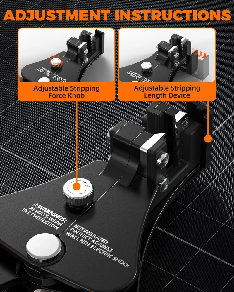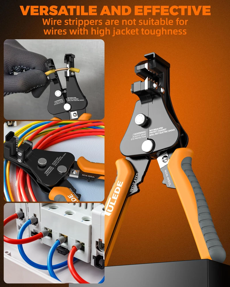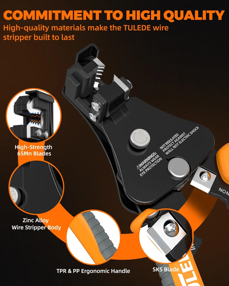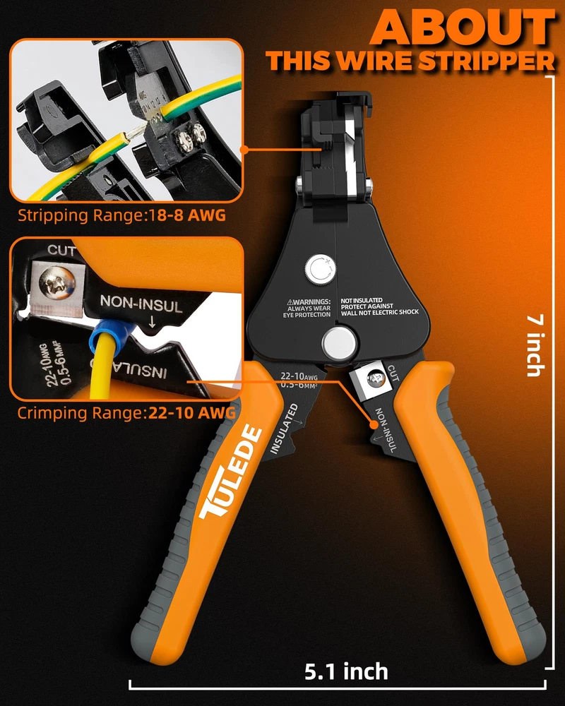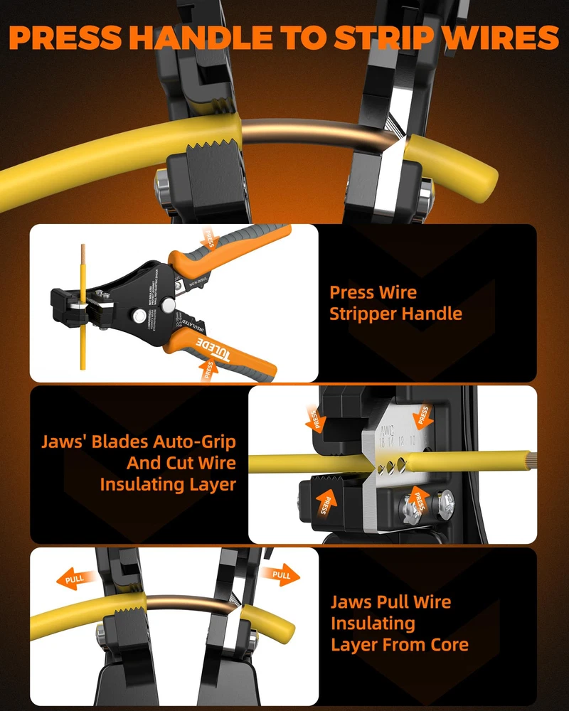 3 in 1 FUNCTION - This versatile tool offers wire stripping for 18-8 AWG, wire crimping for 22-10 AWG, and cutting copper, aluminum, sheathed core wire, and cable. Our automatic wire stripper and wire stripper tool is designed to handle multiple tasks with ease. DURABLE BODY - Made with high-strength alloy and 65Mn jaws, this tool features a surface treatment for corrosion resistance and long-lasting durability. This wire stripper and crimper is built to withstand tough conditions. INVISIBLE SPRING - Innovative spring design for quick self-opening action, saving effort and space. The self-adjusting wire stripper feature ensures smooth operation. EASY TO USE - Equipped with a stripping pressure knob and wire stopper, this tool allows for effortless grip and strip via a single-action squeezing motion. This auto wire stripper simplifies the process for you. PP&TPR HANDLE - Non-slip TPR & PP handles provide comfortable and ergonomic support for prolonged use. These electrical strippers are perfect for both professional and DIY applications, offering the best in grip and control. WIDELY USED - Perfect for electricians, DIY enthusiasts, industrial applications, and home use. Our wire stripper tool are ideal for various tasks, making them indispensable in your toolkit.