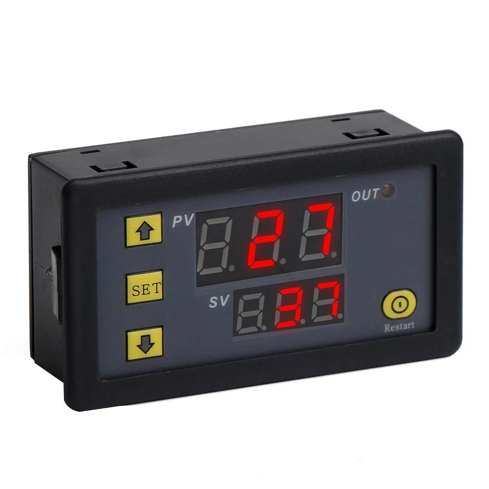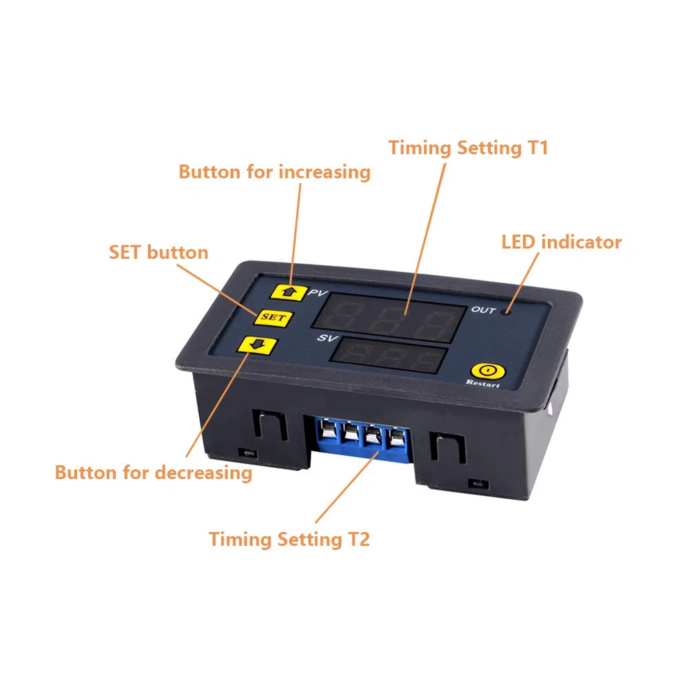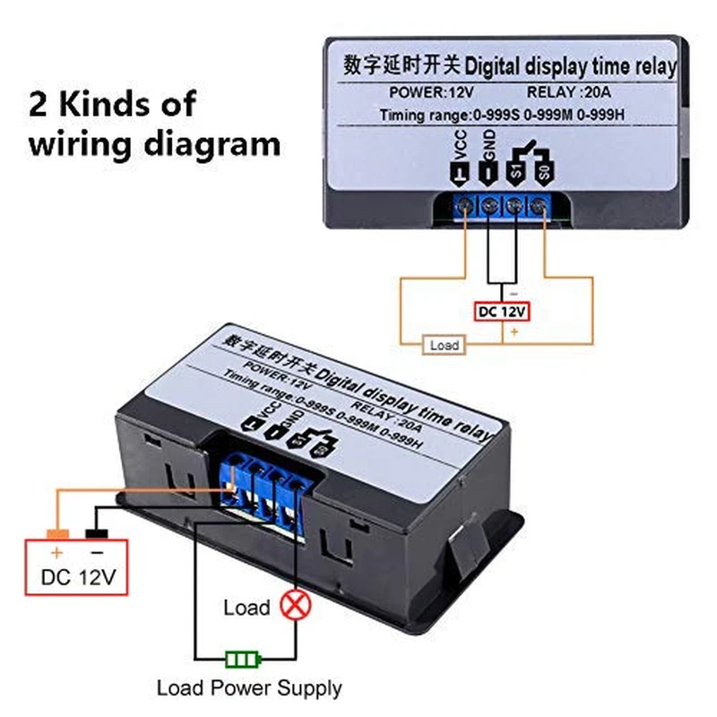Automotive Digital Timer Relay Board DC 12V 20A 1500W Relay Module with Dual ❃❃ Digital cycle timer delay module with time ranging from 1 second to 999 hours, available for various application.▲▲ (Notice: no out put Voltage) If you need the E-Manual or meet any other questions, pls contact us and we will send it to you!!! ❃❃ The time relay delay Dual display: Red readout for practical value(PV); Blue readout for set value(SV);79mm*43mm-display panel; 71mm*40mm*24mm-cut out size. ❃❃ Can be used in timing, delaying, cycle timing, intermittent timing, raft fishing machine, slow-down machine DIY, etc. ❃❃ This relay switch is four-terminal wiring and setting by buttons, easy and simple for everyone to use it. ❃❃ This 12V time delay relay can store the setting automatically. Please wait 6 seconds after finishing setting the data. The data set will be stored automatically after 6 seconds. Parameter: Timing Range: 0-999s,0-999m,0-999h Supply Voltage: DC 12V Installed Size: Approx.72*39*23mm(L*W*H) Power dissipation: <0.6W Maximum Power: Working current-20A(Max), Power-1500W(Max). Product Functions: Timing, Delaying, Time Cycling & etc. Application: 1: Used for timing, delay, cycle timing, intermittent timing and other occasions; 2: Used for raft fishing machine, slow-down machine; 3: Used for timer switch, timer alarm control panel. Features: Double LED displays, so you can set two timing time T1 and T2.It will very convenient to customers. Three timing time for choice: 0-999s,0-999min and 0-999h. You could set the timing mode as your requirement. Six operating modes for your choice. 3.78 inches x 4.61 inches x 1.3 inches. Weight: 1.41 oz Current Rating 20 Amps Mounting Type Panel Mount Color DC 12V Country of Origin China Connector Type Through Hole Contact Type Normally Open Contact Material Copper Alloy Or Silver Alloy Package Dimensions 4.61 x 3.78 x 1.3 inches; 1.41 ounces