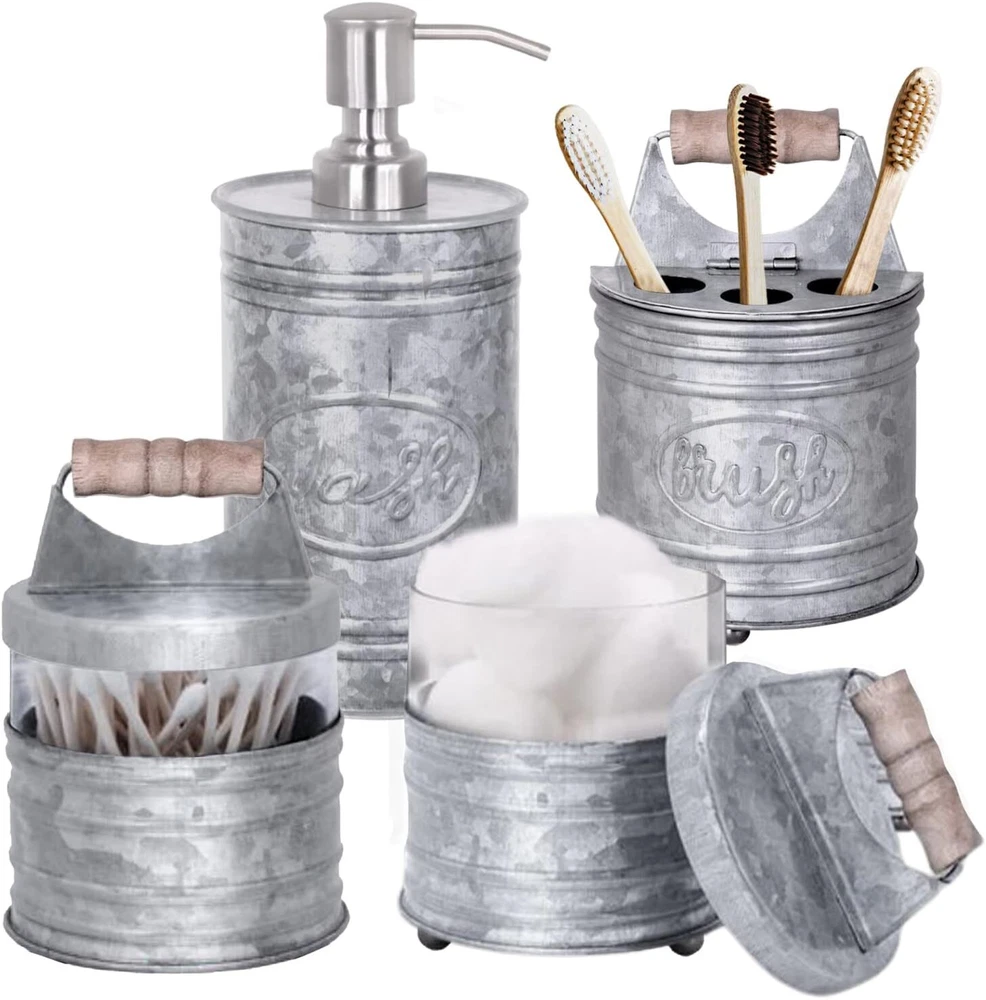Autumn Alley Rustic Bathroom Accessories Set 4 - Galvanized Soap Product Details Number of Pieces: 4 Finish Type: Glass,Metal,Wood Manufacturer: One World decor UPC06 Package Dimensions: 13.07 x 9.8 x 5.2 inches Item Weight: 2.73 pounds Item model number: BRS001 Finish types: Glass,Metal,Wood Batteries required: No Material: Wood, Glass, Metal Color: Galvanized Brand: Autumn Alley Style: Galvanized Included Components: Farmhouse Soap Dspenser, Farmhouse Bathroom Jars X 2, Farmhouse Toothbrush Holder 【4-Piece Deluxe Rustic Bathroom Accessories Set】Elevate your farmhouse bathroom decor with 4 UNIQUE, galvanized beauties: 1x Liquid Rustic Soap Dispenser, 1x Toothbrush/Make-Up Brush Holder, 2x Cutely Topped Canister Jars for q-tip swabs, buds, cotton balls, cosmetic pads. 【Delightful Rustic Farmhouse Decor】Our bathroom themed decor sets boast beautifully metallic finishes, pretty lids with cute ball handles, eye-catching “Brush”/“Wash” labels and little ball feet (on 2 containers) in a fun bathroom countertop set, adding tons of vintage charm to any vanity shelf/sink. 【Handy & Easy-To-Use Around The House】Don’t let the restroom door stop you! Infuse sweetheart farmhouse touches everywhere: worktops, tabletops, counters, shelves. Our vintage farmhouse decor set's chic, durable versatility fits household kitchens, bedrooms, or home offices. The perfect Rustic house decor! 【Excellent Bathroom Accessories Farmhouse Style】Impeccably coated against corrosion or humidity damage, this set for bathroom accessories helps to keep small toiletry/ items, brushes, and lotions, organized, clean, and in tip-top shape.