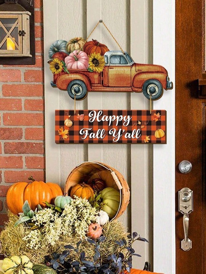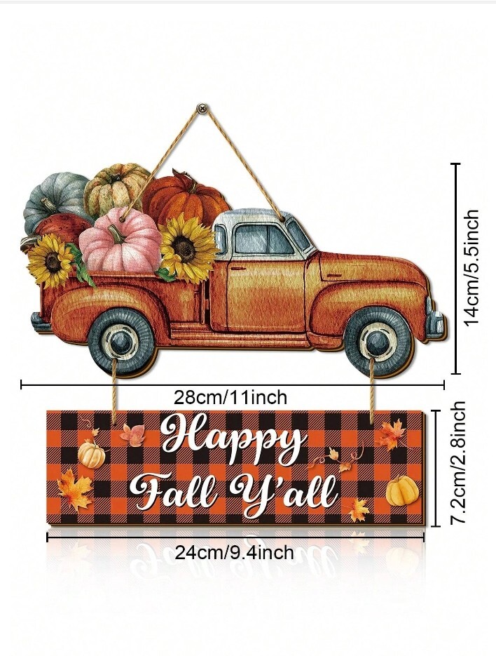 Add a touch of rustic charm to your home with this wooden hanging sign. Featuring a truck design with a pumpkin character, this medium-sized sign is perfect for any room in your house. The multicolor paint finish gives it a farmhouse-style look that's perfect for the fall harvest season. Crafted from high-quality wood, this sign is durable and ready to hang both indoors and outdoors. Measuring 8.5 inches in height and 11 inches in width, it's the perfect size for any wall. Whether you're looking to decorate your living room, kitchen, or laundry room, this sign is a great addition to your home.