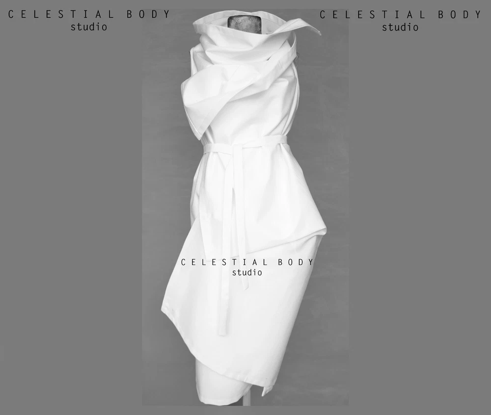 Futuristic turtleneck sleeveless jacket. Deconstructed dress. Asymmetrical black vest. Gothic Japanese avant-garde jacket. Avant-garde deconstructed sleeveless jacket. Made of dense structured cotton fabric, fastens with two buttons, open in the front (you can wear it as a jacket or vest). This dress is very futuristic and structured. Matches perfectly with any of CELESTIAL BODY piece. With skinny jeans, skirt, dress or pants... it will look cool. You may wear this piece on top of anything: a T-shirt, thin jumper, long-sleeve, sweatshirt, or dress or just wear it by itself and have a different look everyday. ITEM DETAILS: - Asymmetrical cut - Available sizes: XS, S, M - Material: 100% cotton - Comes with the cotton belt - 2 buttons fastening - Open in the front - Have NO pockets - Care: dry clean only - The vest is unlined - Hand made item. Made to order -The item is photographed to show the actual color as close as possible, your monitor settings may present it differently CELESTIAL BODY s t u d i o SIZE CHART Double check every size and do not hesitate to ask us anything. We will answer your questions, assist you, and send you additional pictures if needed If you are between the sizes, please contact us Model's parameters: bust 88cm / 34", waist 60cm / 23", hips 88cm / 34", height 173cm / 5'7" Model wears size XS All standard sizes are made for height of about 170 cm / 5'7 '' We can customize the length according to your height with no extra charge, please leave your personalizations with your order Size XS fits figure with this measurements: Bust: 85-90cm / 33.5-35.5" Waist: 55-60cm / 22-23.5" Hips: 85-90cm / 33.5-35.5" Size S fits figure with this measurements: Bust: 90-92cm / 35.5-36.5" Waist: 60-70cm / 23.5-27.5" Hips: 90-95cm / 35.5-37.5" Size M fits figure with this measurements: Bust: 92-96cm / 36.5-38" Waist: 70-80cm / 27.5-31.5" Hips: 95-100cm / 37.5-39.5" Size L fits figure with this measurements: Bust: 96-105cm / 38-41.5" Waist: 80-90cm / 31.5-35.5" Hips: 100-107cm / 39.5-42" Photos show the actual color as close as possible, your monitor settings may present it differently Each piece is individually cut and sewn by order, especially for you. Handmade, quality items take time, please let 3-5 days for your order to be made Enjoy your shopping! SHIPPING We ship with registered airmail from Ukraine, the delivery time is 10-28 business days. Express shipping is available for an extra fee, please contact us before placing the order for details.