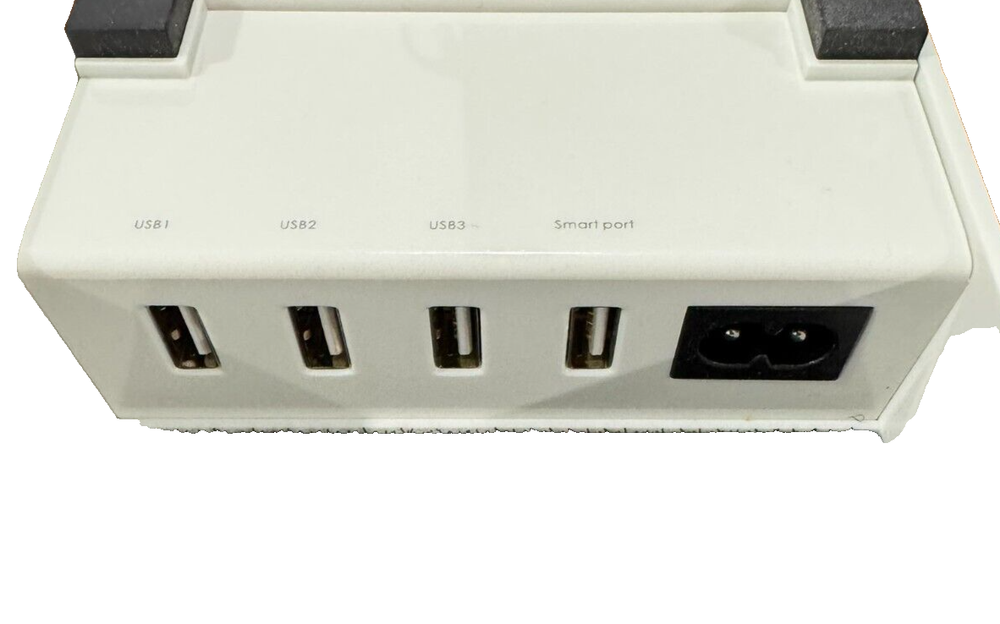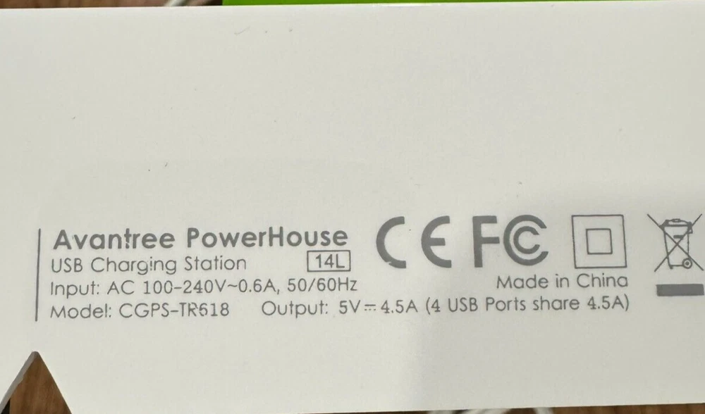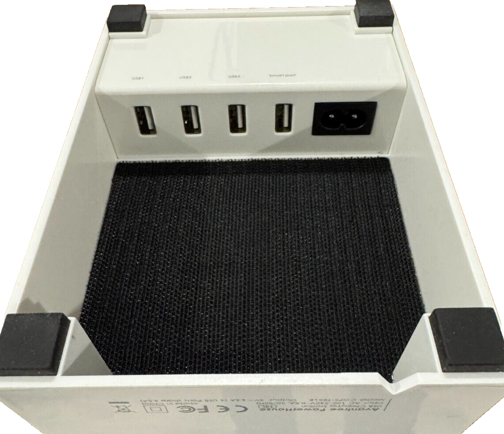 Avantree Desktop Charging Station 4 Devices Fast Power House CGPS-TR618 is a black plastic housing with a folio design, featuring 4 charging stations with a 5 ft USB cable for fast charging. It is compatible with various brands including Apple, Android, Samsung, ASUS, and Amazon devices, and has a magnetic wireless charging standard. It is designed for universal compatibility and has a grip mounting type for convenient desktop use.