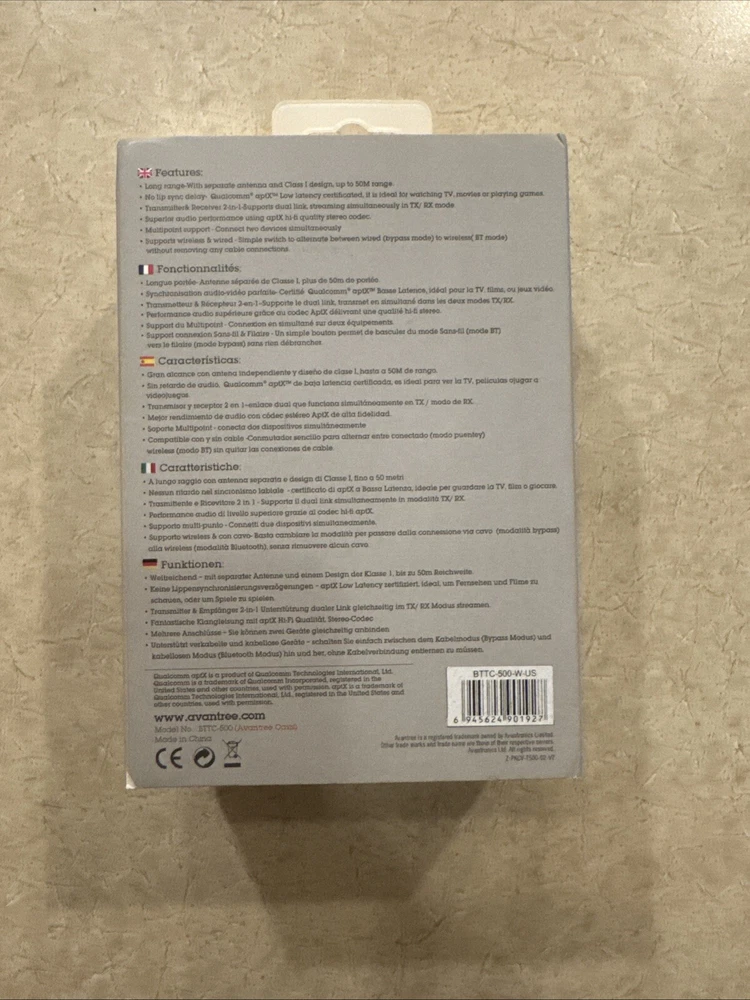 The Avantree BTTC-500-W-US is a dual-band Bluetooth transmitter receiver with a long range and low latency. It is designed for audio receivers and features Bluetooth v4.0 connectivity with a 3.5mm Jack port. This multicolor device is suitable for home networking and connectivity, providing USB Bluetooth capabilities.