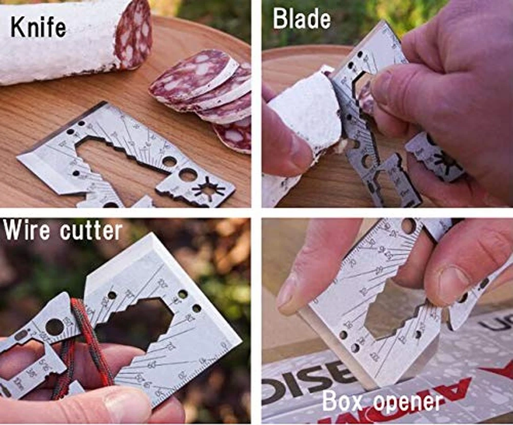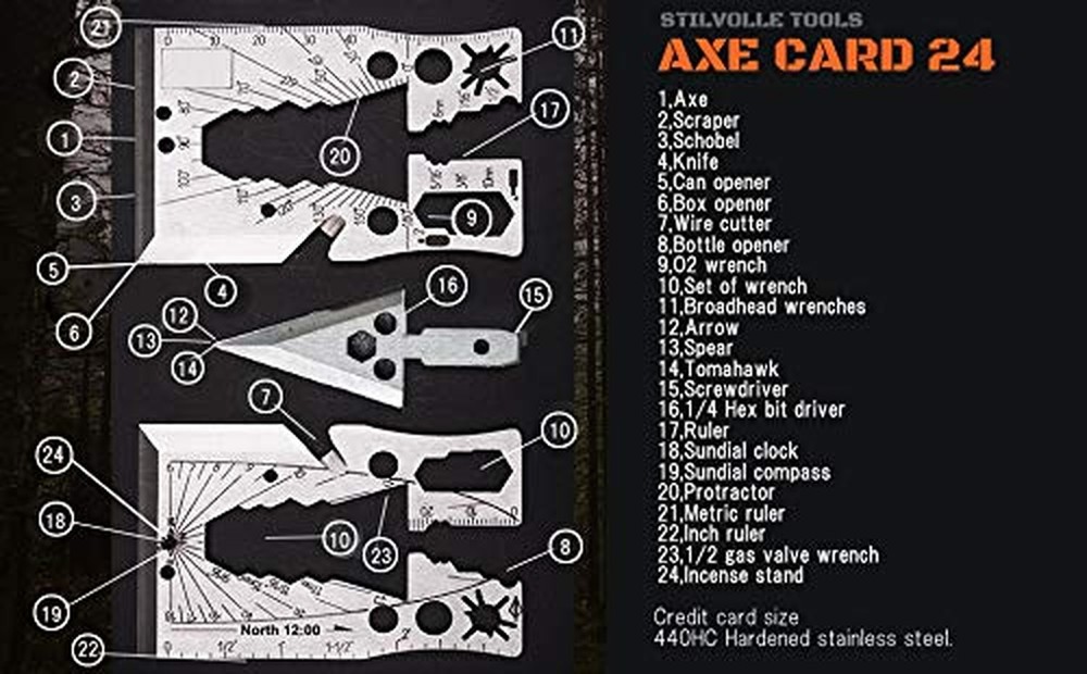Axe Card 24 Credit Card Type with 24 Functions Multi Tool Case Include Tools That can be Used for Emergency Escape and disasters Product Details Color: Titanium Gray Brand: Stilvolle tools MPN: UK-04B00 EAN: 4589786771145 UPC: Does not apply Color: Titanium Gray Material: Stainless Steel, Titanium Brand: Stilvolle tools Item dimensions L x W x H: 3.35 x 2.17 x 0.08 inches Included Components: Axe Color: Titanium Gray Material: Stainless Steel, Titanium Brand: Stilvolle tools Item dimensions L x W x H: 3.35 x 2.17 x 0.08 inches Included Components: Axe Number of Pieces: 12 Folded Size: Width: 2.17 inches, Height: 0.08 inches, Length: 3.35 inches Manufacturer: ATPC Japan Item Package Dimensions L x W x H: 3.74 x 2.52 x 0.28 inches Package Weight: 0.05 Kilograms Item Dimensions LxWxH: 3.35 x 2.17 x 0.08 inches Brand Name: Stilvolle tools Suggested Users: Unisex Part Number: UK-04B00 Style: camper Sport Type: Camping & Hiking Skill Level: Beginner Date First Available: May 28, 2019 Product Description: Card Survival Ax Multi tool Equipped functions: ax, scraper, excavator, knife, can opener, box opener, cord cutter, corkscrew, O2 wrench, wrench set, broadhead wrench, arrow, spear, tomahawk, screwdriver 1/4 hexagonal screwdriver, ruler , Sundial, solar compass, protractor, ruler, inch ruler, 1/2 gas valve wrench, incense stand Size: Credit card size (width 2.17 x length 3.35 x thickness 0.08 inch) Weight: 1.83 ounces Material: 440HC hardened stainless steel Includes: Ax card 24, black leather storage case Tools available for emergency, disaster, emergency escape In order to preserve excellent functions even under harsh environments, 24 kinds of functions are mounted in a size that can be carried at all times while using hardened stainless steel excellent in durability. Product name: Ax card 24 Product number: UK - 04B Color Variation: Silver Number of installed functions: 24 Equipped with: axe, scraper, excavator, knife, can opener, box opener, cord cutter, corkscrew, O2 wrench, wrench set, broad head wrench, arrow, spear, tomahawk, screwdriver 1/4 hexagonal screwdriver, Ruler, sundial, sun compass, protractor, ruler, inch ruler, 1/2 gas valve wrench, incense stand Product Description: Card × Survival · Axe × Multi tool A new Ax card featuring 24 functions in credit card size appeared! A definitive edition of survival multi tool that is always worn. Aggregate functions equivalent to or more than regular multi tool into credit card size Just put a handle on this card, you can use the blade part as an ax. Of course, you can use it as a knife, scraper, shovel can opener, box opener if you do not put on the handle. Arrowheads can make arrows and spears and hunting is possible. You can also use a cord cutter to cut ropes to make axes. In addition, wrench, bottle opener, driver, ruler, sundial and sun compass etc are also installed. STILVOLLE TOOLS In STILVOLLE TOOLS, Axe multil tool, survival card 12, survival dog tag 5 are sold separately as another lineup. lineup Ax nine (sold separately) Survival card 12 (sold separately) Survival dog tag 5 (sold separately)