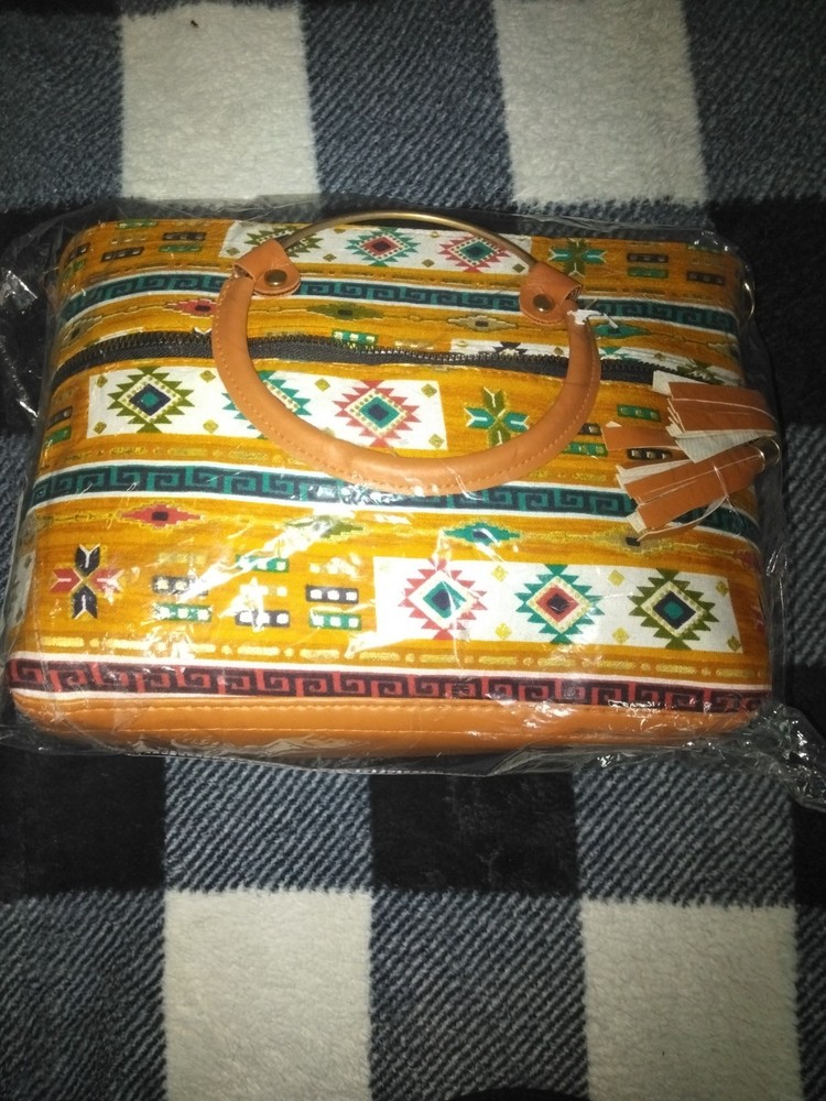 This Aztec Purse is brand new and has never been used, making it a unique and stylish addition to any woman's collection. The geometric Aztec pattern adds a touch of authenticity to the design, while the multicolor handle/strap adds a playful element. The fabric lining in brown complements the overall Aztec theme, making this crossbody purse a standout accessory for any outfit.