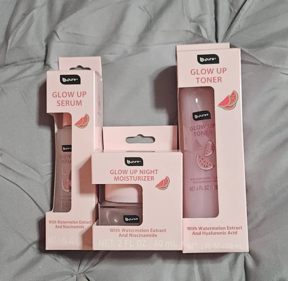 3 Pc B Pure Glow Up Toner, Serum & Moisturizer With Watermelon Extract BNIB ☆B Pure Glow Up Night Moisturizer 2fl oz BNIB •With Watermelon extract and hyaluronic acid • This replenishing moisturizer is enriched with fruit and Niacinamide to strengthen & and improve the natural barrier of the skin. • Improves skin texture & gives your complexion a boost of radiance. • SKIN CONCERN - Works Best for Dry Skin, Balanced Skin, Sensitive Skin & Combination Skin. • Solutions for dryness, irritation, fine lines & wrinkles , and uneven texture. • Niacinamide strengthens the skin’s lipid barrier and improves skin texture BNIB ☆ B Pure Glow Up Serum 1fl oz BNIB - Ingredients - Ceramides, Vegan, Antioxidants. •Perfect for sensitive skin, minerals organic, fruit extracts. • Organic , naturally formulated. • Perfet For All Skin Types- Enzyme Based , PH Balancing. • Sulfate Free, Alcohol Free, Aluminum Free, Chemical Free, Paraben Free BNIB ☆B Pure Glow Up Toner 4fl oz BNIB • With Niacinamide, hyaluronic acid, and AHA'S • a unisex toner that contains hyaluronic acid and is suitable for all skin types. It has a 6-month expiration date after opening and does not contain SPF. •Allegedly similar to Glow Recipe's toner #bpure #glowup #glowupmoisturizer #glowuptoner #glowupserum #watermelonextract #hyaluronicacid #toner #serum #moisturizer