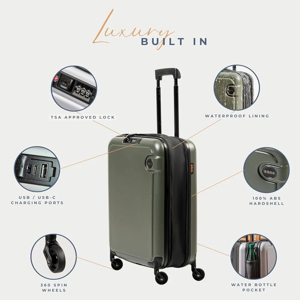 Unfolding your next adventure is more than just a tagline for us. It represents our commitment to providing you with a travel companion that enhances your exploration, inspires your curiosity, and simplifies your travel experience. Enabling effortless travel with innovation and convenience, BÄRA sets a new standard in lightweight TSA approved carry ons. Our mission is to enhance your journey by providing a versatile travel companion equipped with a built-in USB charging port with both USB and USB-C chargers, water bottle holder, 360-degree spinning wheels, and secure locking mechanism. Elevate your travel experience with the BÄRA Travel Set, a comprehensive solution designed to streamline your journey. This all-in-one set includes a Hardshell Collapsible 20 Inch Carry On Luggage, essential Packing Cubes, and a versatile Toiletry Bag, providing you with everything you need for organized and stress-free travel. The Hardshell Collapsible Carry On Luggage offers both durability and convenience, crafted from 100% ABS hardshell material to protect your belongings while featuring a collapsible design for easy storage. Maneuver through airports effortlessly with the 360° Spinner Wheels and height adjustable telescopic handle, ensuring smooth mobility from check-in to boarding. The included Packing Cubes are meticulously designed to maximize suitcase space and keep your belongings neatly organized, while the TSA Approved Toiletry Bag offers convenient storage for your essential toiletries with features like a built-in hook for hanging and multiple mesh pockets. Whether you're embarking on a weekend getaway or a long-haul journey, the BÄRA Travel Set provides the perfect combination of functionality, durability, and style to enhance your travel experience.