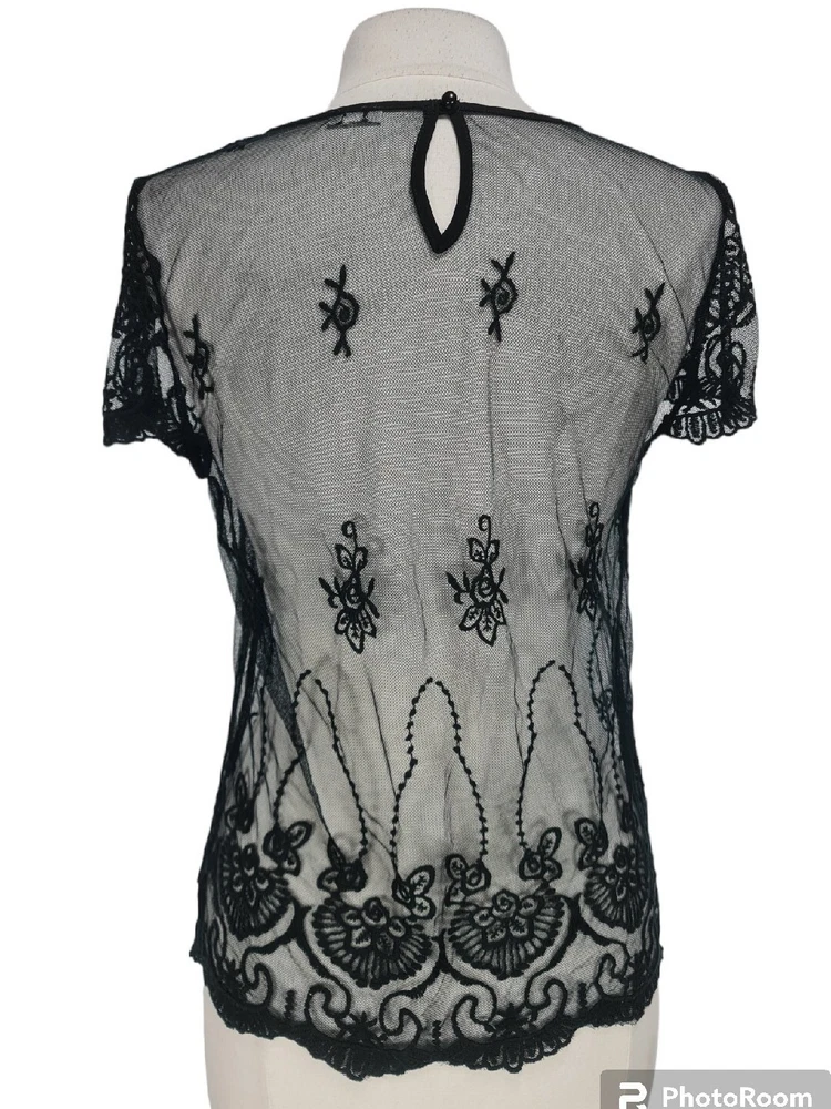 Country/Region of Manufacture: China gtin13: NA Size: M Type: Blouse Strap Type: NA Personalize: No Vintage: No Accents: NA Sleeve Length: Short Sleeve Style: Basic Sleeve Type: Casual Sleeve Pattern: Floral Features: Stretch Color: Black Season: Fall, Spring, Summer Theme: NA Brand: B envied Garment Care: Machine Washable Fabric Type: Mesh Fit: Regular UPC: NA Character: NA Department: Women Material: Polyester Closure: Pullover Handmade: No Neckline: Crew Neck Occasion: Casual Size Type: Regular